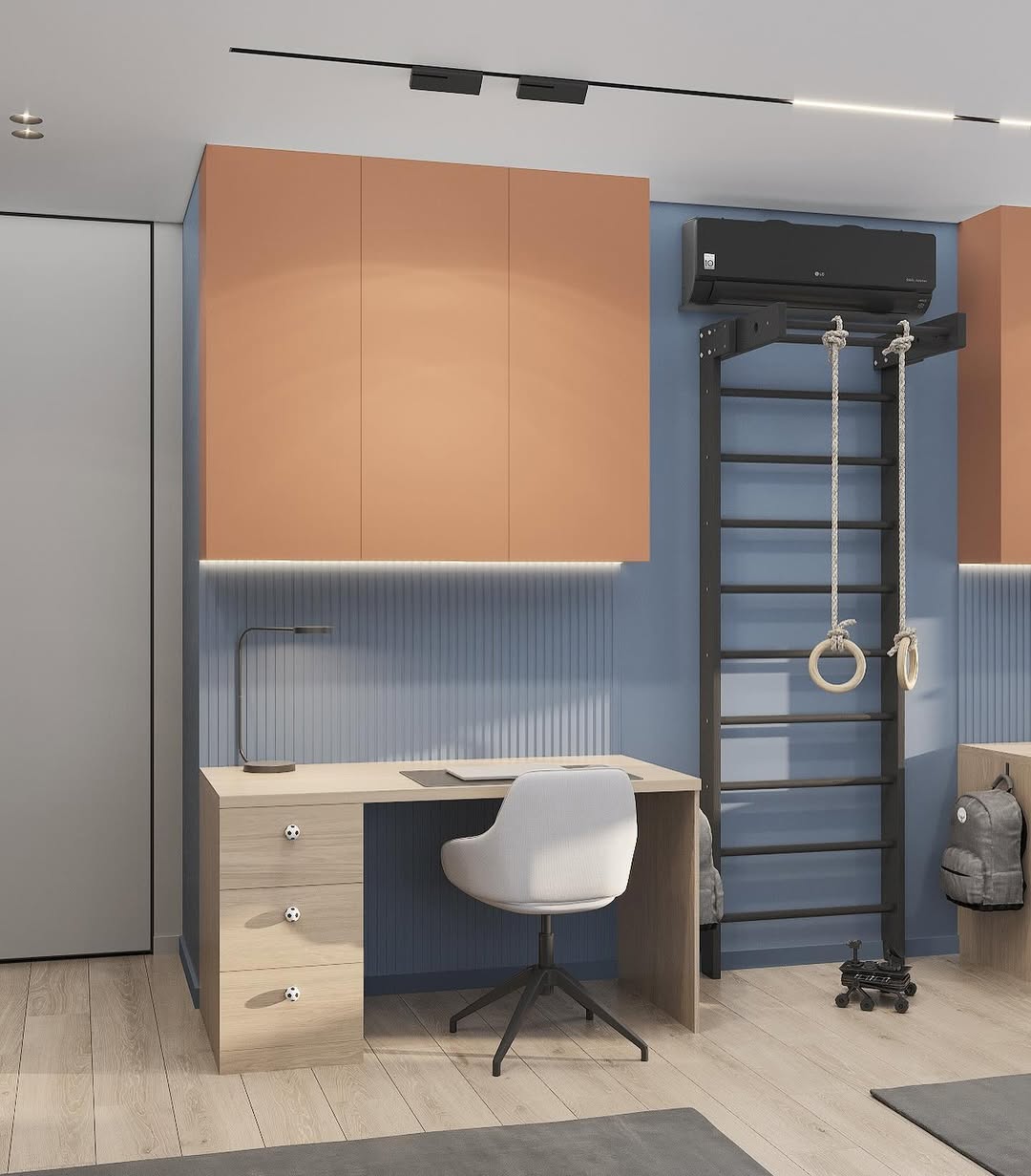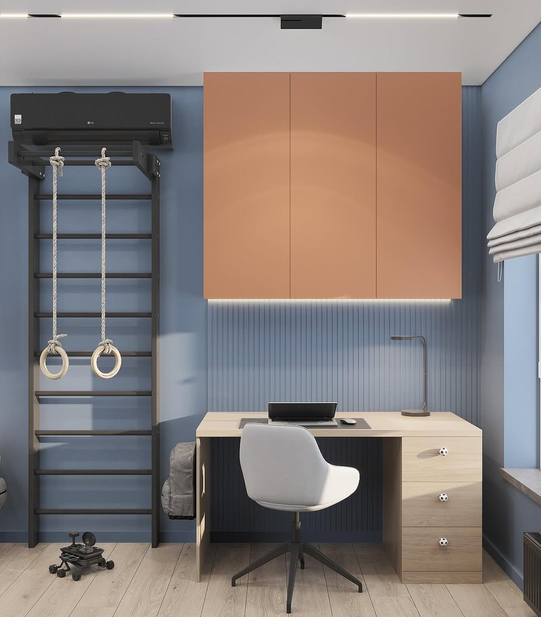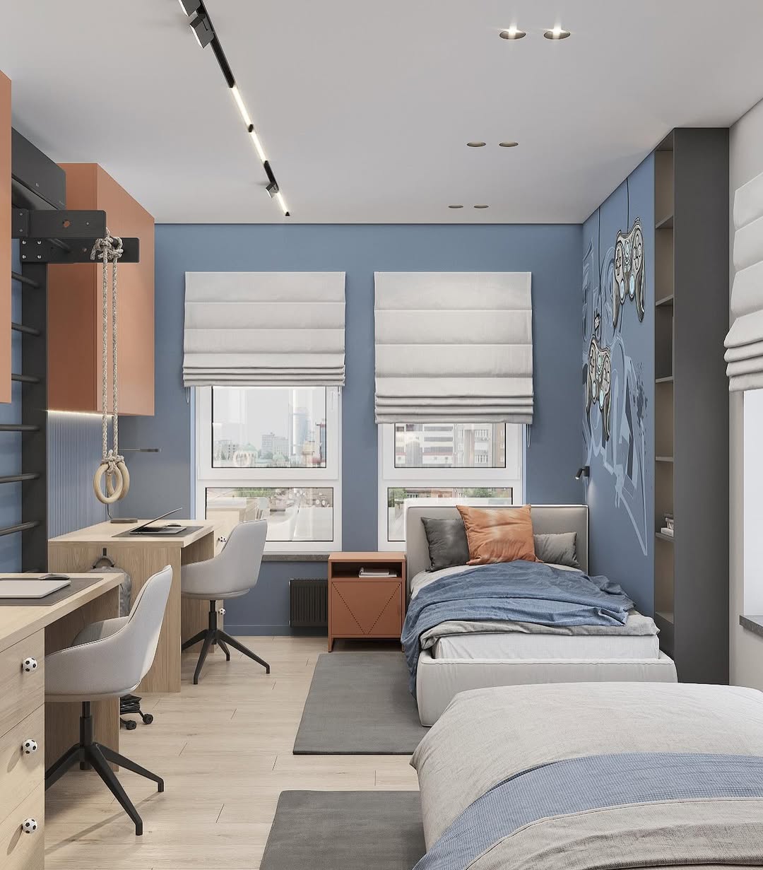 Детская комната площадью 19 м² для двух мальчиков-школьников. В этой детской дизайнер учел такие моменты, как: