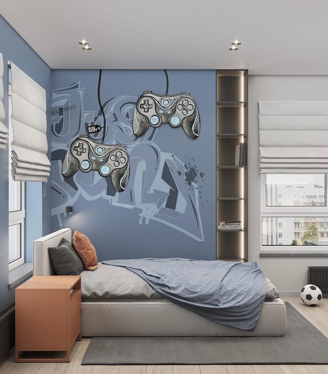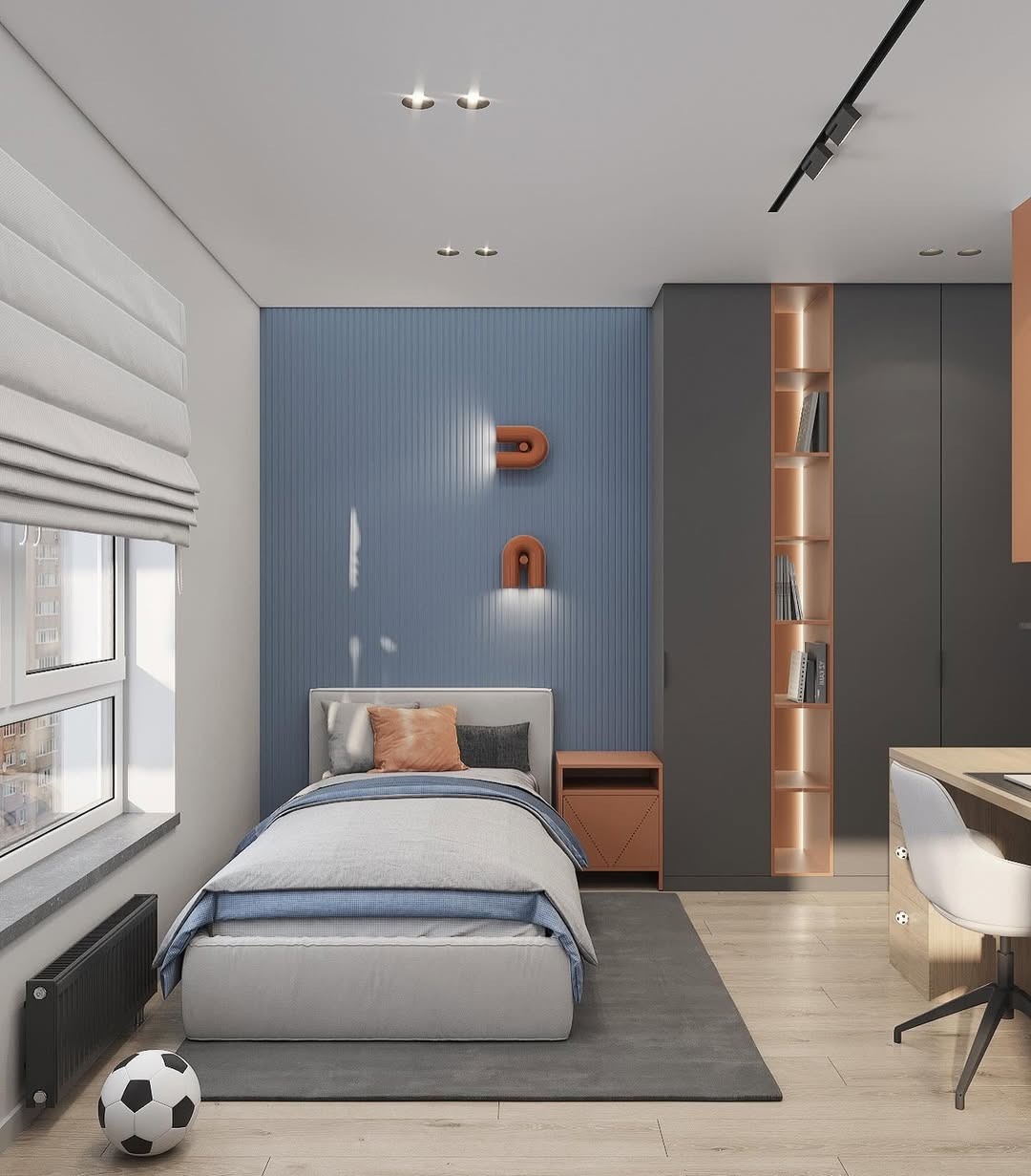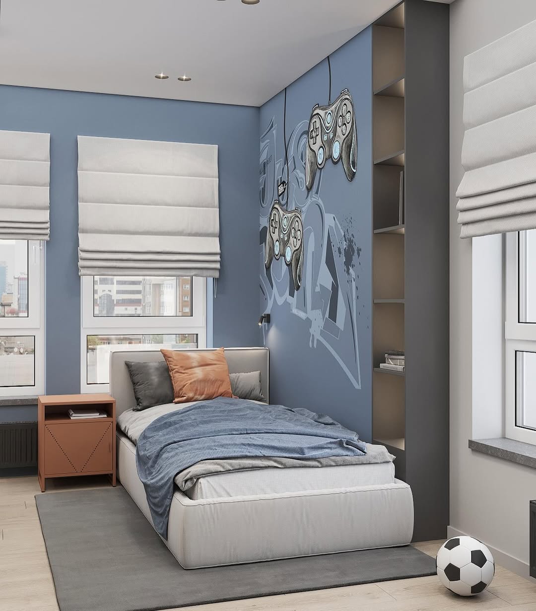Детская комната площадью 19 м² для двух мальчиков-школьников. В этой детской дизайнер учел такие моменты, как: