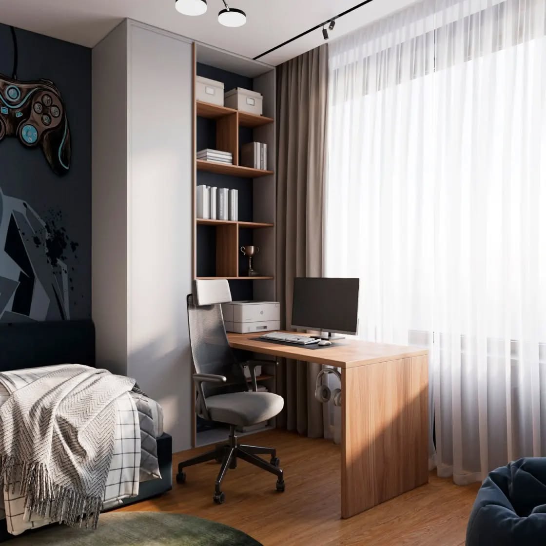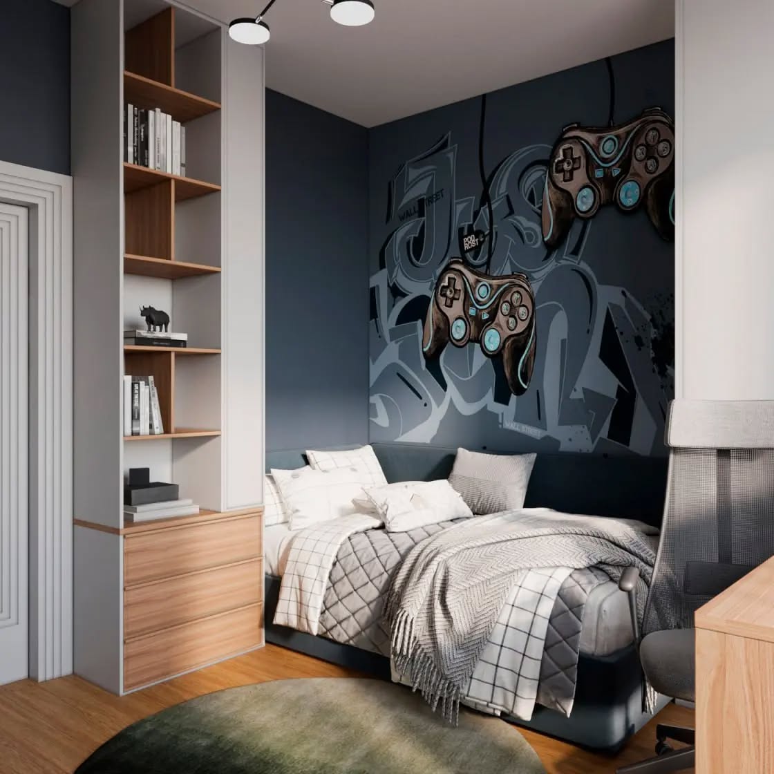 Драйвовое настроение передают не только сами автомобильные, спортивные и игровые образы, но и стиль: граффити и компьютерная графика подчеркивают, что хозяин комнаты – молодой и современный человек.