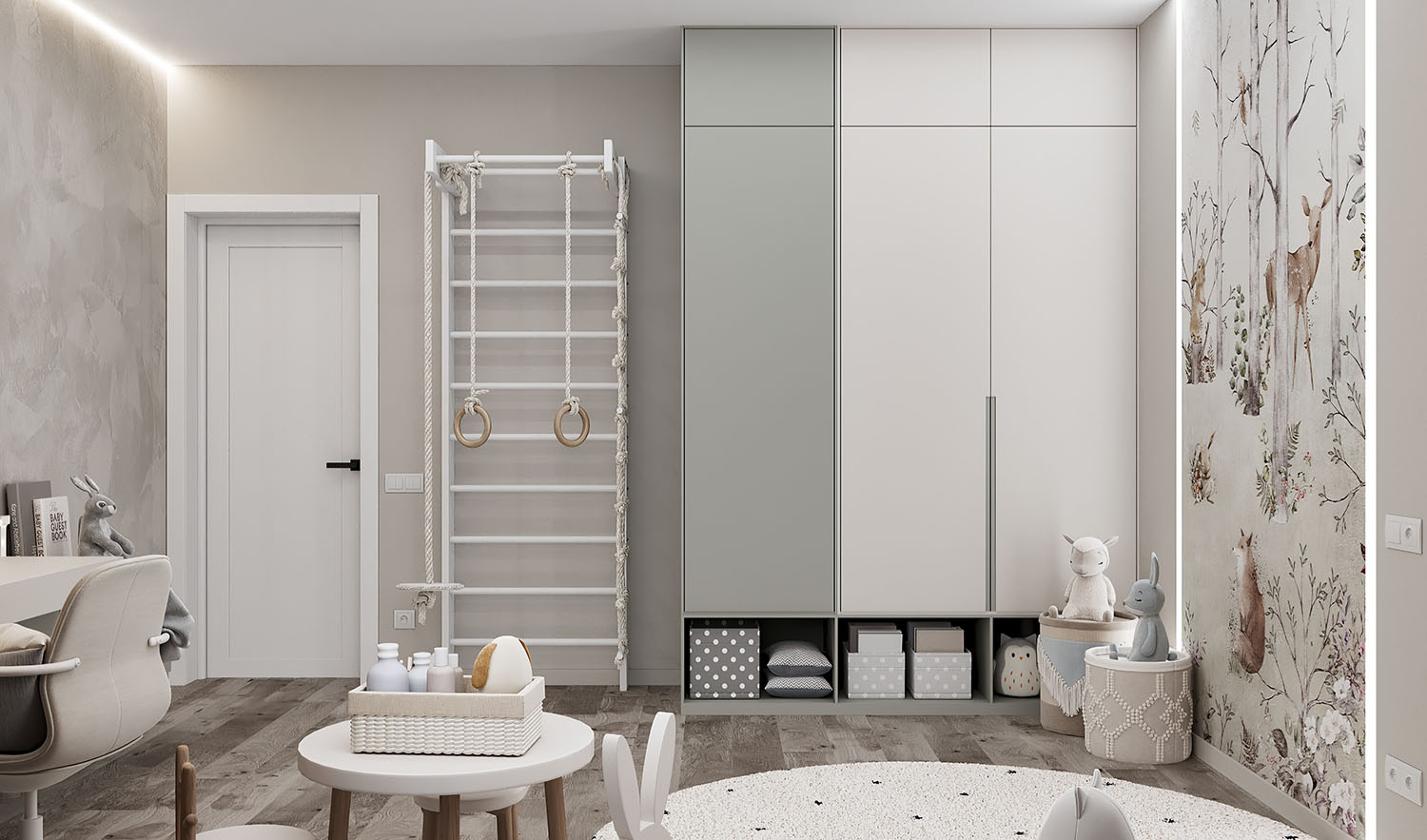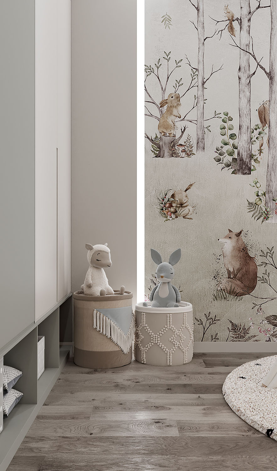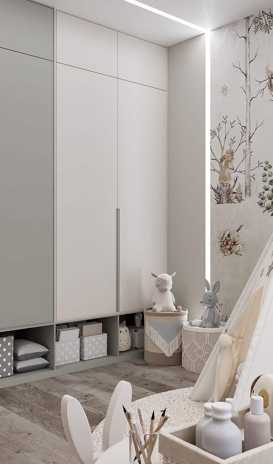 На площадях 18 м² расположились две детские со спальными местами, а также игровая площадью 16 м². Использованные коллекции идеально подошли под все пожелания заказчика и совсем скоро будут радовать своей красотой трех девочек.