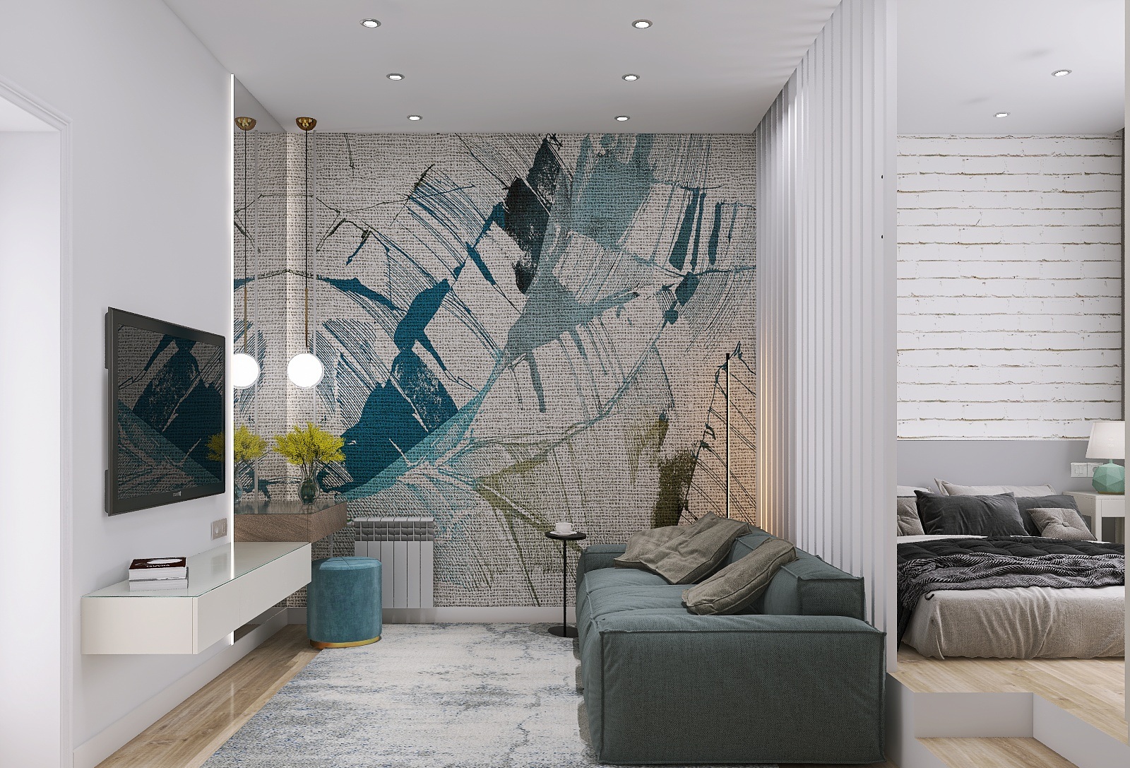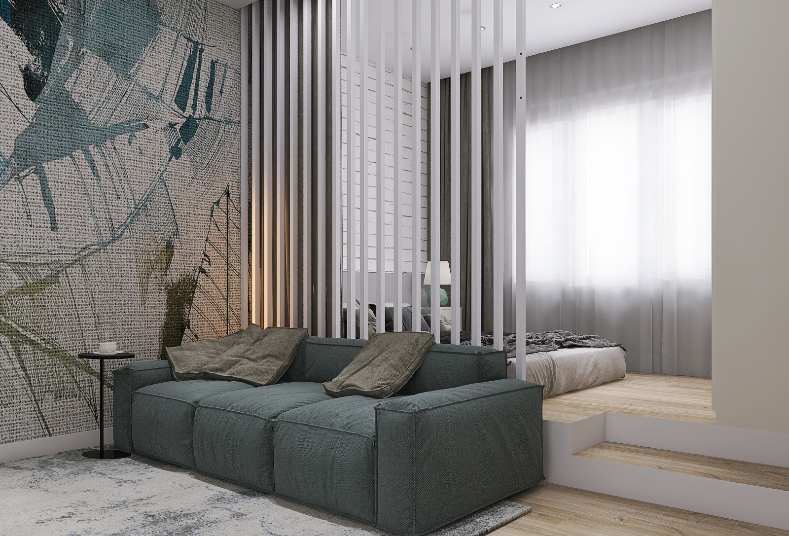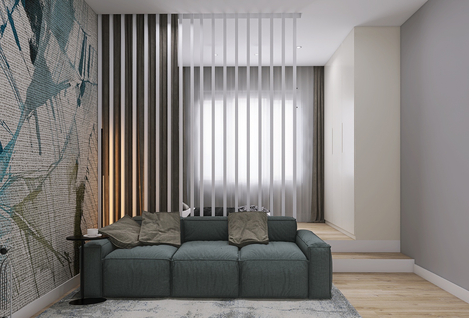 С помощью подиума, реечной перегородки и штор отделили спальную зону. Здесь же расположили большой вместительный шкаф. Остальное пространство заняла зона TV и туалетный столик. Обои из коллекции ЛОУ / LOWE помогли подчеркнуть зонирование, придать пространству индивидуальность, наполнить яркими акцентами.