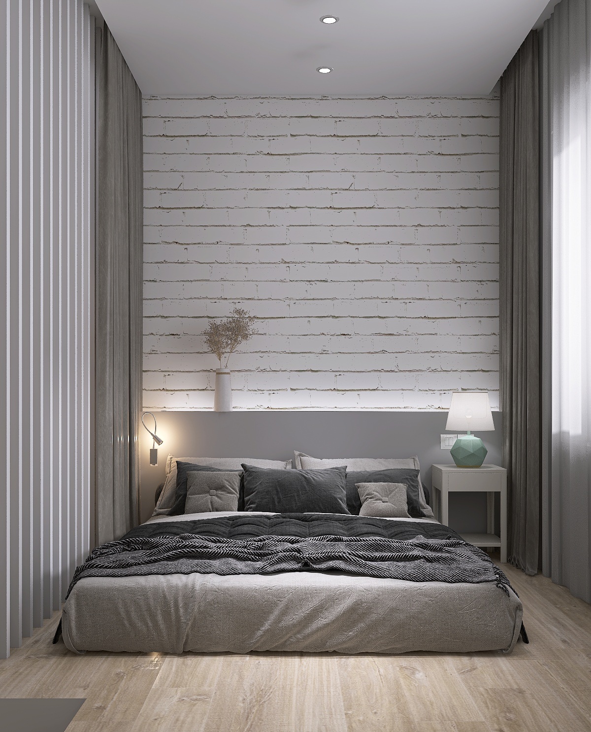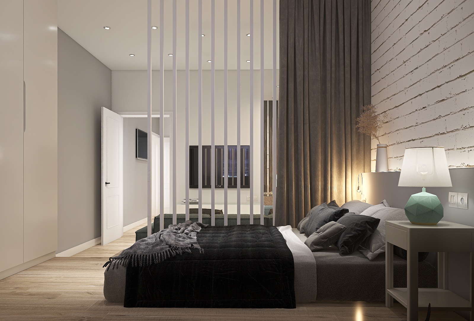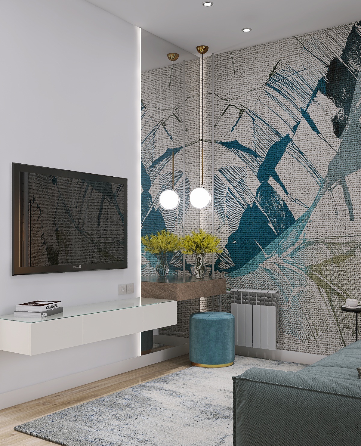 С помощью подиума, реечной перегородки и штор отделили спальную зону. Здесь же расположили большой вместительный шкаф. Остальное пространство заняла зона TV и туалетный столик. Обои из коллекции ЛОУ / LOWE помогли подчеркнуть зонирование, придать пространству индивидуальность, наполнить яркими акцентами.