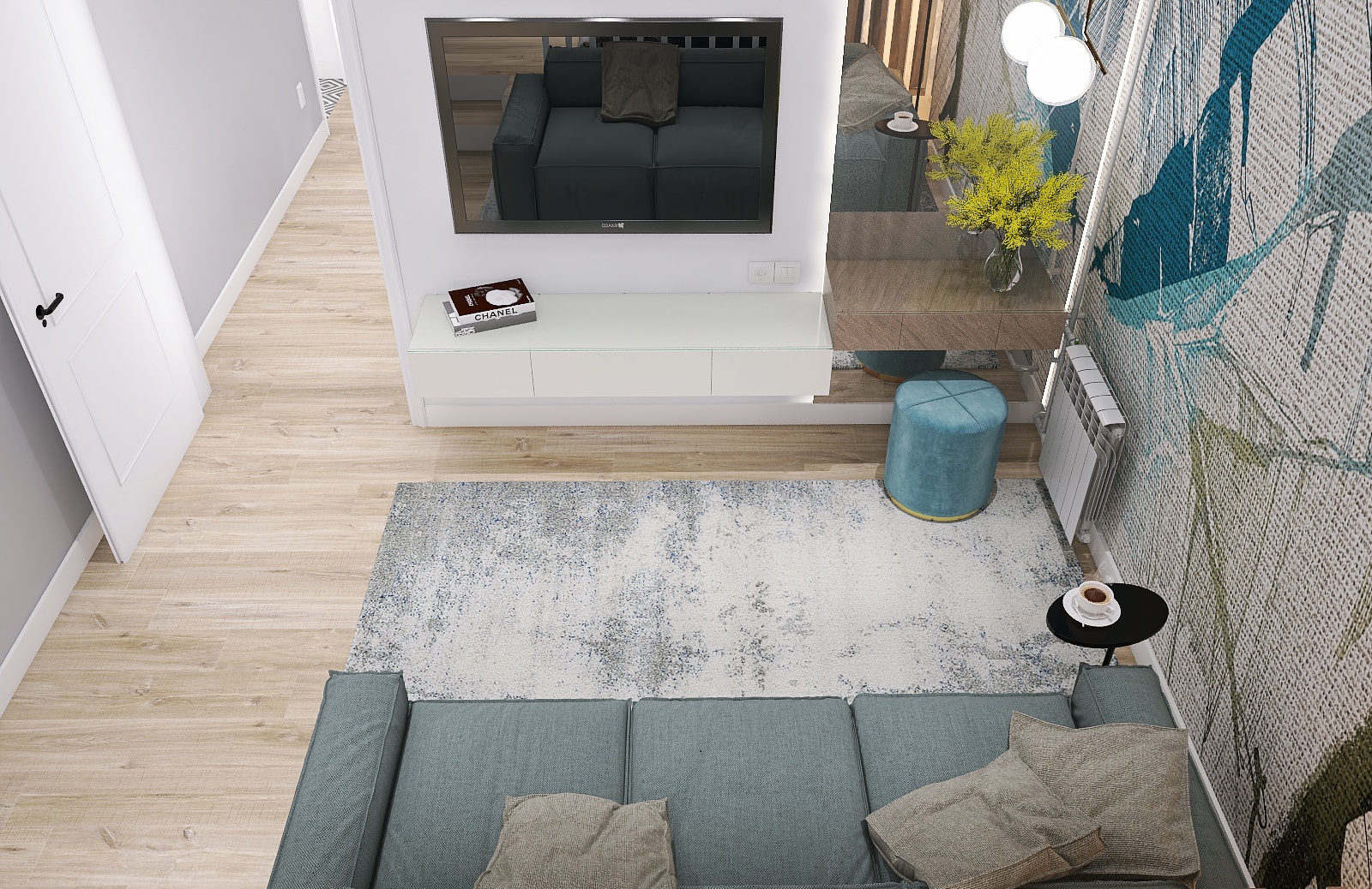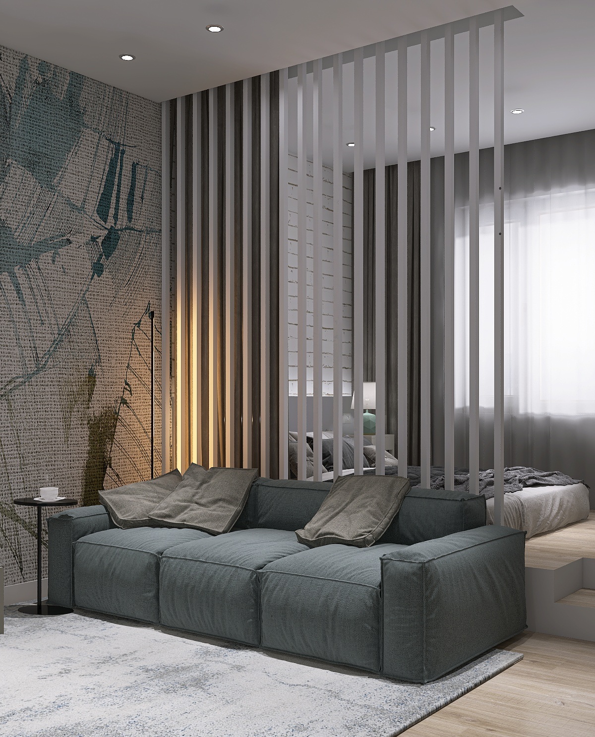 Единственная комната в однокомнатной квартире всегда выполняет сразу несколько функций. В этом проекте была задача совместить в одной комнате зону для отдыха, места для хранения и отдельное спальное место.