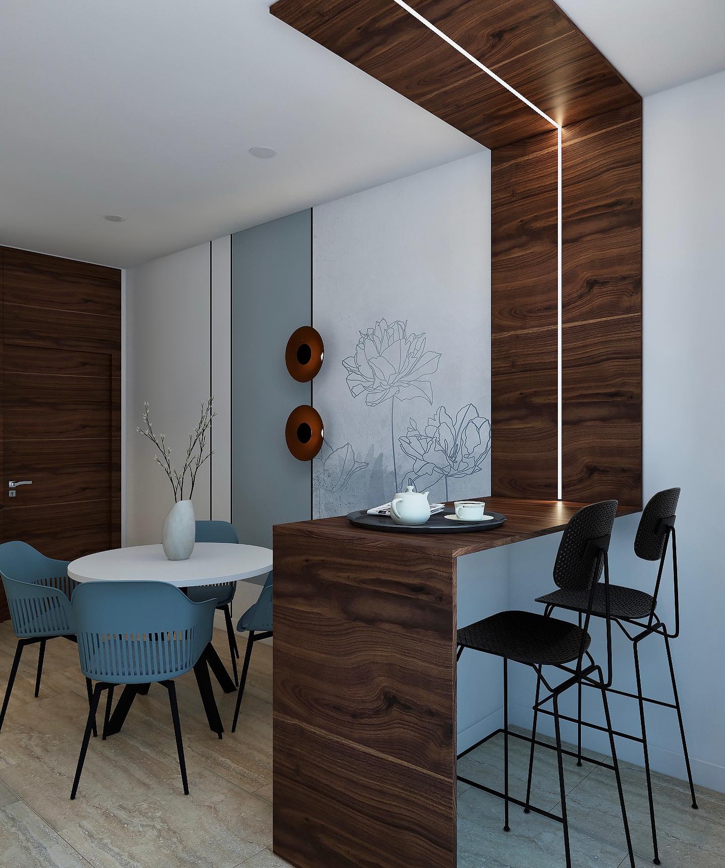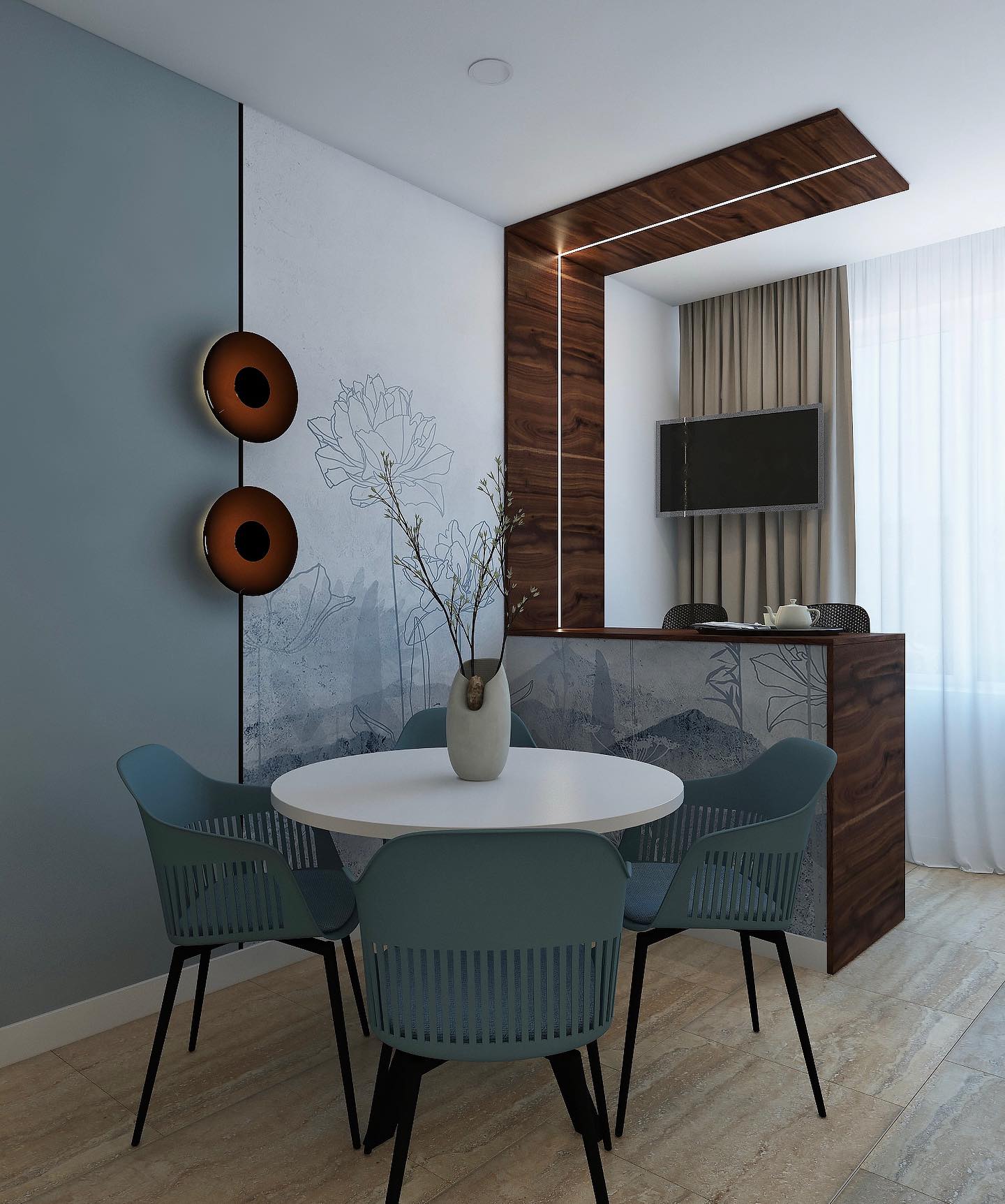 Комната по-настоящему начинает “дышать”, так как за счет светлых тонов и стройных форм листьев, колосьев и стеблей пространство расширяется. Фигуры либо ложатся тенью на дизайнерские обои, либо очерчены лишь по контуру тонкими линиями. Хозяева же могут обрести спокойствие и гармонию, как после отдыха на природе.