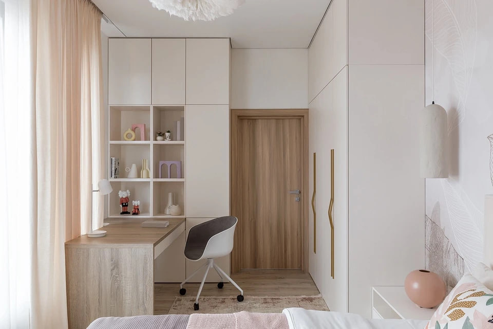 Один из элементов художественного оформления детской — стена с большой фреской. При выборе фрески в детскую комнату дизайнер сделал ставку на полотно с нейтрально-фоновым принтом, который будет актуален долгое время. Кроме того, для ребенка его комната — это место учебы, игровая и спальня одновременно. Фреска неярких цветов смотрится здесь органично. Она не мешает уснуть или сосредоточиться на учебе. Конечно, стена, ставшая акцентной, привлекает внимание, но не перегружает интерьер. А ее расположение за изголовьем кровати обозначает функциональную зону. При этом декор не виден во время отдыха и вряд ли надоест.
