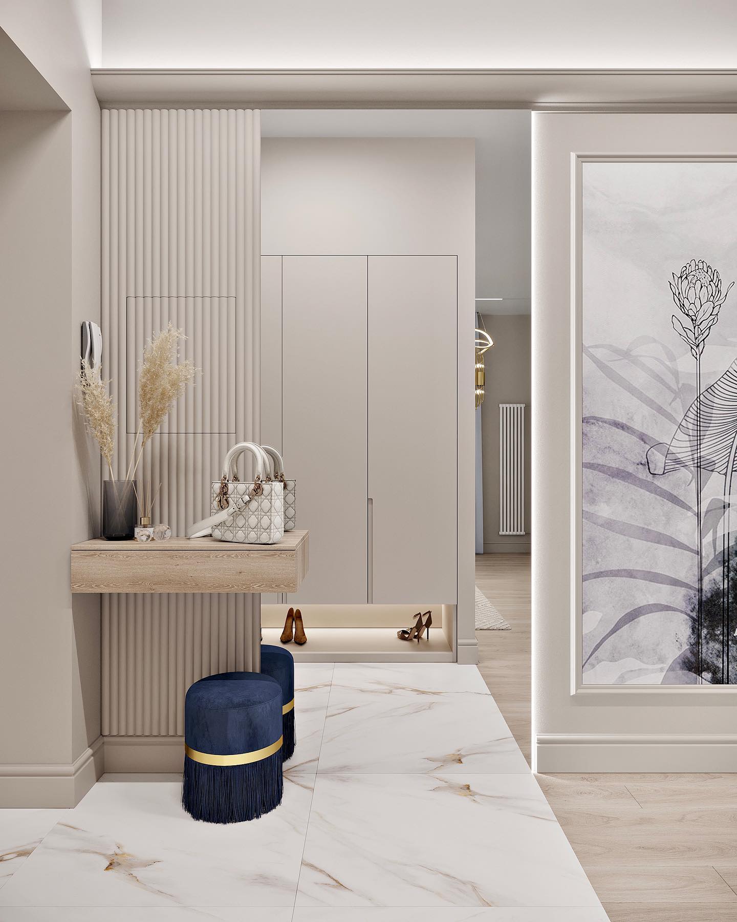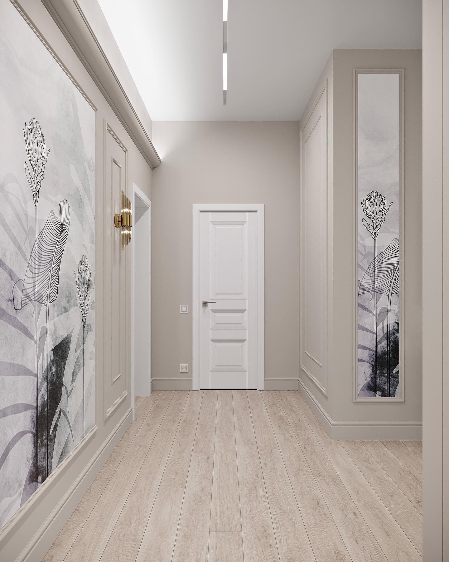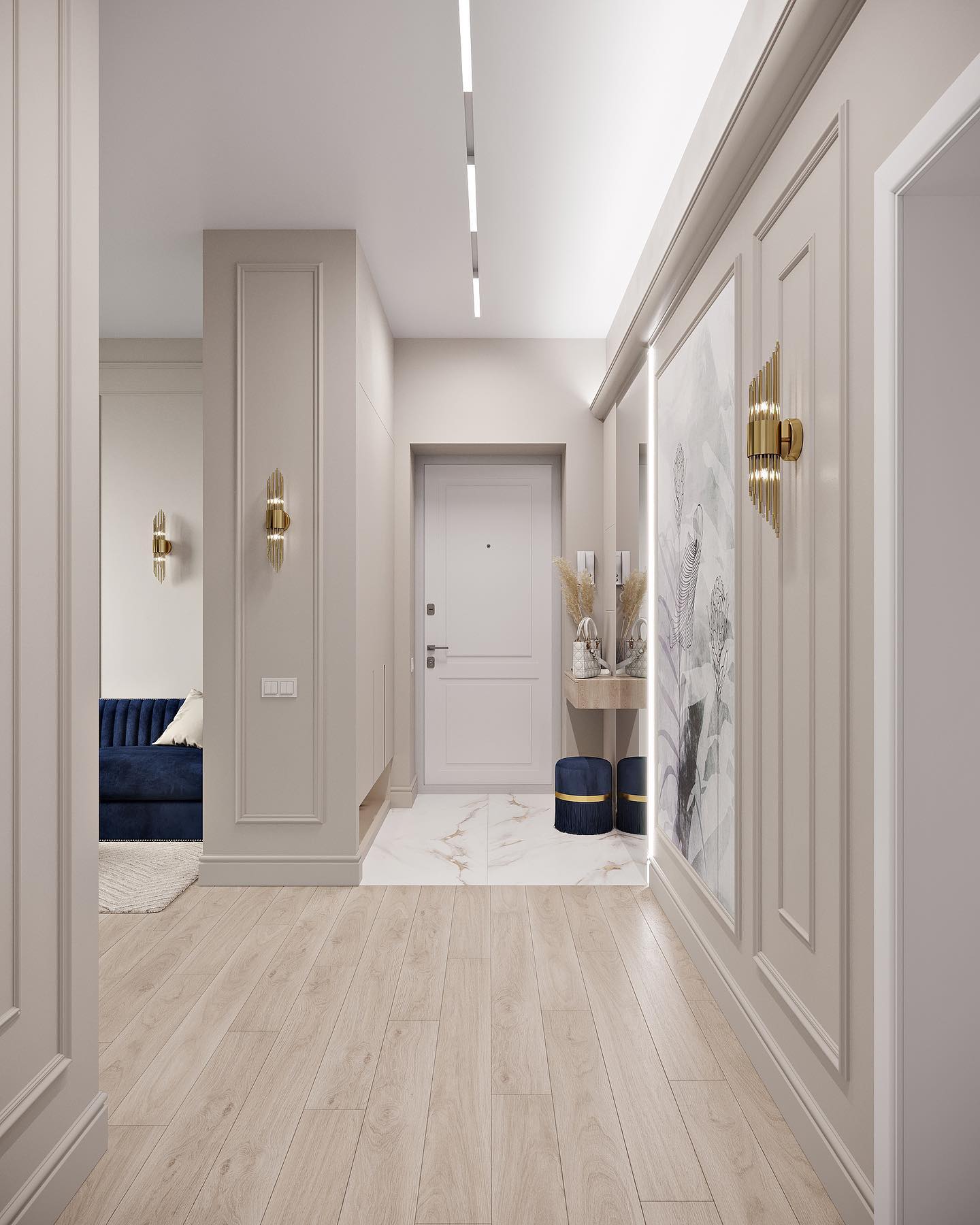 - длинная стена коридора отделана молдингами, панно и зеркалом с обратной подсветкой, что визуально делит ее на различные зоны и превращает простой коридор в галерею.