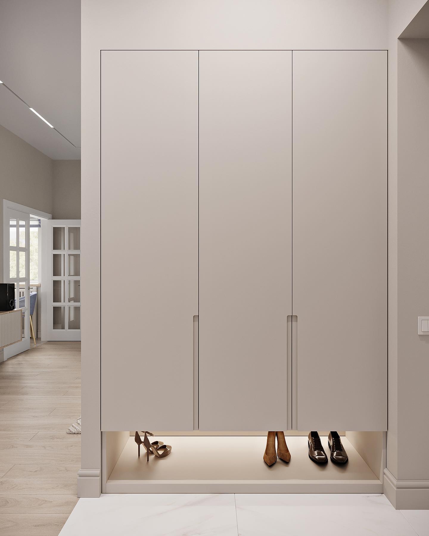 - открытая ниша для обуви во встроенном шкафу.