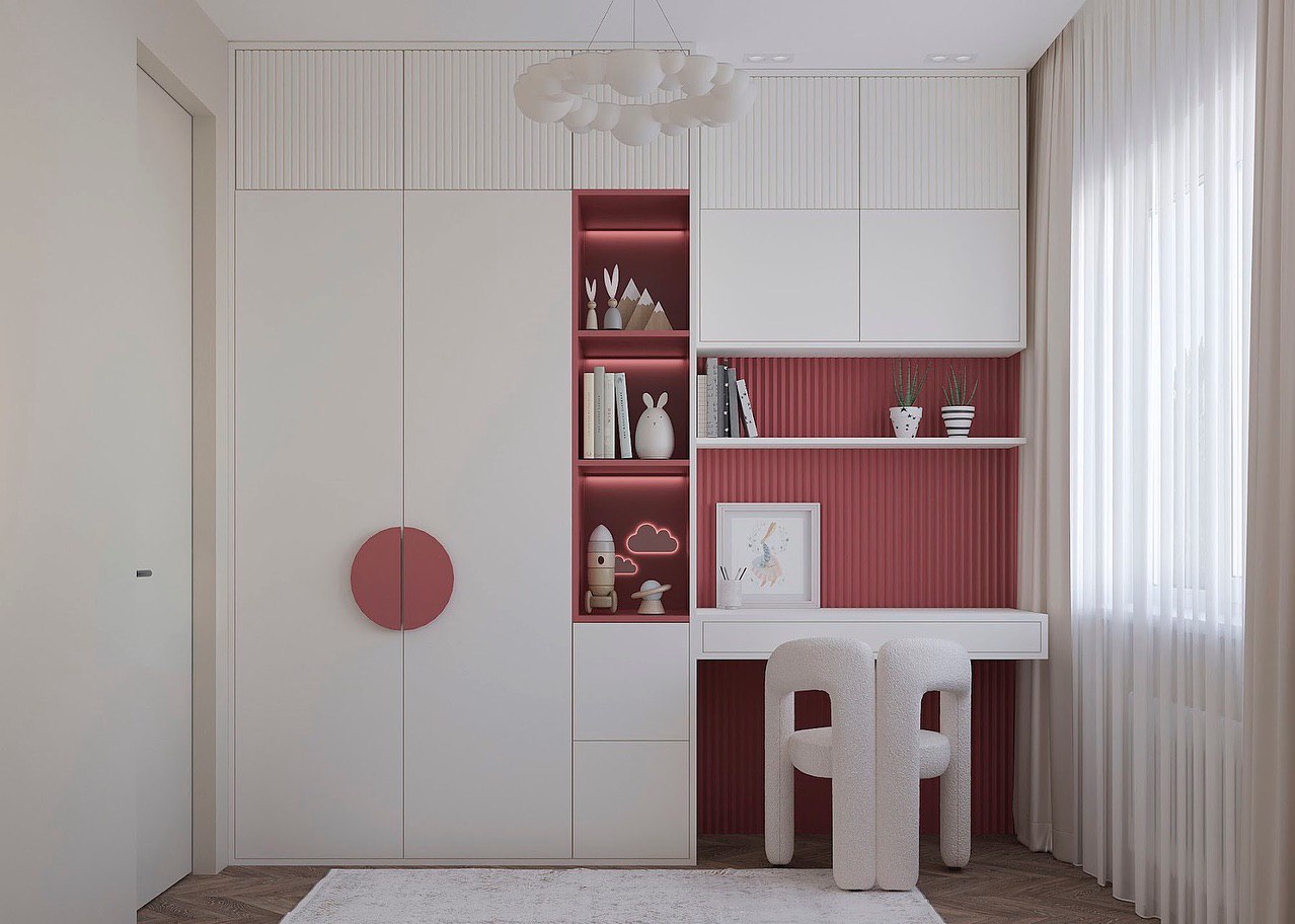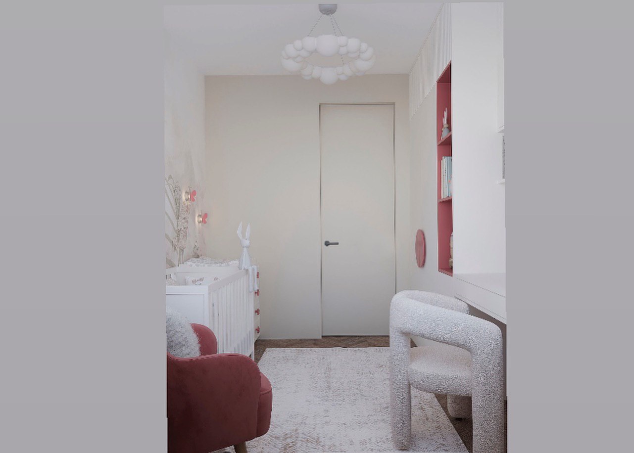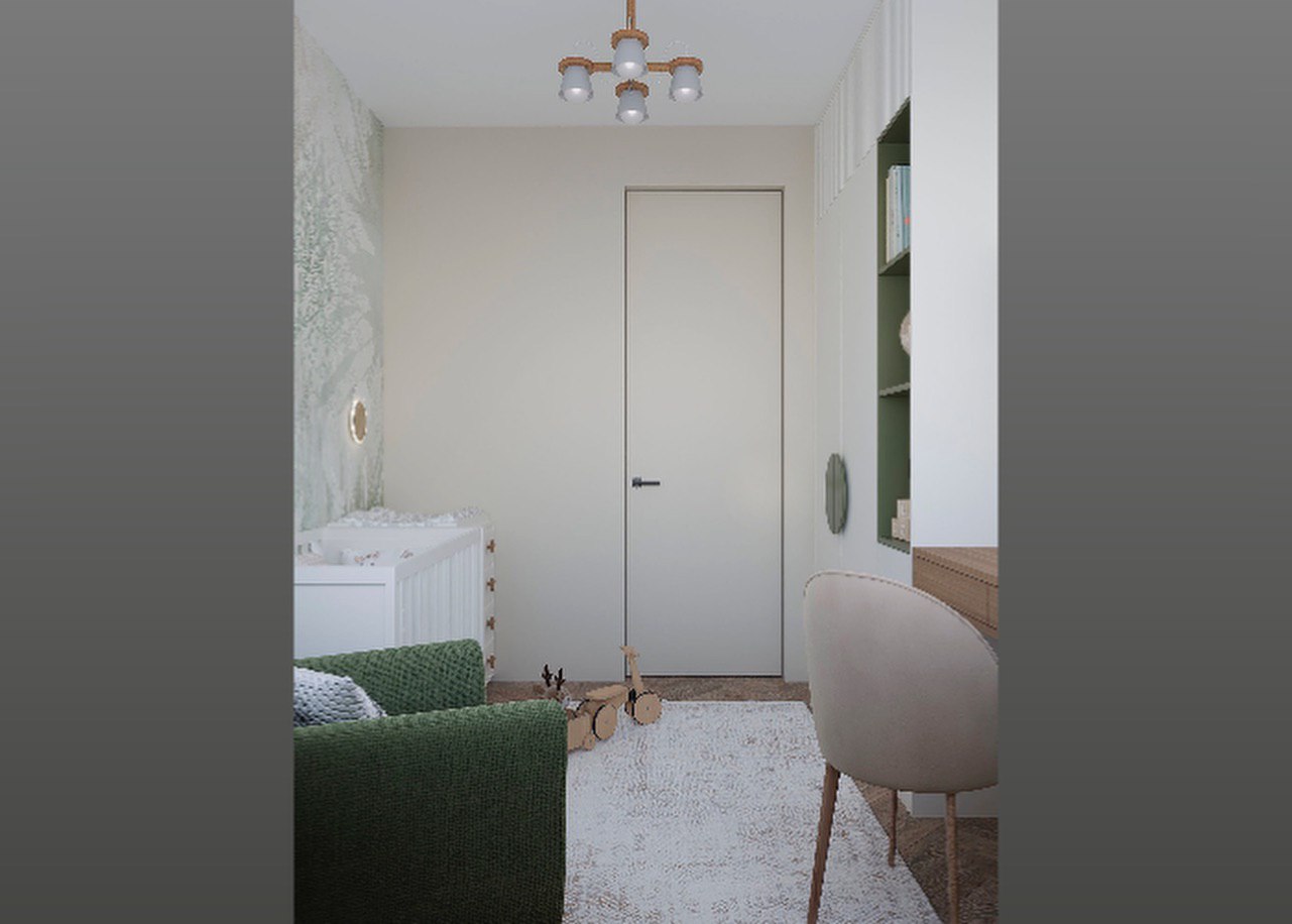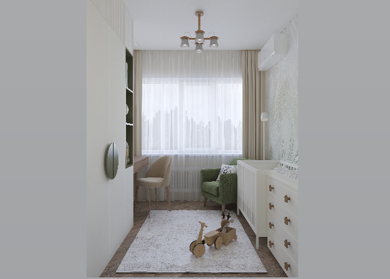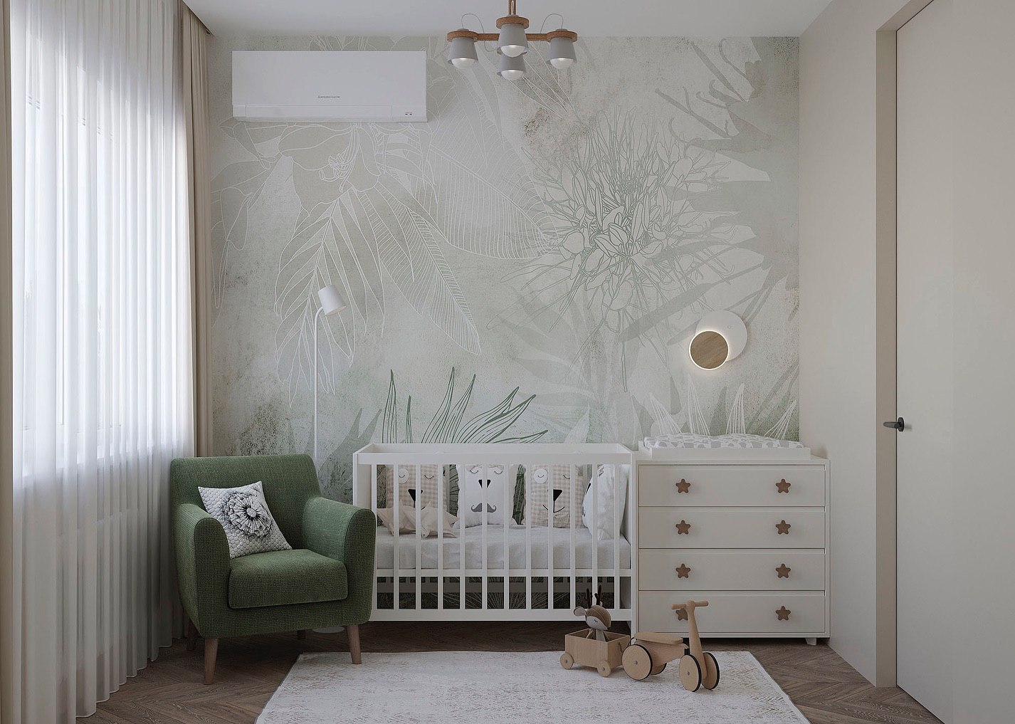 Заказчики просили разработать нейтральный дизайн детской комнаты для будущего ребенка. Обои выбирали между AIR 8 и AIR 13. Комната по-настоящему начинает «дышать», так как за счет светлых тонов и стройных форм листьев, колосьев и стеблей пространство расширяется. А природные мотивы благоприятно влияют на эмоциональный фон и психику.