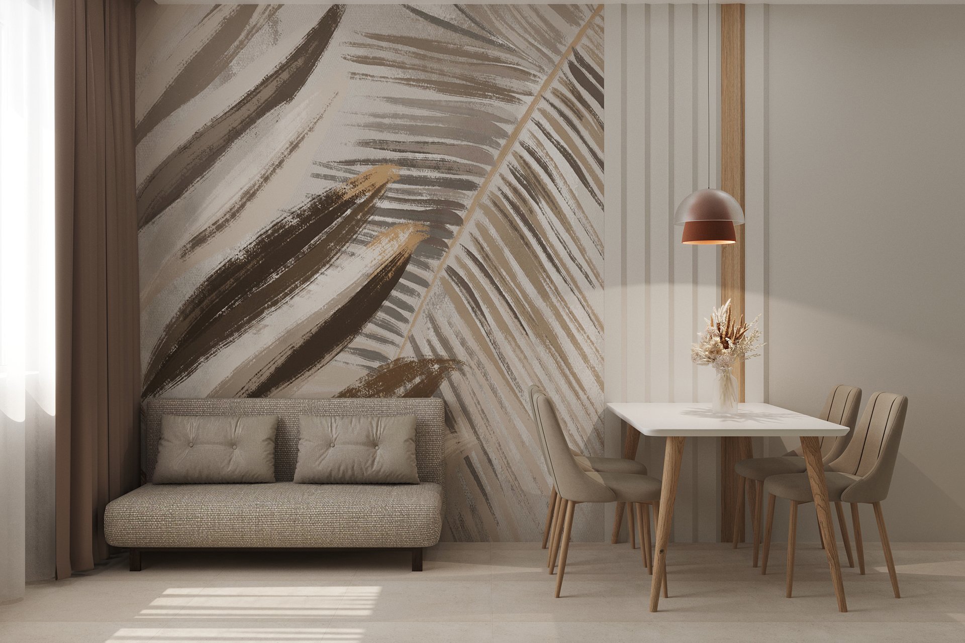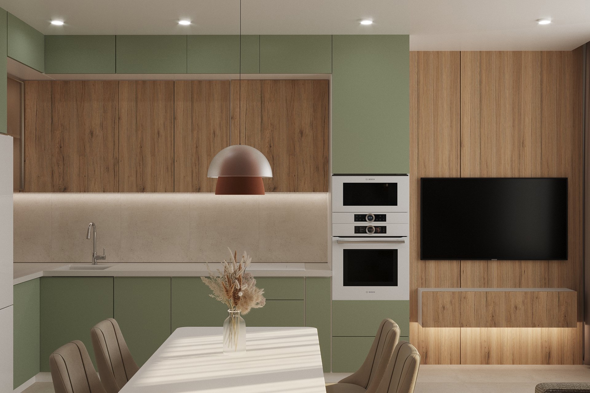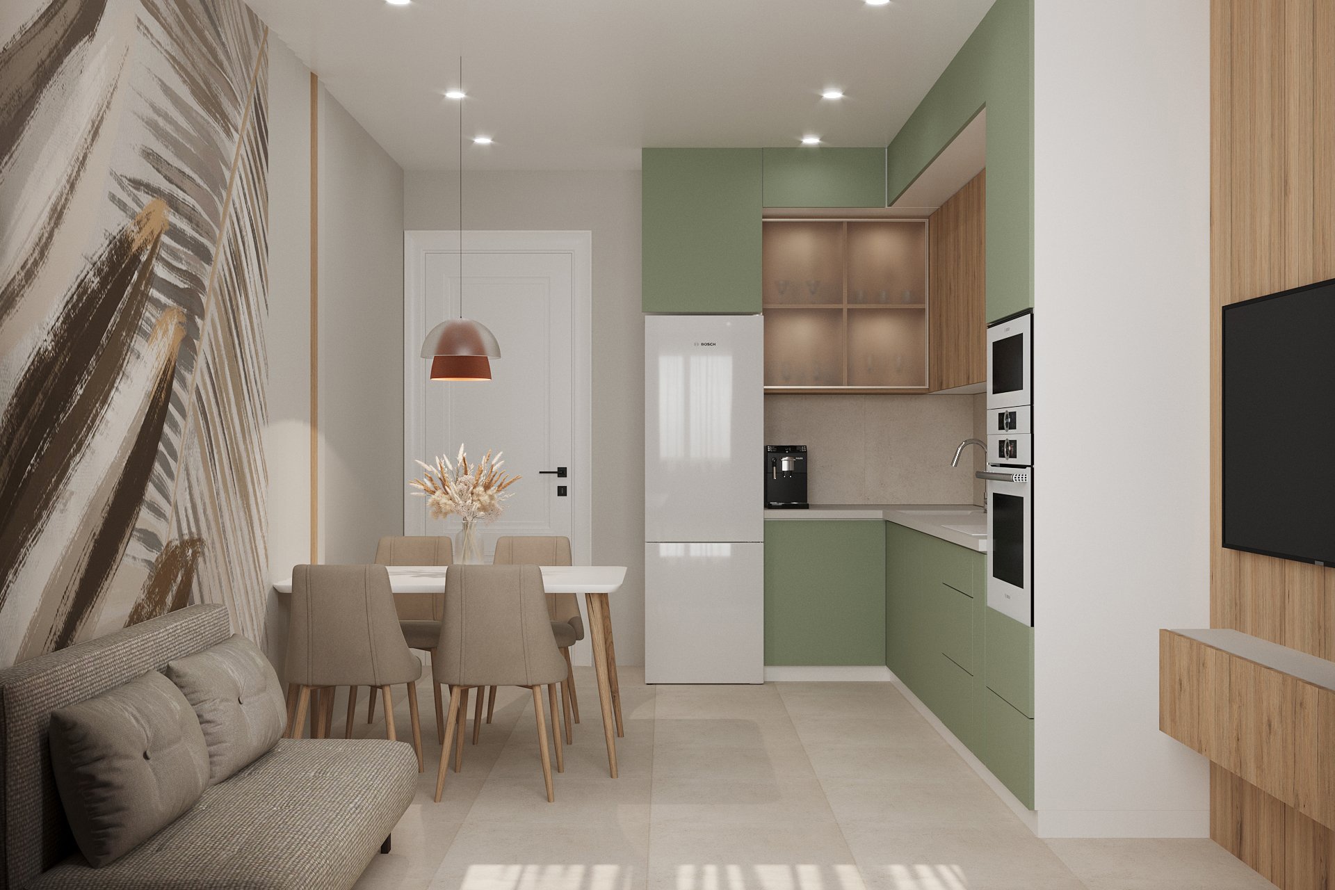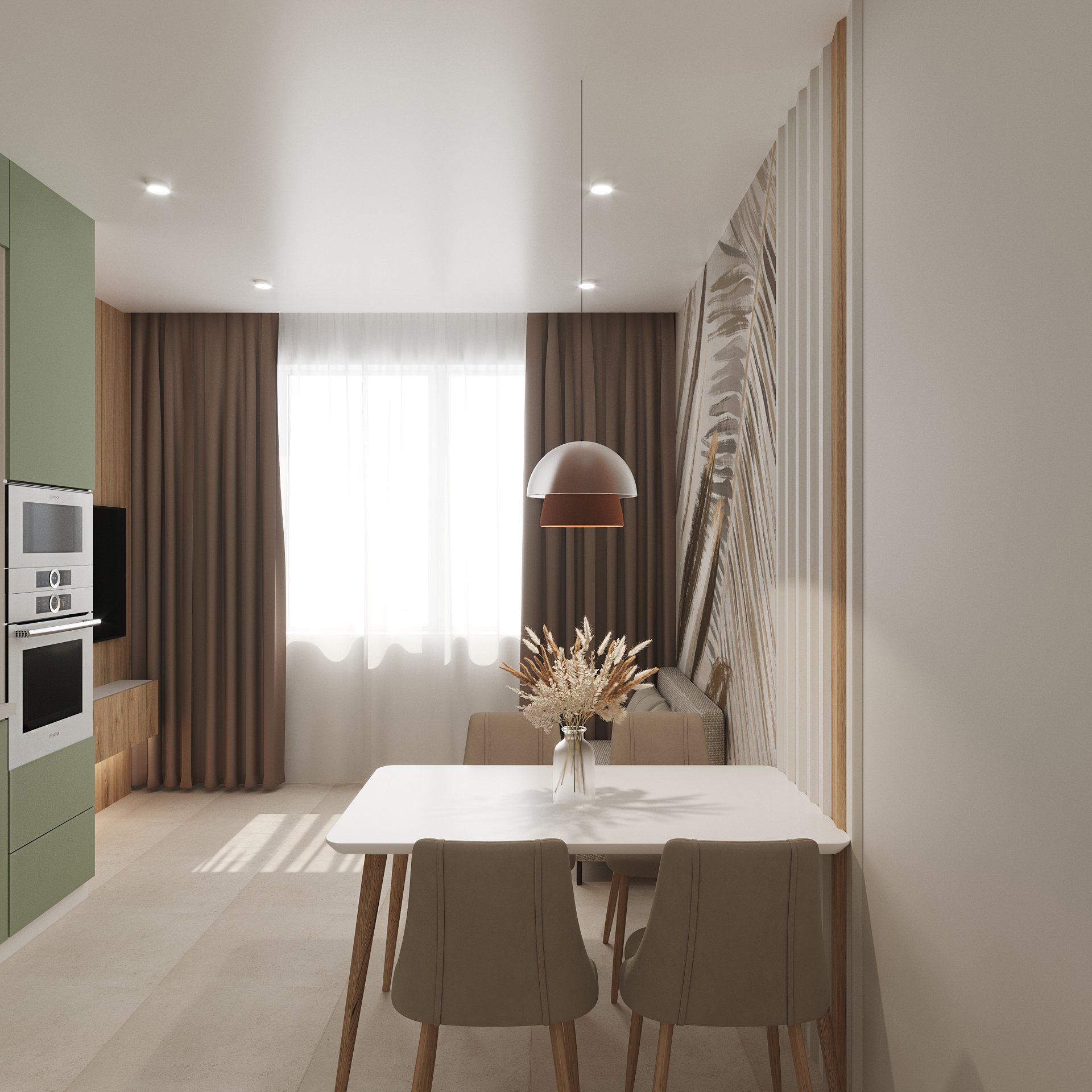 Кухня в трёхкомнатной квартире в Москве для молодой семьи с ребёнком. Обои из коллекции ALIVE 22. Растительные мотивы придают новое звучание интерьеру и создают атмосферу благополучия и умиротворения. Универсальный принт органично вписывается в спальню, гостиную, кухню и даже детскую.