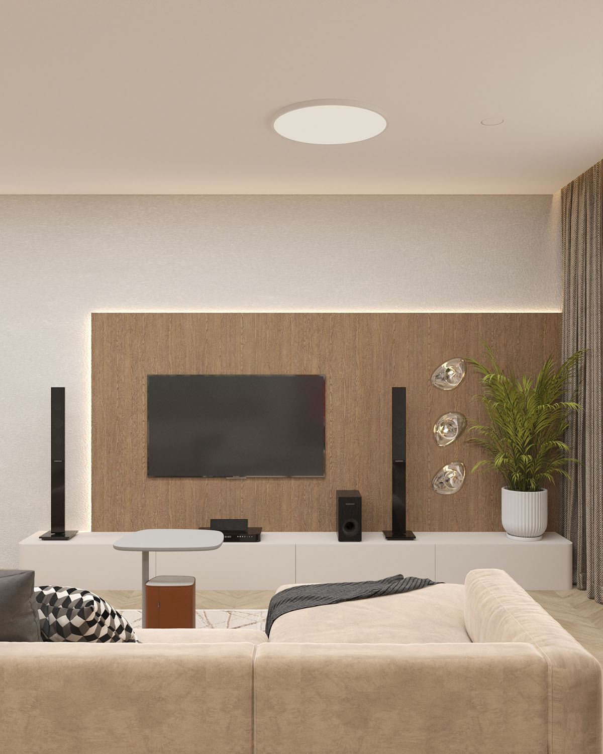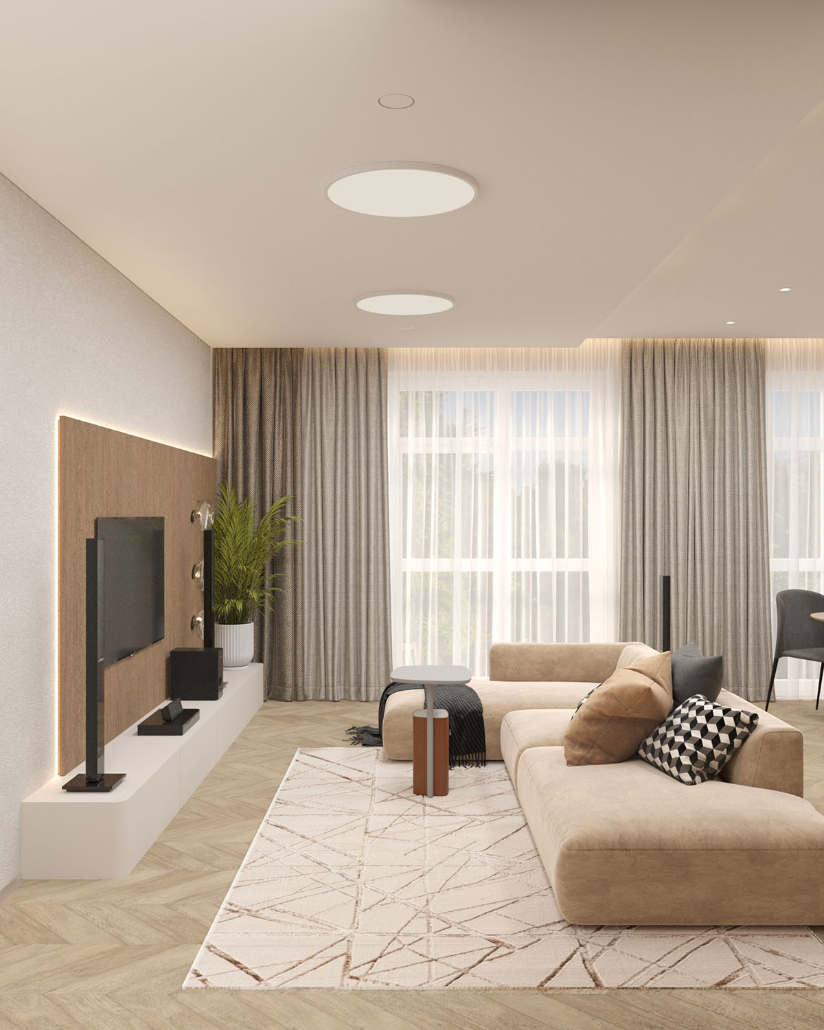 Проект двухэтажного коттеджа, который находится в Новосибирской области. Выполнен для мужчины из сферы IT, который не терпит современных новшеств в интерьере, таких как трековые системы, световые линии, а также помпезных классических «золотых» интерьеров. Он любит природные мотивы, обтекаемые формы, спокойные телесные и зеленые тона и классические текстильные шторы.