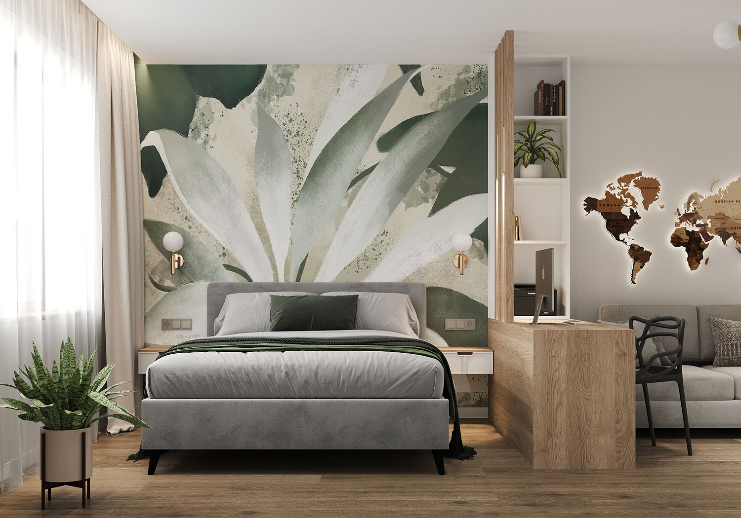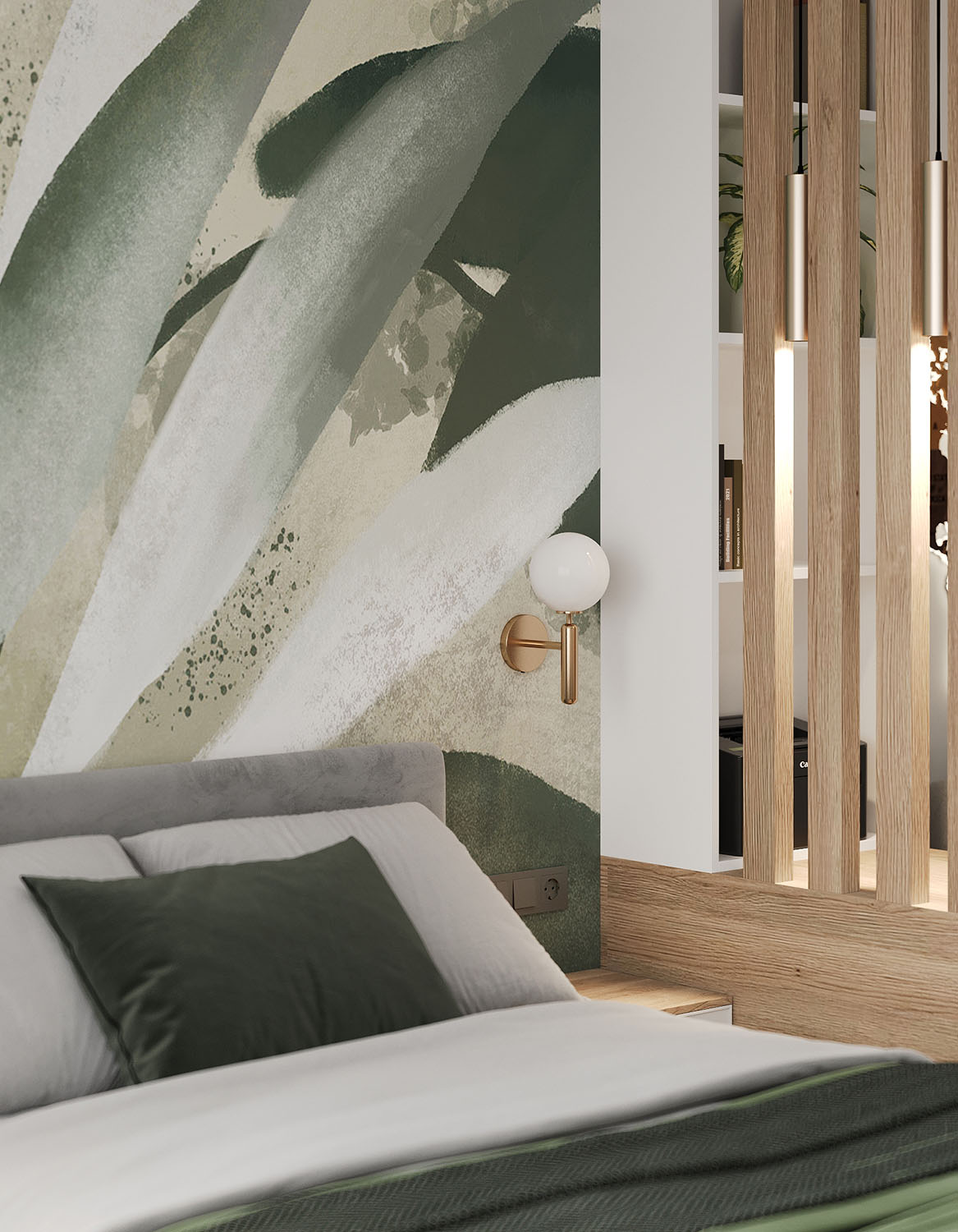 Проект однокомнатной квартиры площадью 42 квадратных метра. Была задача поделить единственную комнату на две части. Результат был достигнут благодаря планировочному решению и акцентным обоям из коллекции Alive, которые визуально отделили зону спальни от гостиной.