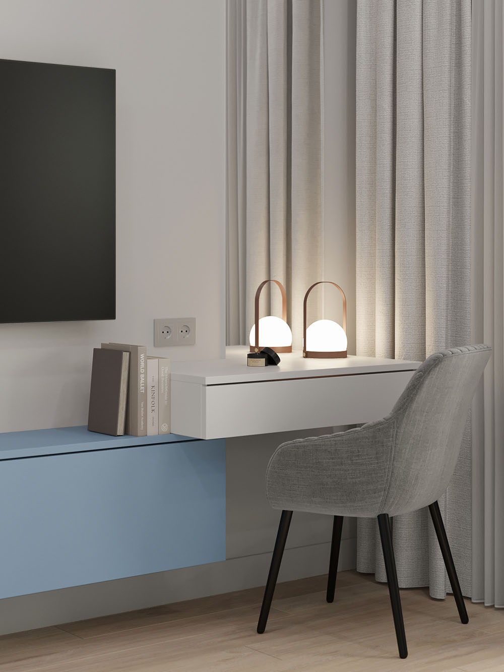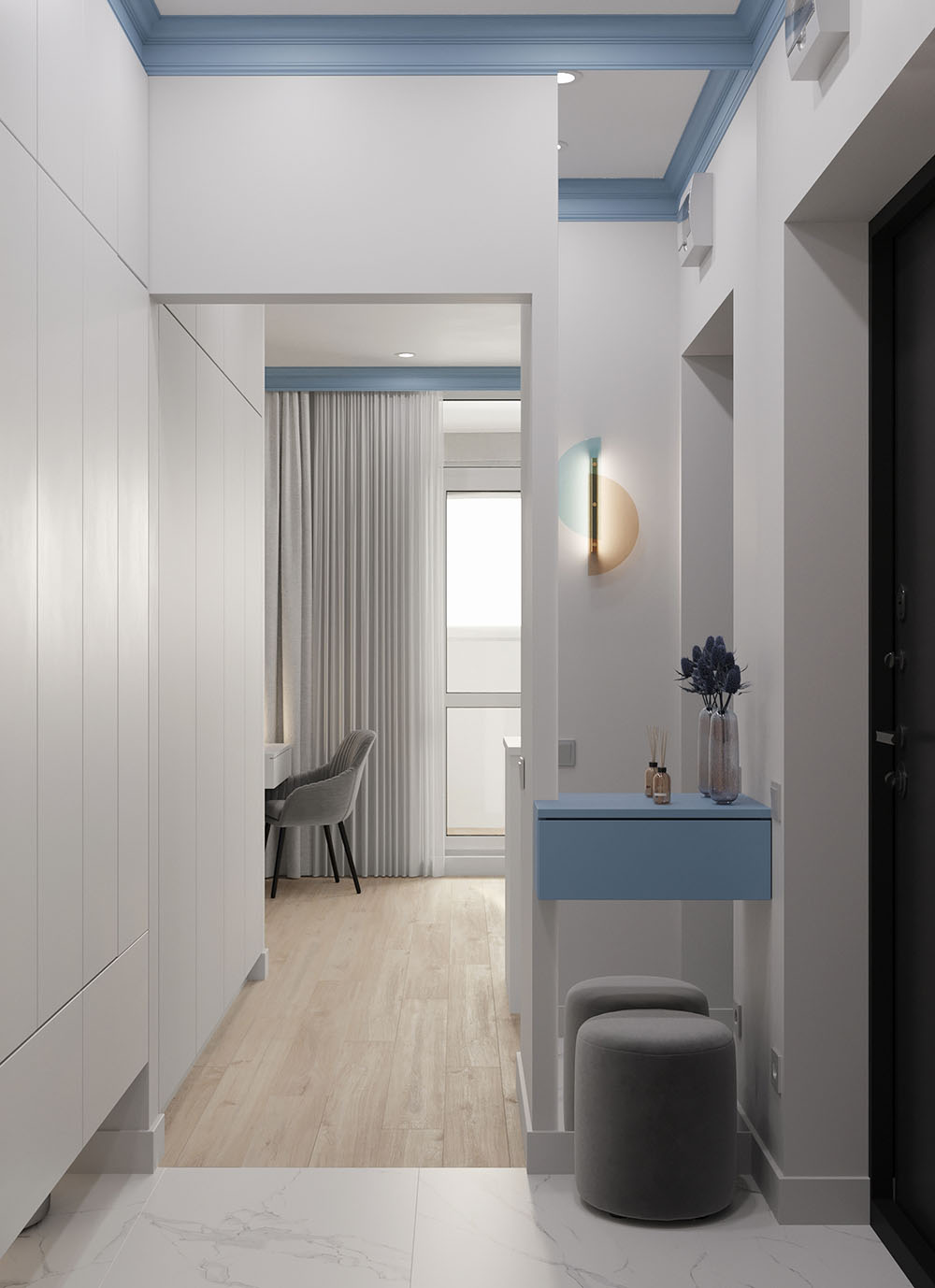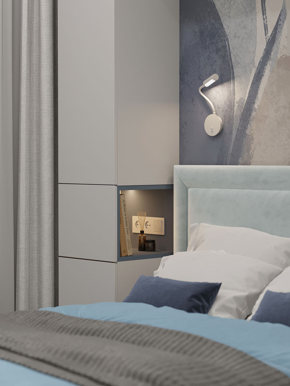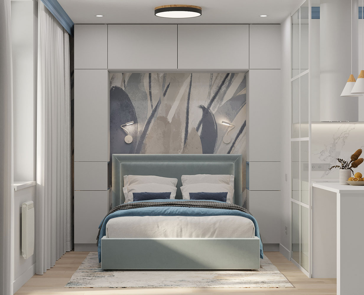Заказчики очень хотели красивые акцентные обои за изголовьем кровати и выбор остановился на коллекции ALIVE. Вся остальная цветовая концепция уже строилась вокруг них.