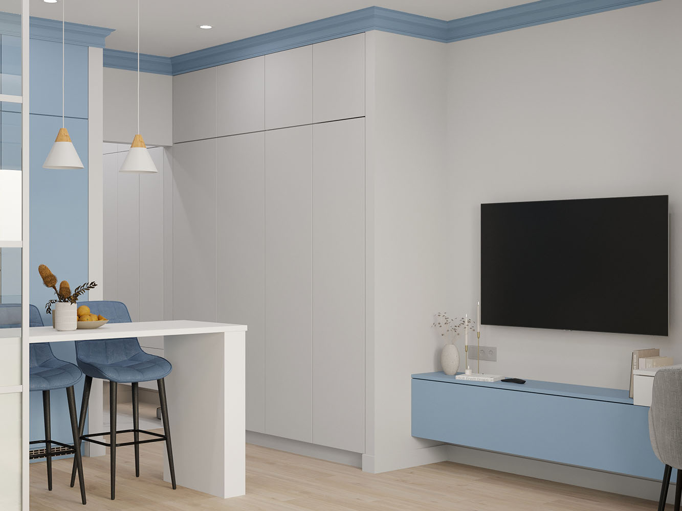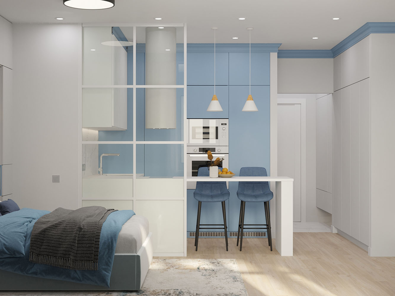 Дизайн-проект однокомнатной квартиры для дальнейшей сдачи в аренду в городе Краснодар. Потенциальными жильцами заказчики видели молодую пару без детей, возможно с животным.