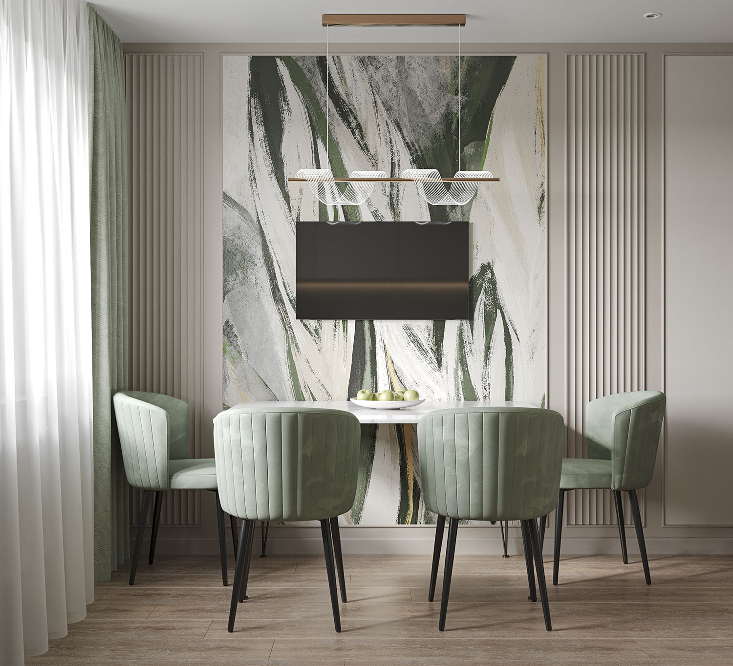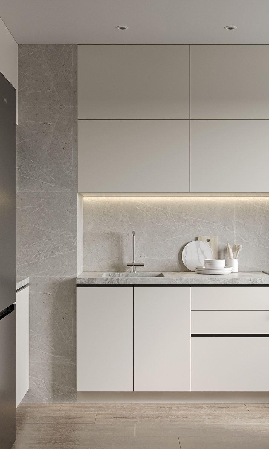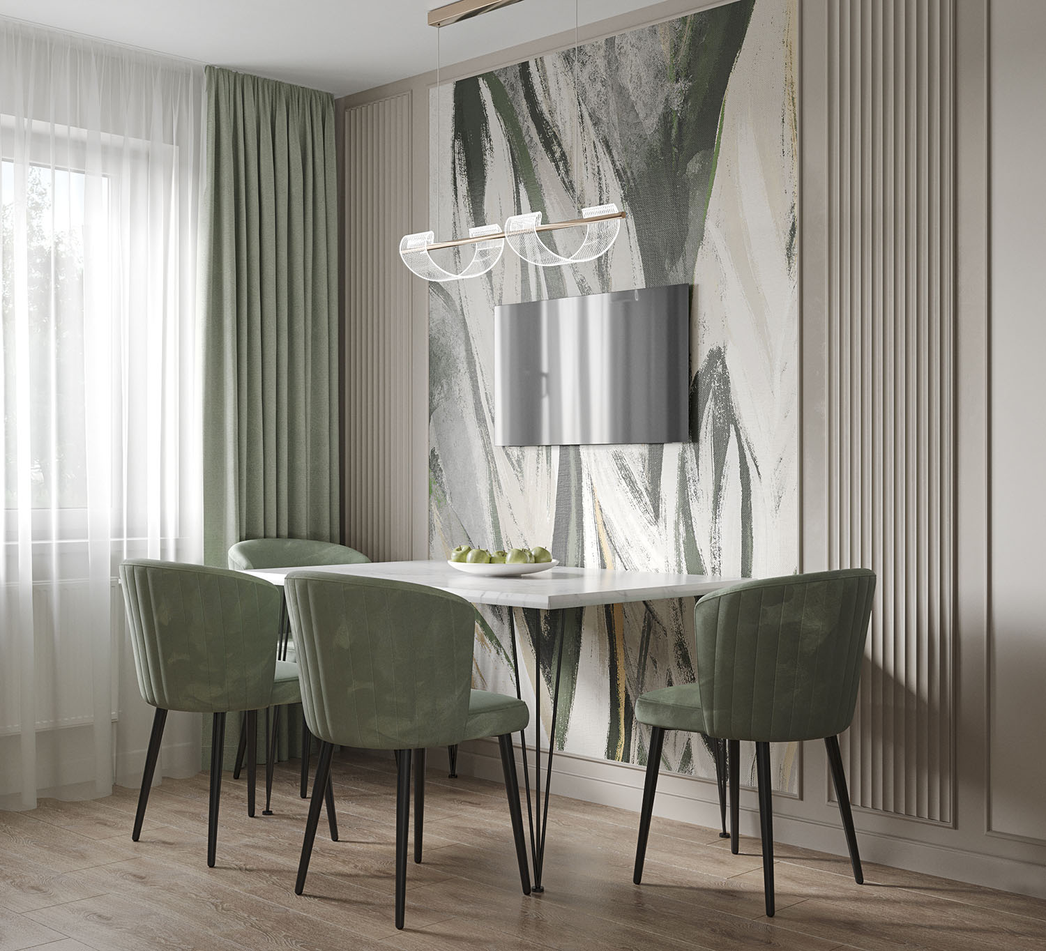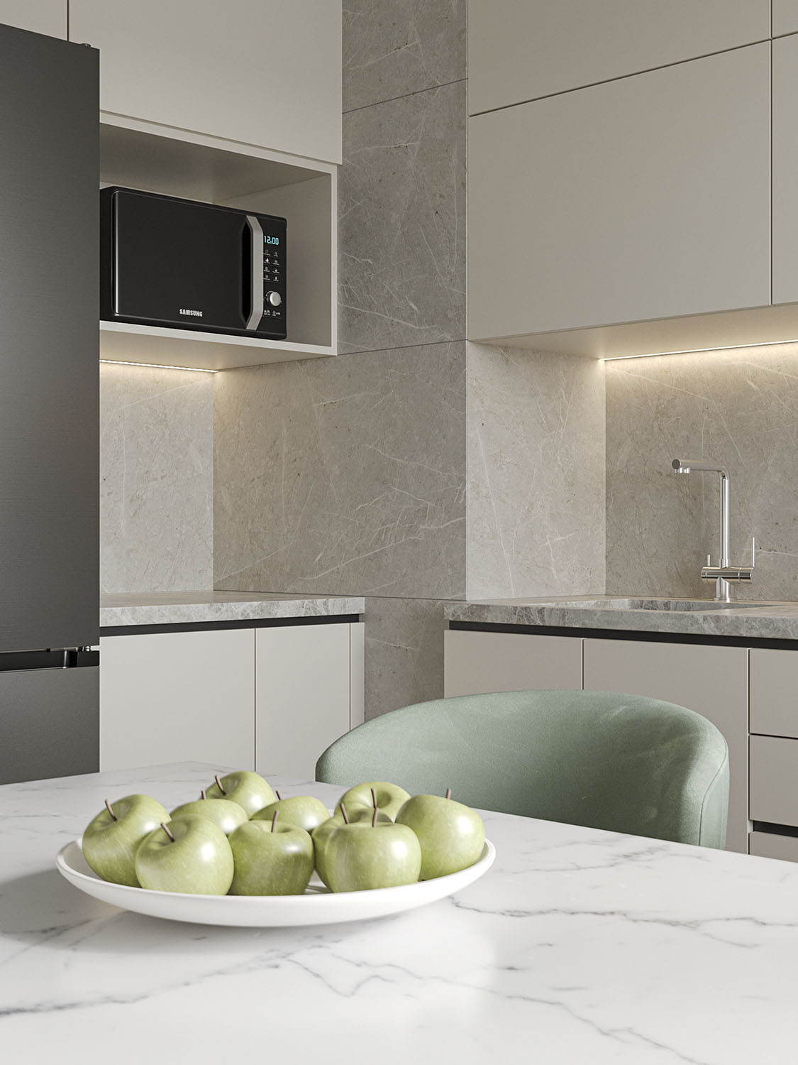Кухня площадью 10,6 м² из проекта квартиры в г.Ульяновск для семьи с двумя детьми. Пожеланиями были ощущение свежести и чистоты, и в то же время яркие акценты природных цветов.