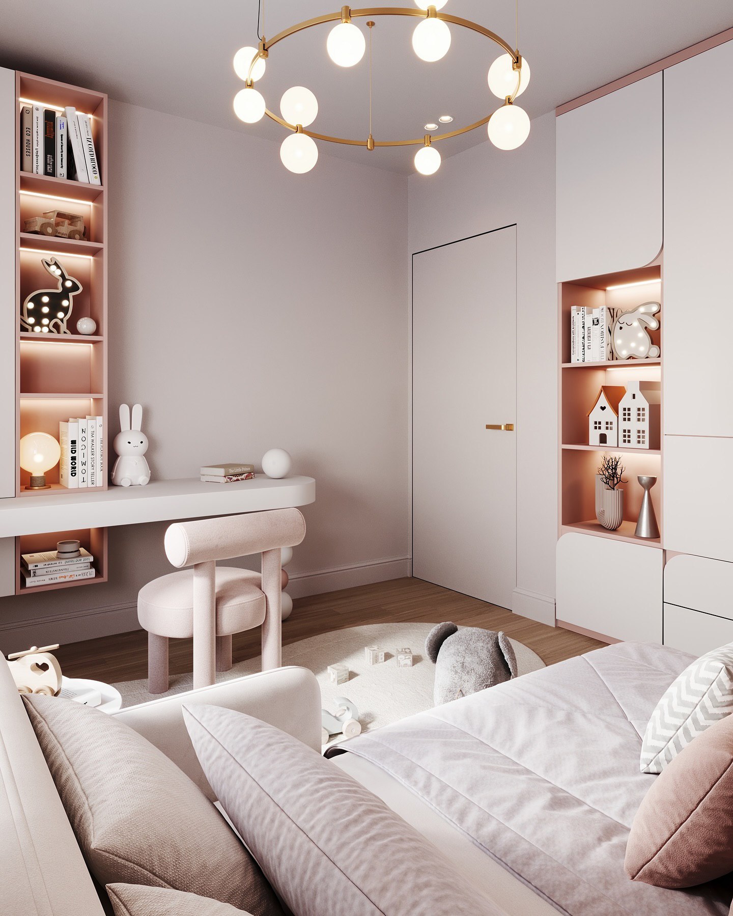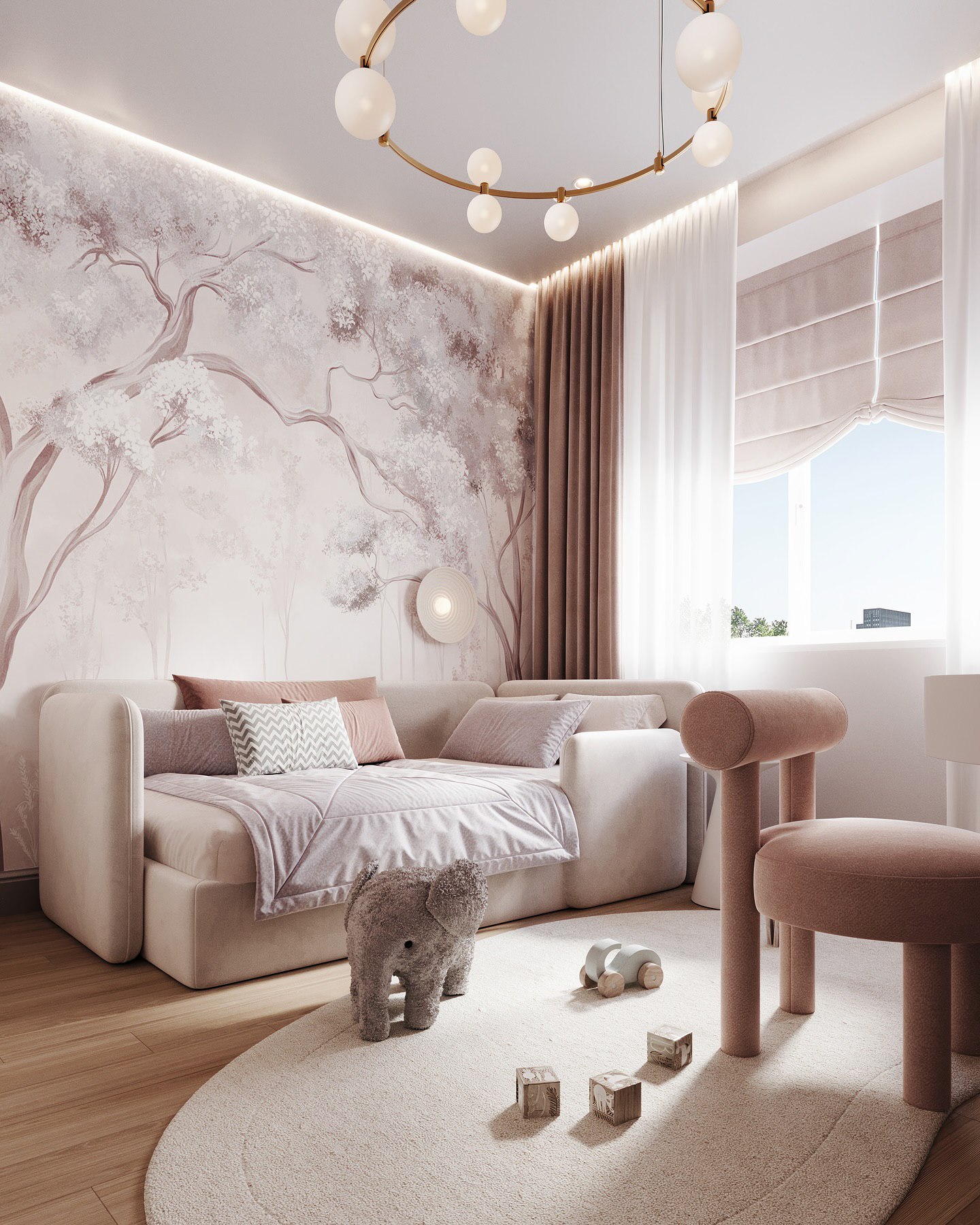 Детская комната с обоями из коллекции Arbre 22. В переводе с французского Arbre означает «дерево». Основная художественная задумка коллекции — сочетание классических пейзажных сюжетов, популярных для традиционных фресок, и скандинавской стилистики. Силуэты сказочных деревьев, романтические пейзажи, переплетающиеся ветви, колышущиеся на ветру травы и сдержанная цветовая гамма коллекции Arbre 22 придадут интерьеру соответствующую атмосферу и расставят деликатные акценты.