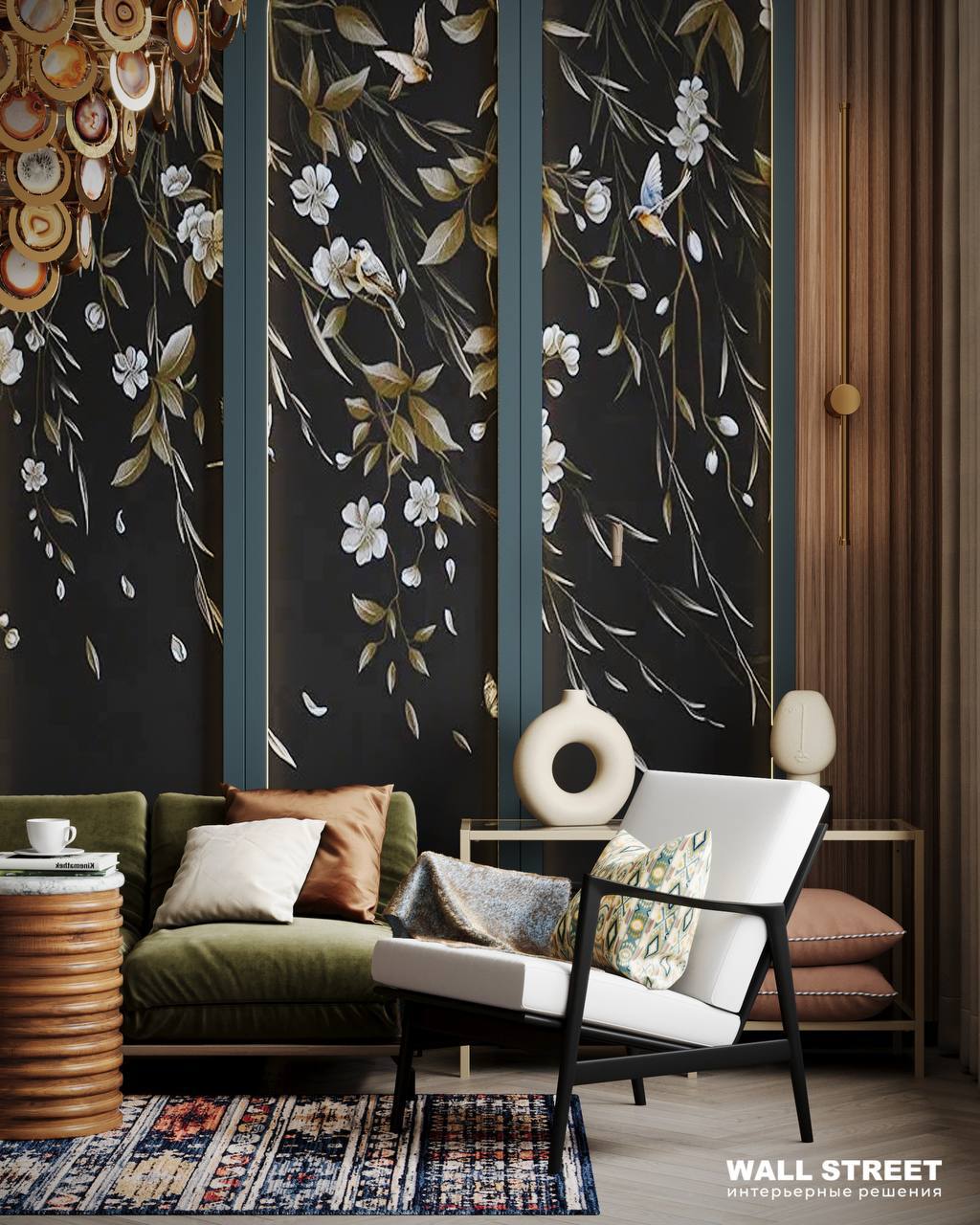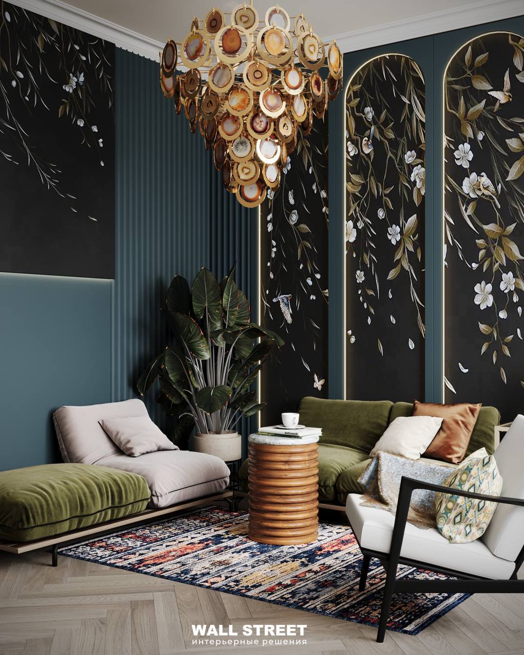 Представляем вам проект гостиной с обоями из коллекции дизайнерских принтов «ARCADIA». Это про стены, которые рассказывают истории. С птицами, лианами, цветами, геометрией, космосом — но без капли банальности.