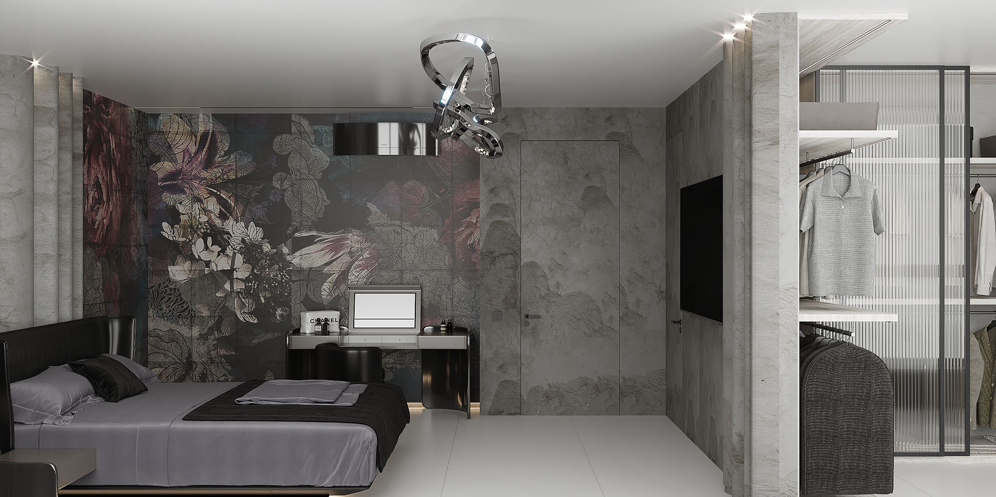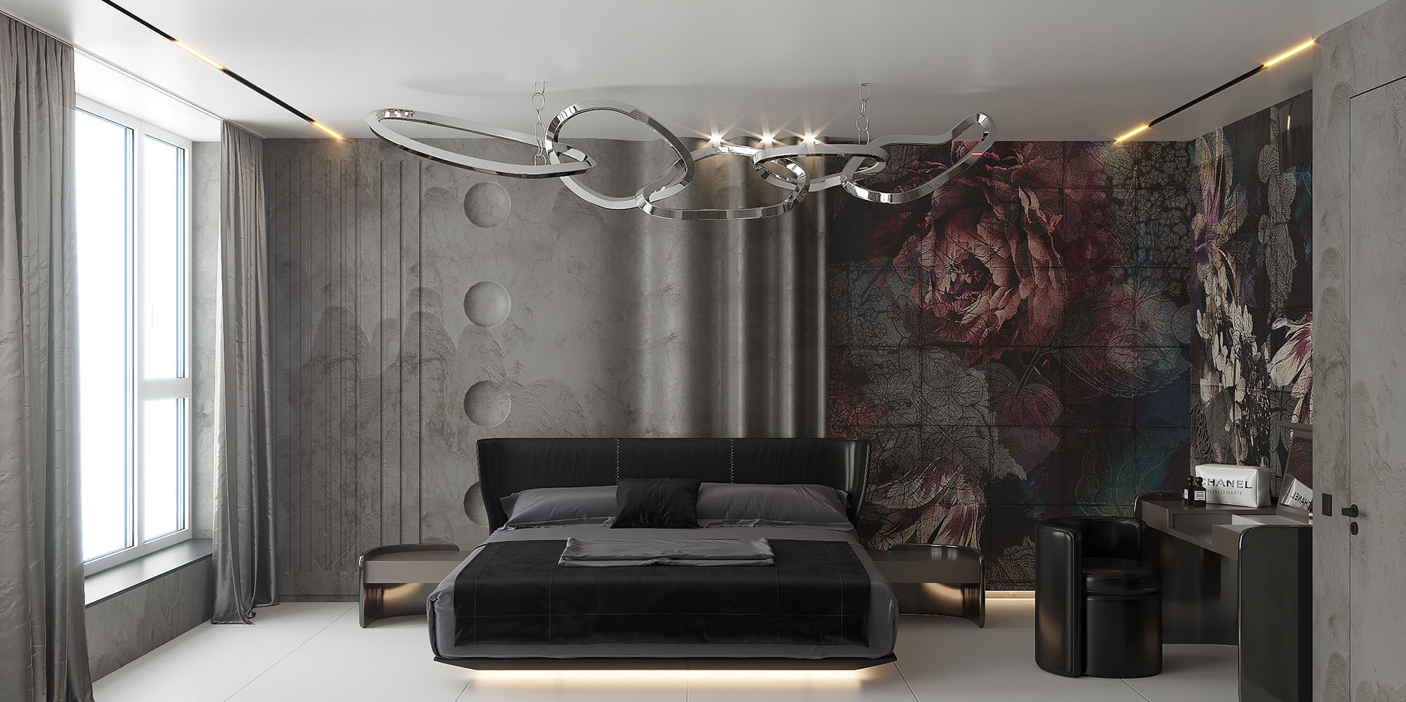 Представляем Вам проект спальни с обоями из коллекции дизайнерских принтов «Astral». Многим из вас хотелось бы жить в роскошном нуаровом интерьере? Чтобы всё было настолько уникальным и фантастическим, что сердце замирало бы от красоты? Коллекция Astral — удивительное и глубокое погружение в чувственный и утончённый мир роскоши.