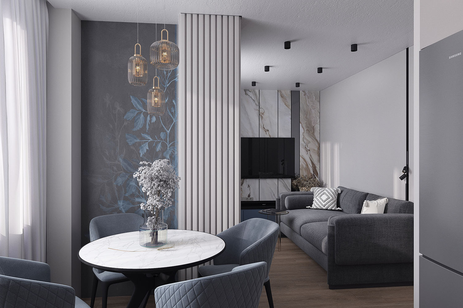 Кухня-гостиная в современном стиле. В интерьере гармонично сочетаются светло-серые оттенки с припыленно-голубым цветом. Обеденная зона выделена дизайнерскими обоями из коллекции BELLA и поддержана стальными светильниками. Получилось изящно.