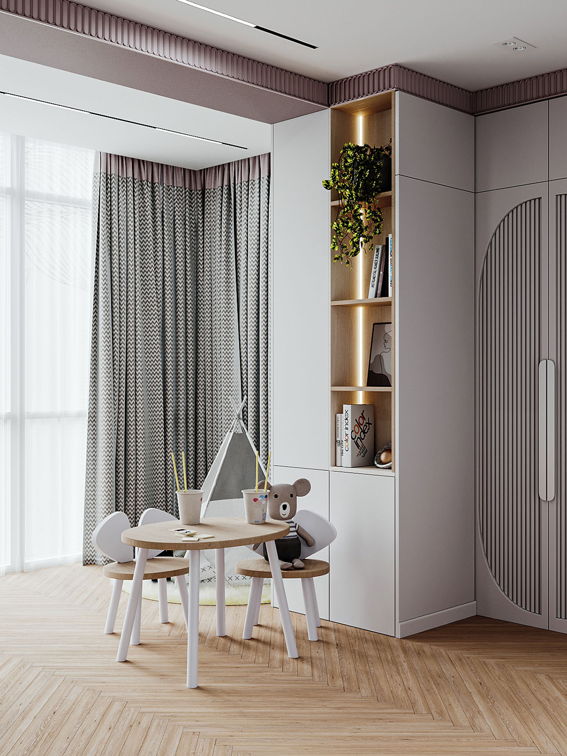 Помимо этого, в комнате предусмотрели просторные места для хранения: шкаф для одежды, вместительная книжная полка и ящики под хранение в ступеньках кровати. В комнате есть кондиционер, бризер для очистки воздуха, трековые системы и небольшая подсветка в книжном шкафу.