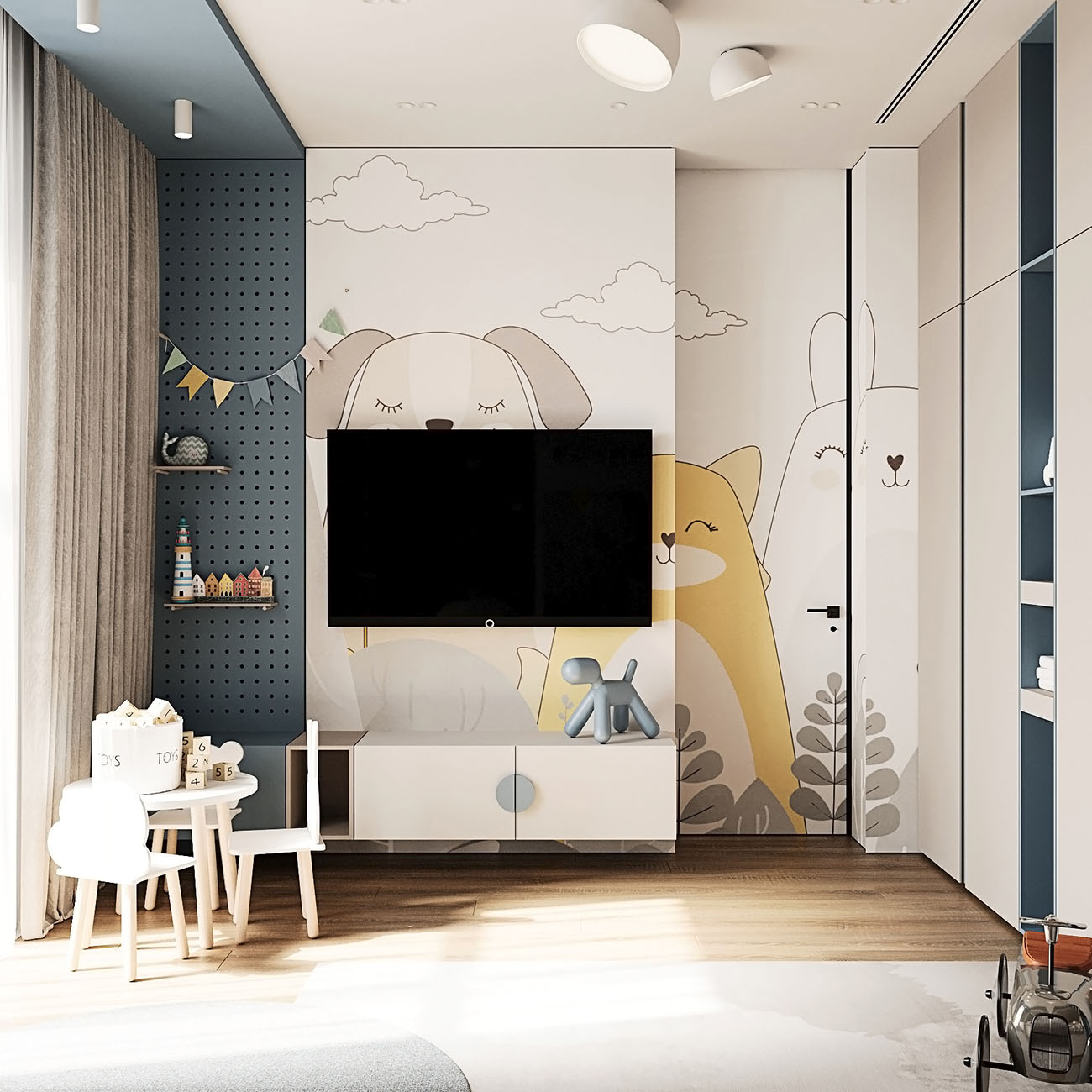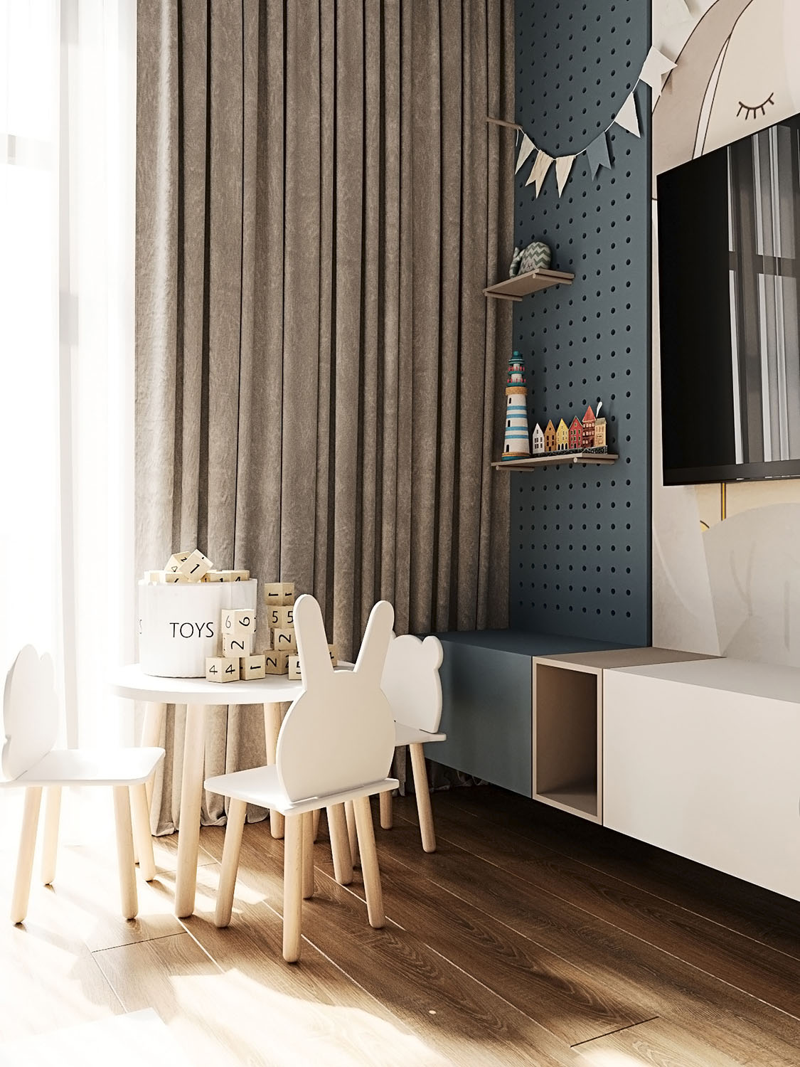 Площадь комнаты — 16,5 м². Заказчики хотели, чтобы детская была с большой игровой зоной над кроватью и рядом. Также задачей было спроектировать уголок для скалолазания. Изначально это — комната для малыша, но в будущем она трансформируется под школьника и его потребности, что можно увидеть на кадрах. Обои BIG LITTLE замечательно вписались в концепцию!