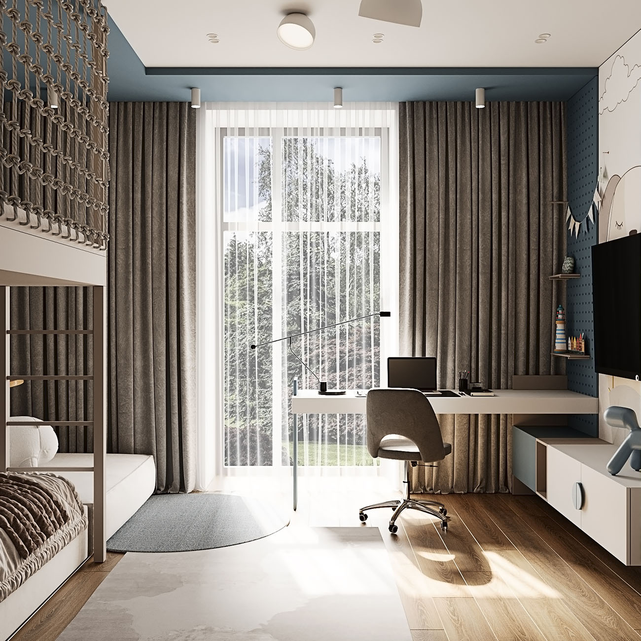 Проект дома в г. Пенза общей площадью 450 м² для семьи с 4 детьми. На этих кадрах представлена одна из детских для мальчика.