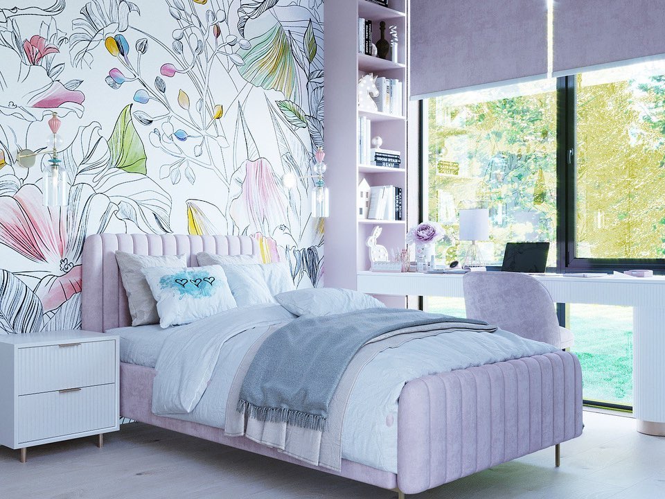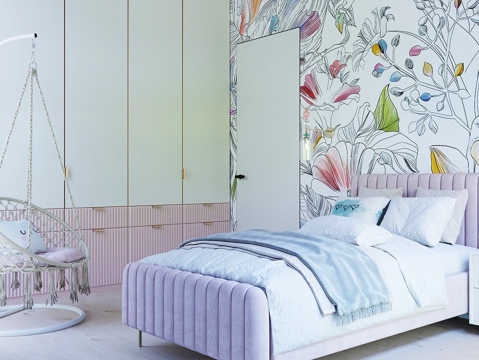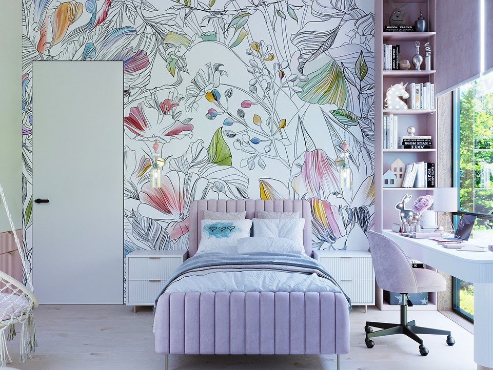 Детская комната с обоями из коллекции дизайнерских композиций «BLOSSOM». Игра цвета создает весенне-летнее настроение и придает пространству легкость.