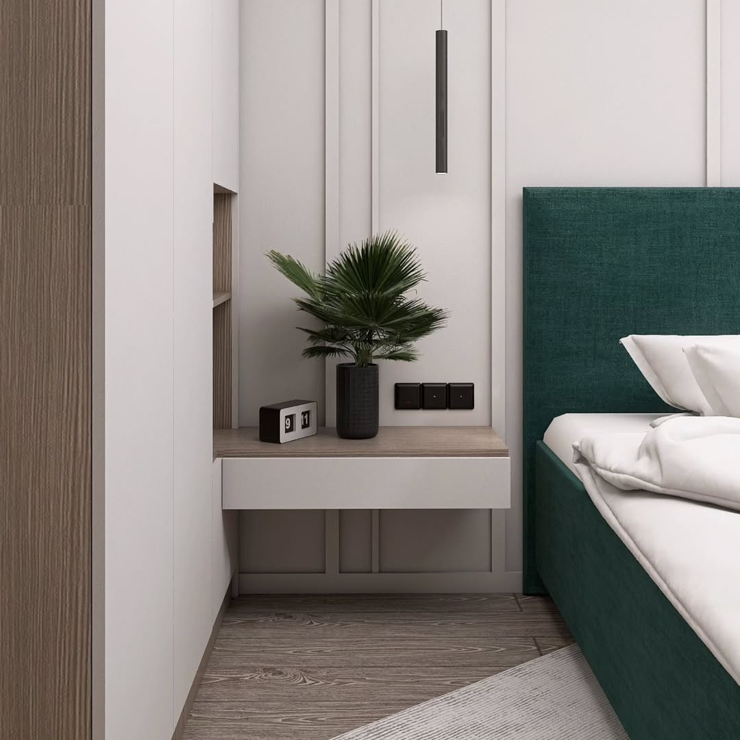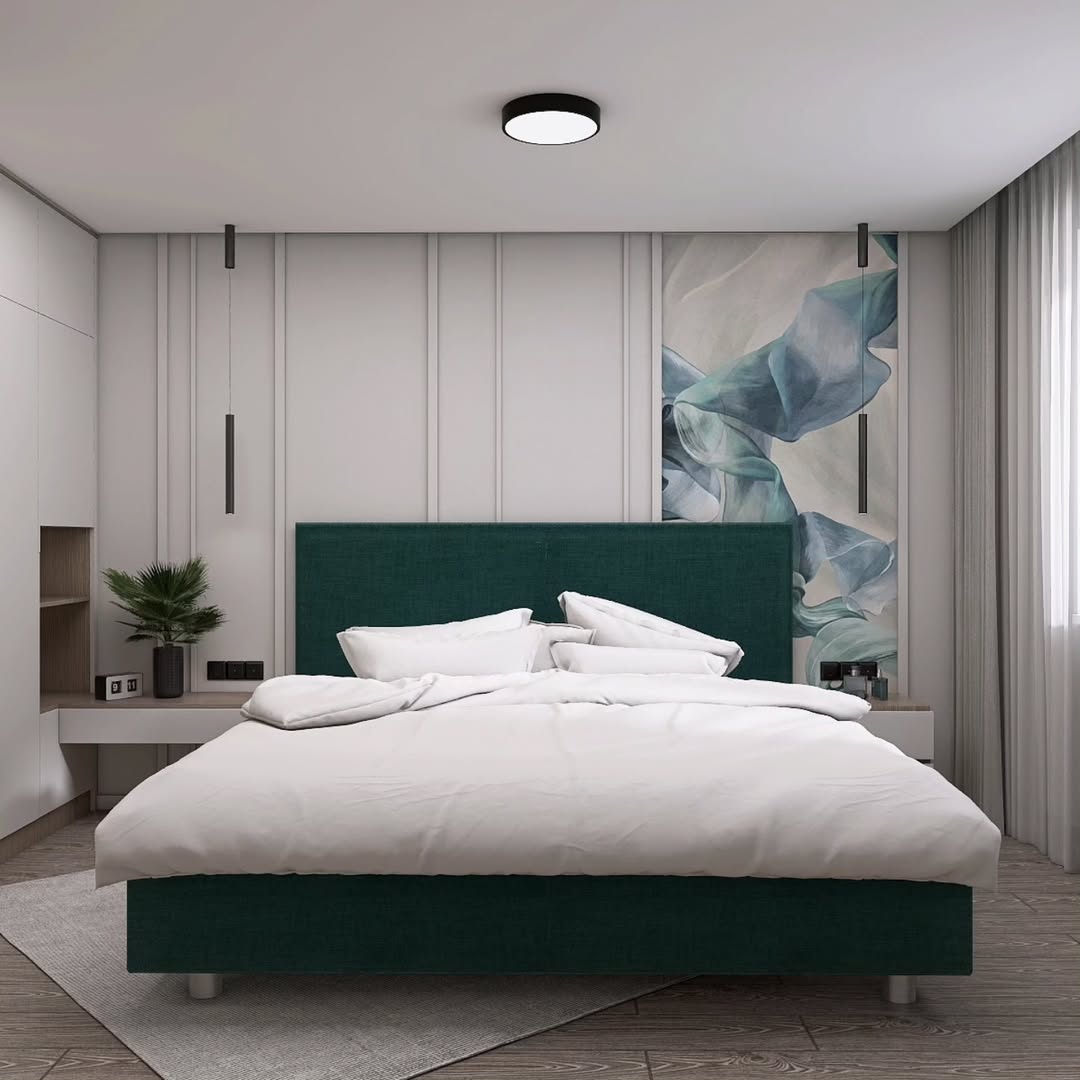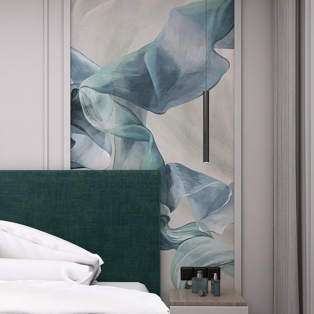 При этом зона сна всё еще выглядела пусто, а зеленый цвет кровати выглядел «одиноко». Чтобы исправить данную ситуацию, было принято решение локально использовать обои с рисунком или фреску.