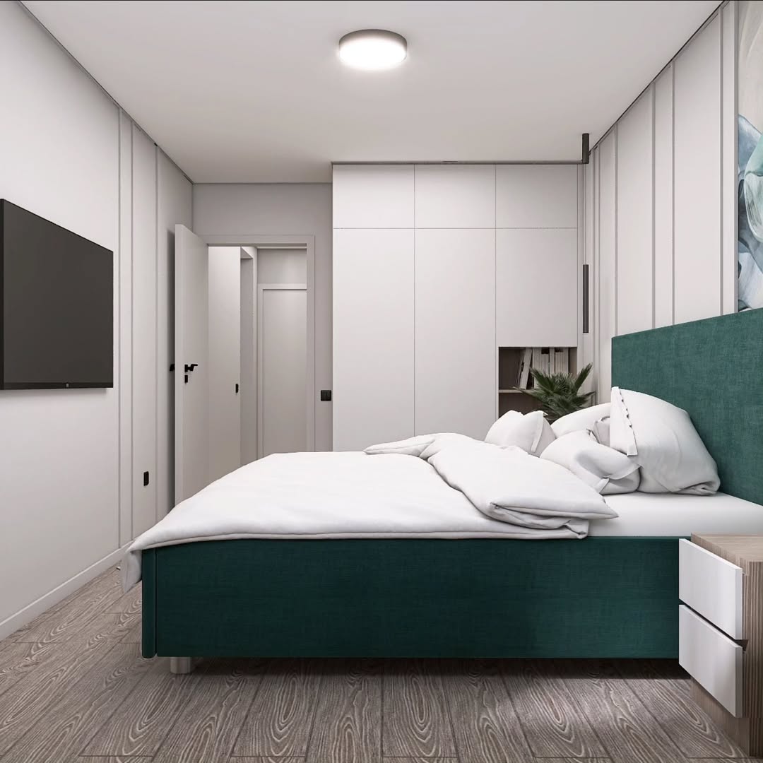 В спальне площадью 12 м² расположены большой вместительный шкаф, телевизор, напольная и подвесная прикроватные тумбочки, а также большая двухспальная кровать. Изголовье кровати, как и противоположная стена, были декорированы молдингами, визуально поднимающими потолок.