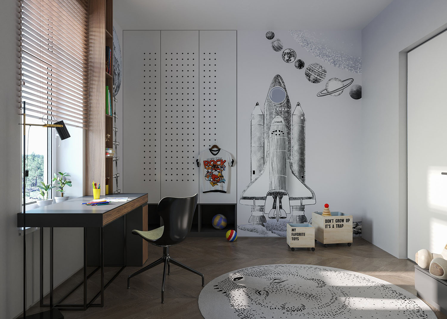 Проект интерьера всего дома был выполнен для молодой семьи в стиле минимализм. Комната для сына получилась функциональной, уютной и познавательной. Несмотря на то, что основные цвета белый и серый, интерьер не кажется холодным и аскетичным. Он живёт. Невозможно поверить, что в таком интерьере может вырасти человек без вкуса, цели и мыслей. Интерьер воспитывает и меняет человека. У ребенка «космическая» фамилия, поэтому не было вариантов выбрать другую тему.
