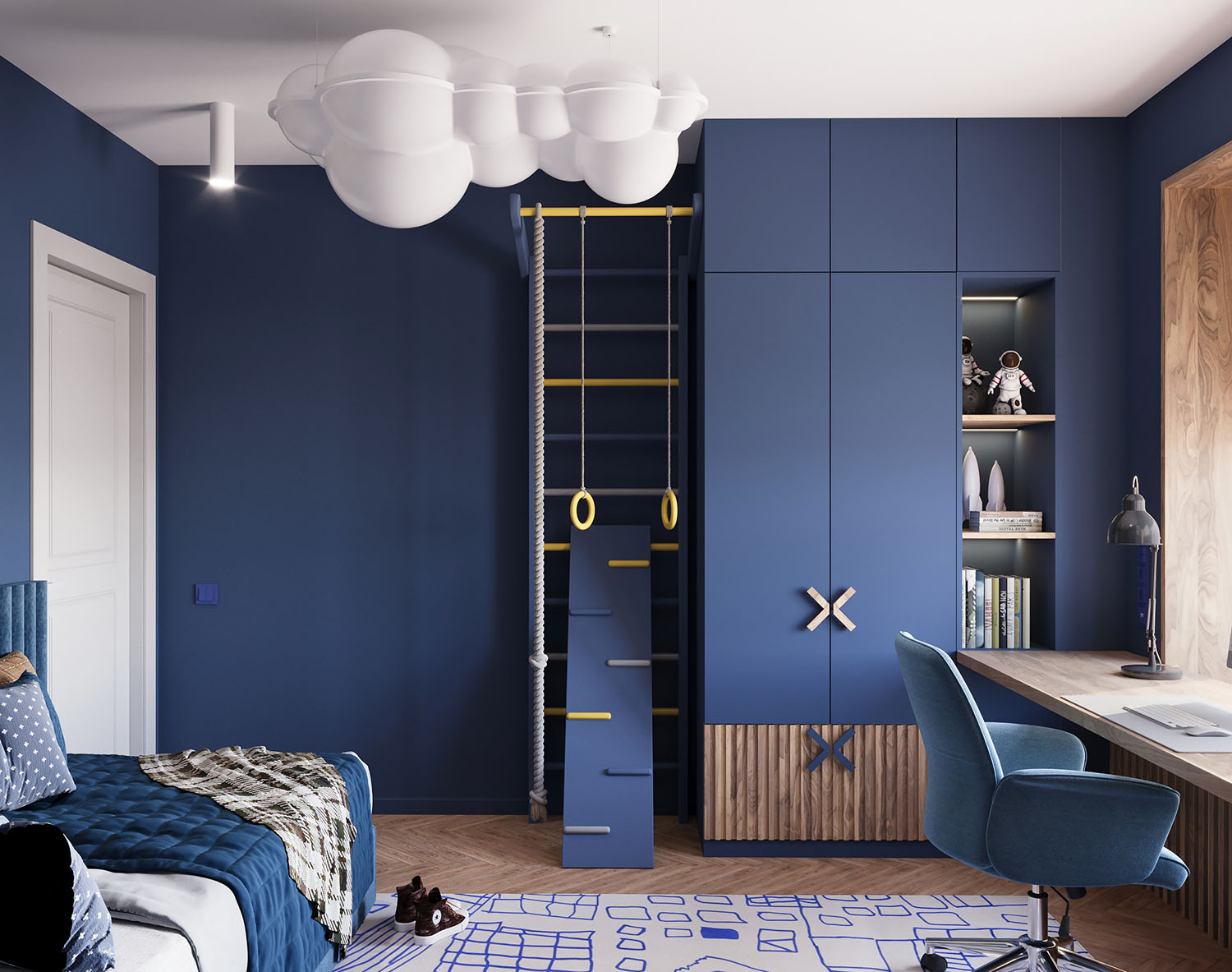 Детская комната площадью 11,7 м² для школьника в Москве. Обои из коллекции COSMOS. Мальчику очень нравится космос, поэтому все элементы и цветовую гамму выбрали соответствующую.