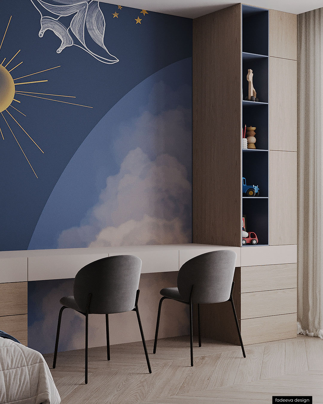 Проект детской комнаты, созданный для двух мальчиков, г. Владивосток. Увлечения ребят — море и космос. Вдохновением стали обои из коллекции COSMOS, которые отлично передали концепцию.