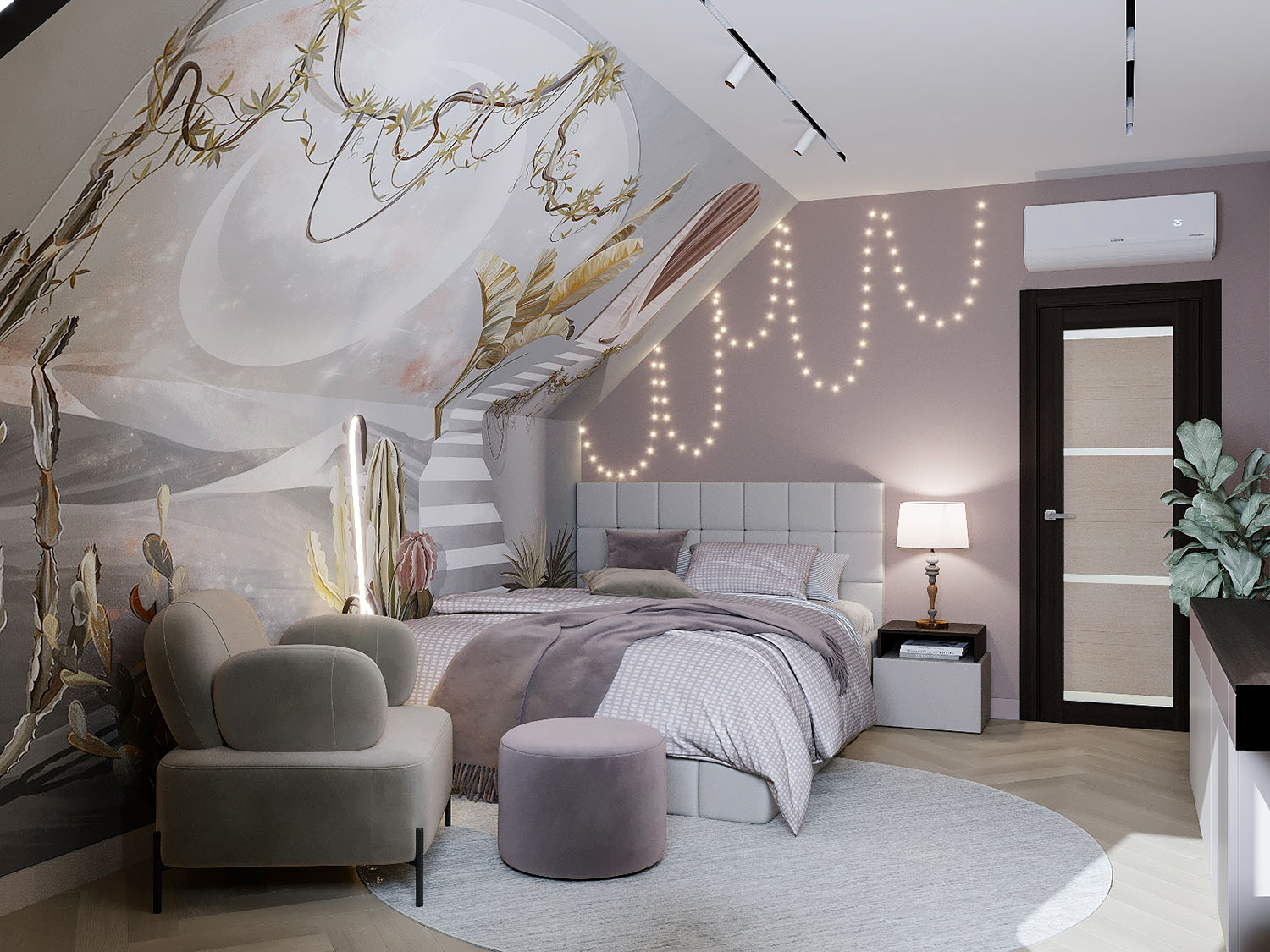 В этом проекте нужно было создать удобное и интересное пространство для творческой девушки, при этом сохранить существующие дверь, кровать и прикроватную тумбу.