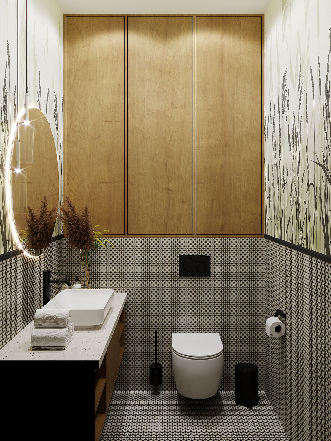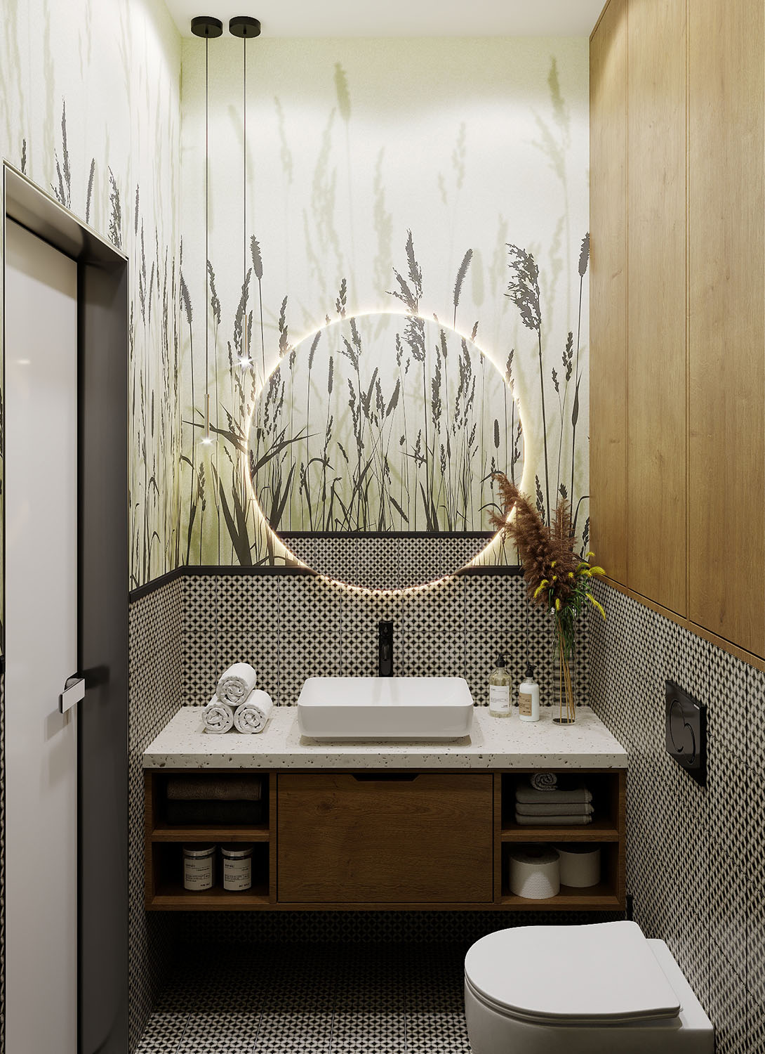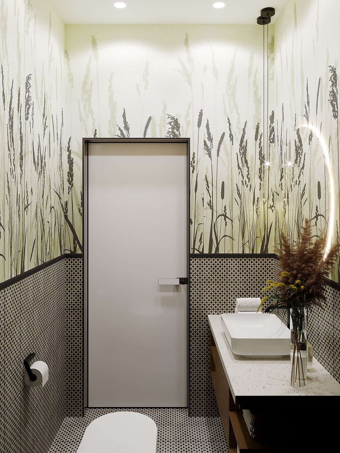 Представляем вам проект санузла, для которого заказчики выбрали обои из коллекции дизайнерских принтов «Essence». О чем эта коллекция? Она как первое воспоминание о лете и природных метаморфозах, когда совершается таинство пробуждения ранней весны. А сухоцветы, которые стоят ещё с прошлого года, на раннем рассвете позволяют вновь окунуться в настроение лета, которое мы для вас приготовили.