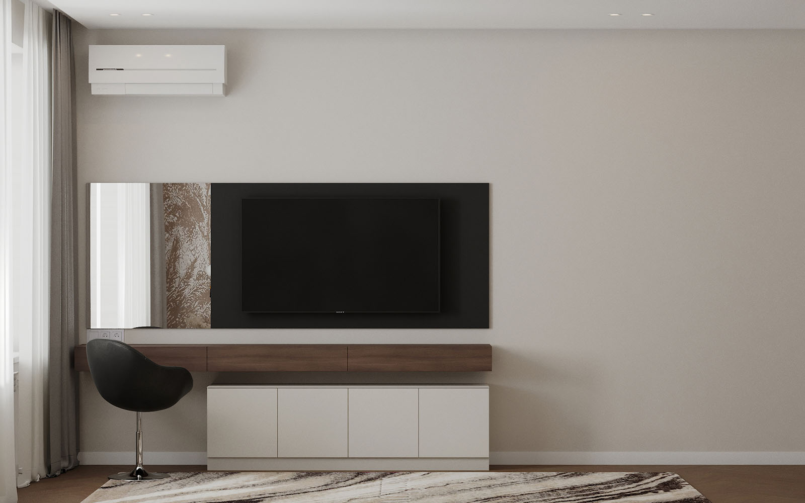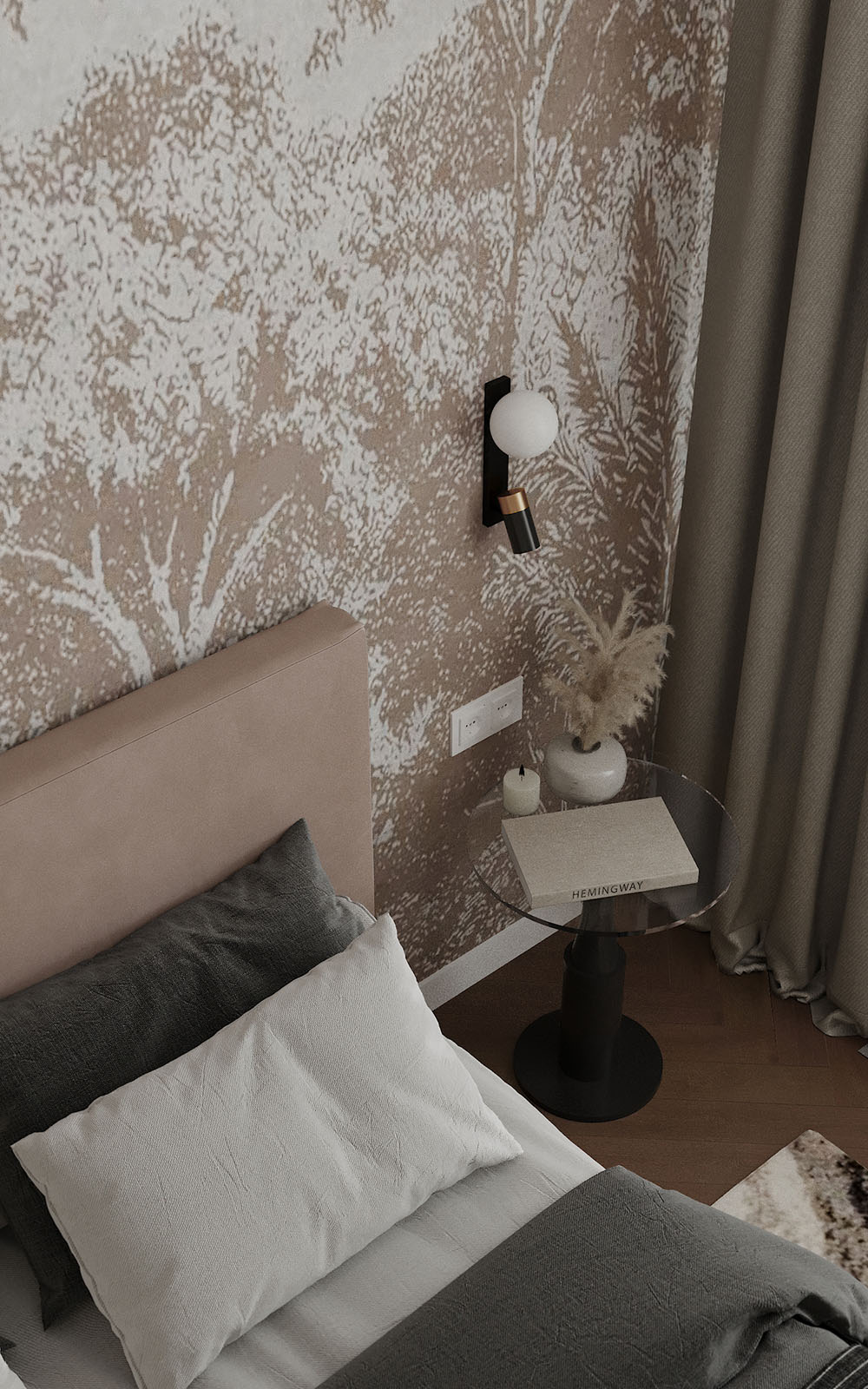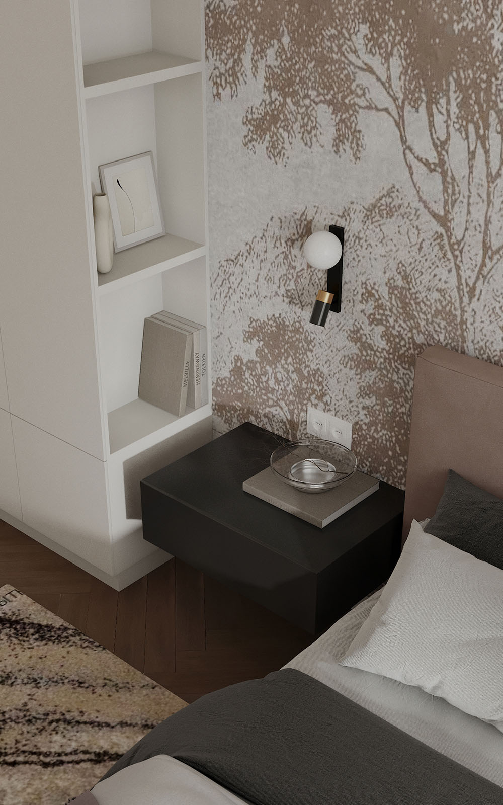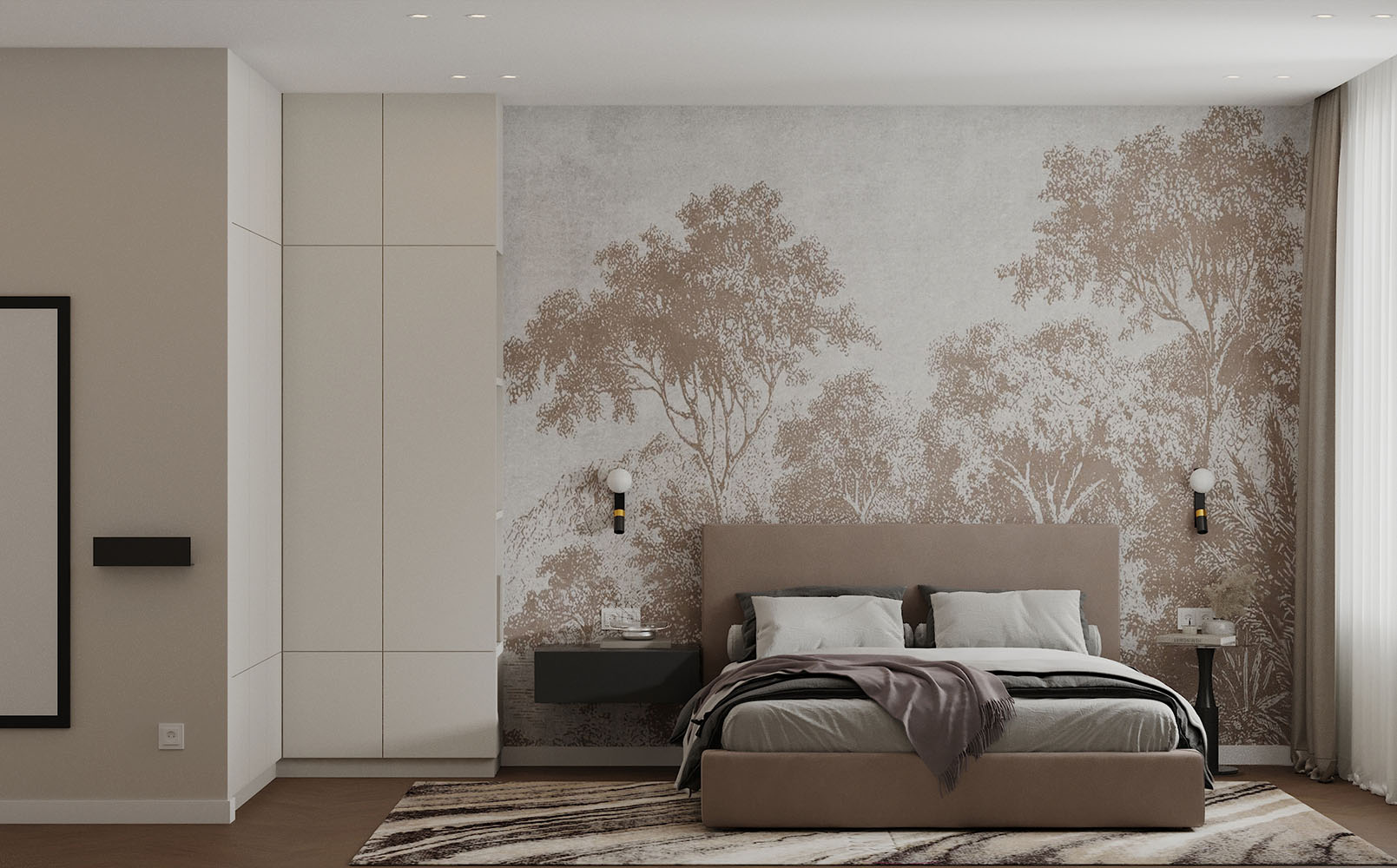 Проект разработан в городе Чебоксары для семьи с двумя детьми, ЖК Воскресенская горка. На рендерах нежная мастер-спальня с использованием контрастных элементов. В этой спальне приятно расслабится и провести и провести время. Обои с изображением леса создают особую атмосферу.
