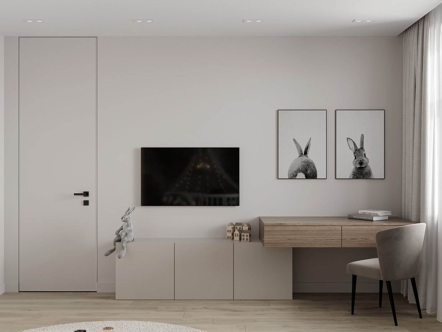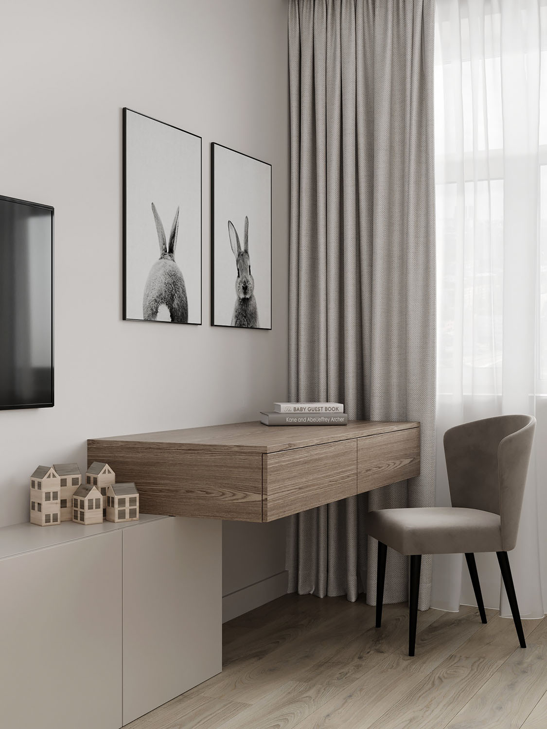 В данной детской будет жить ребёнок, пол которого ещё не известен. Именно поэтому подбор цветового решения был универсальным и легко может быть дополнен акцентным цветом, будь то мальчик или девочка. Кровать-люлька легко заменяется на более подростковую. Ведь для нее заранее заложено место!