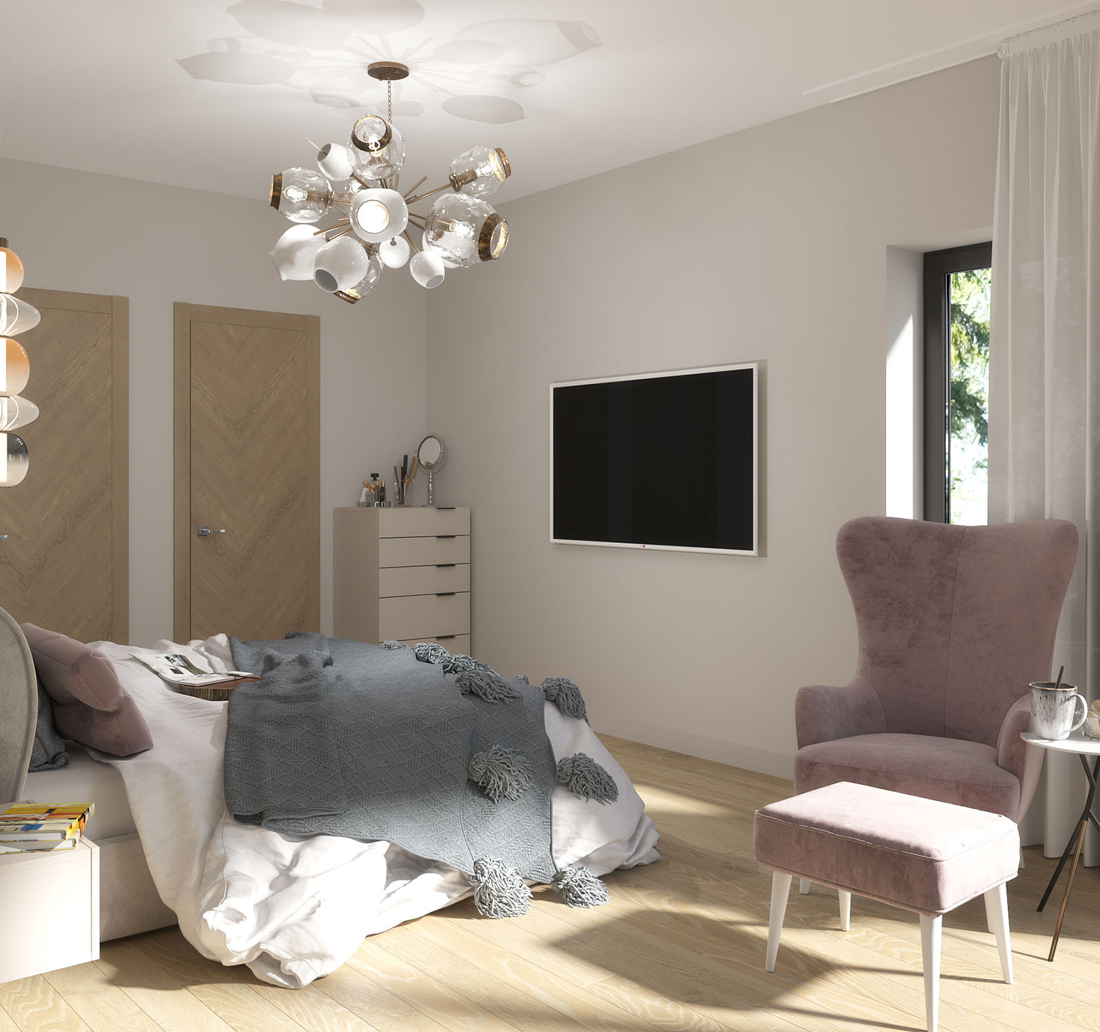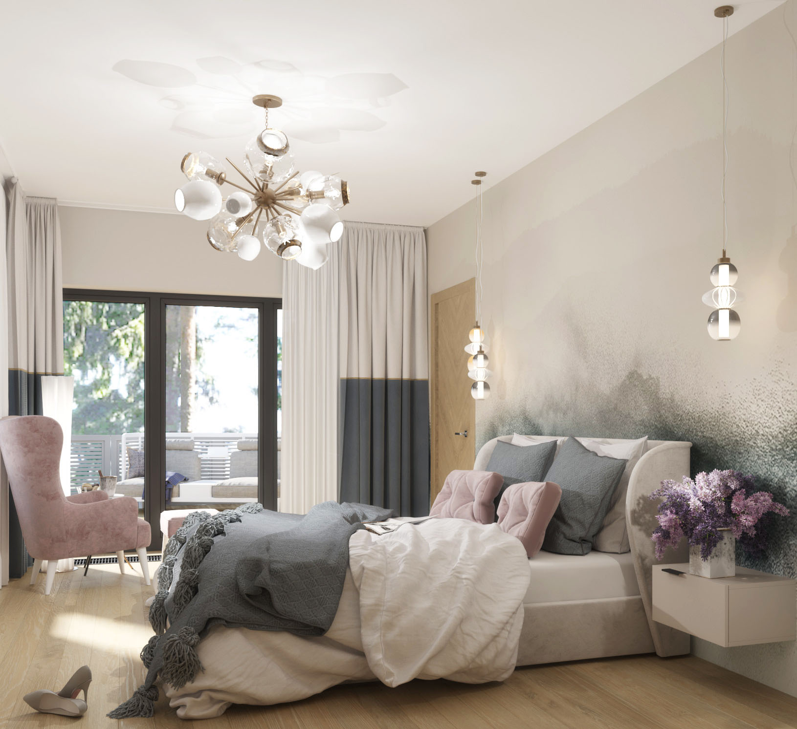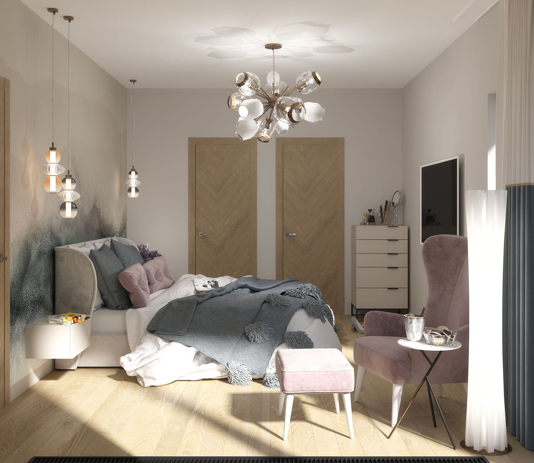 Спальня из проекта загородного дома в Санкт-Петербурге. Дом для молодой семьи с двумя девочками проектировался для постоянного проживания. Современность и простота - то, к чему стремятся многие сейчас: бетонный потолок, гладкая поверхность стен и элементы дерева в декоре для смягчения контрастных и довольно «холодных» материалов.