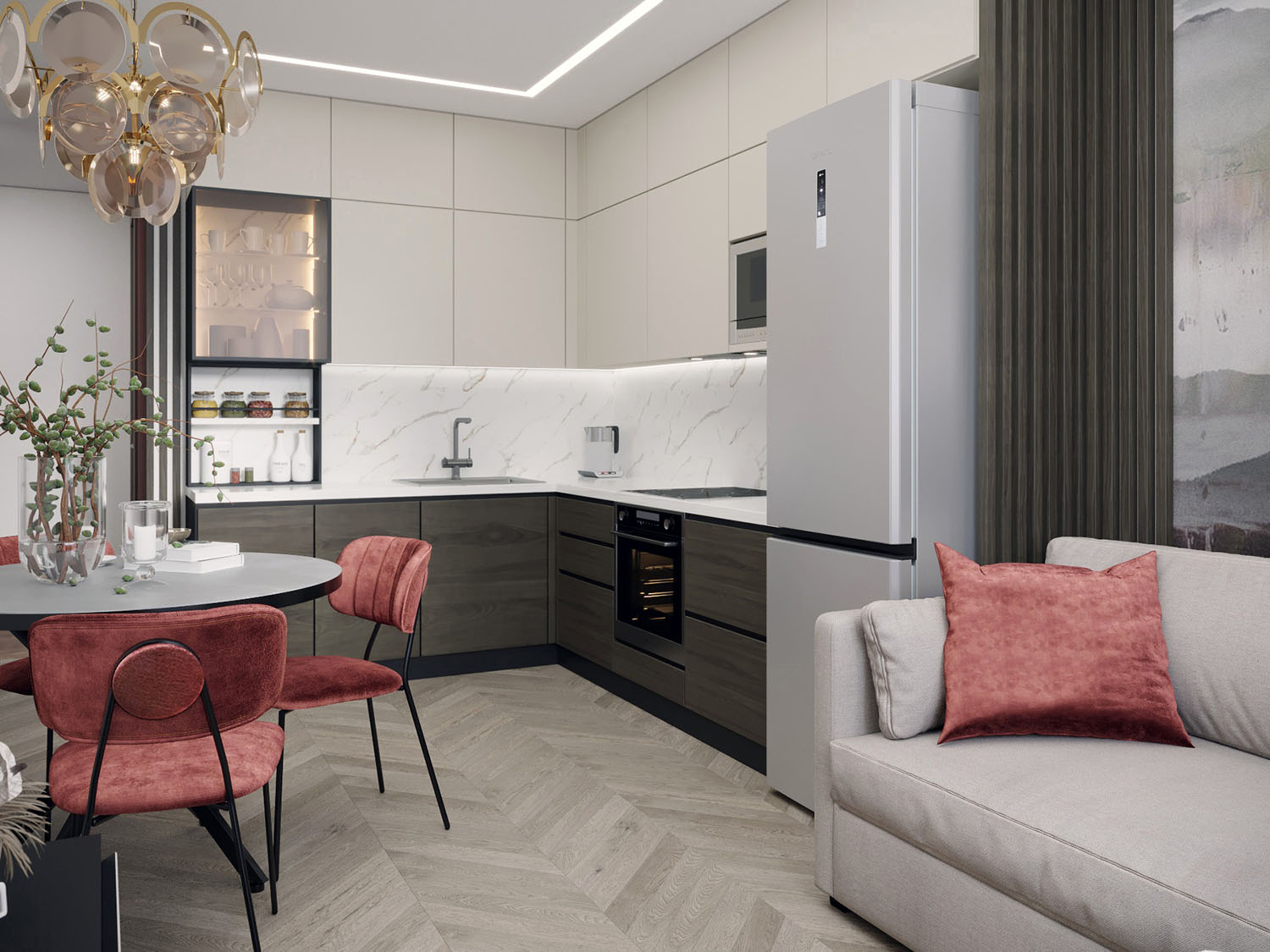 Проект кухни-гостиной, задачей которого было объединить кухню и зону с диваном, но при этом сохранить четкое зонирование, чтобы, отдыхая на диване, не чувствовать себя на кухне. Поэтому решили отделить кухонный гарнитур реечками и добавить дизайнерские обои на стену за диваном. Рисунок выбрали не яркий, а такой, чтобы добавить воздуха и пространства. Цветовые акценты добавили в мебели: столик, стулья.