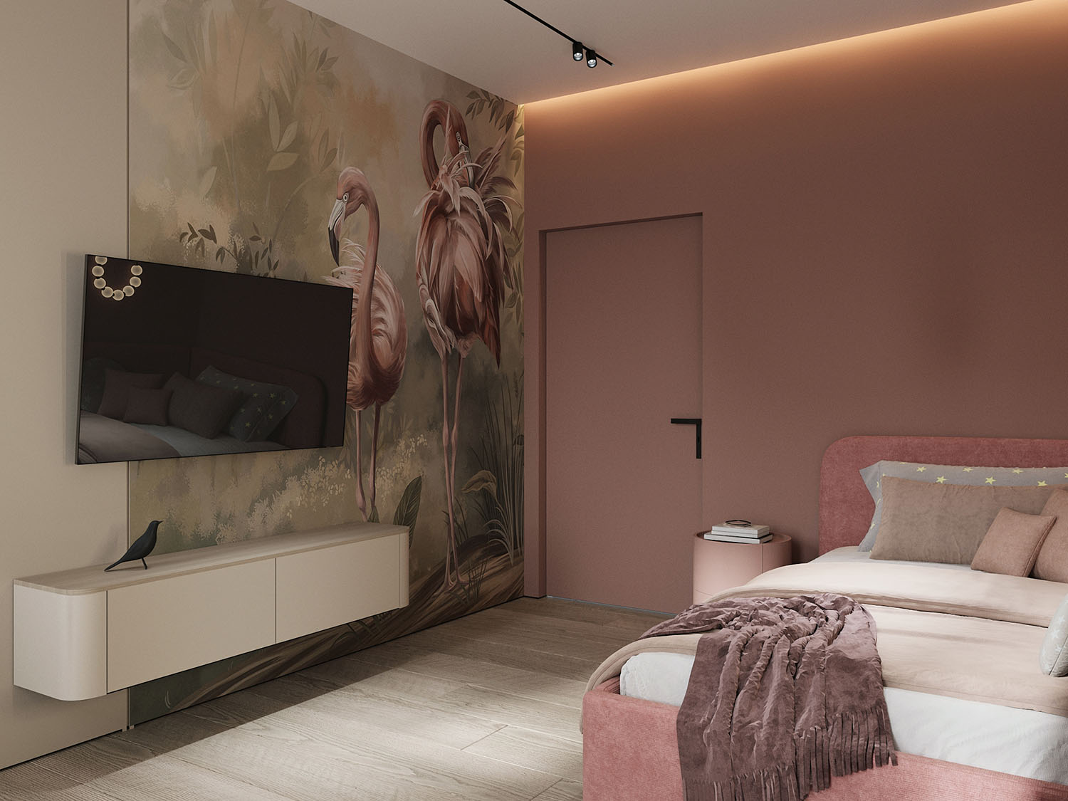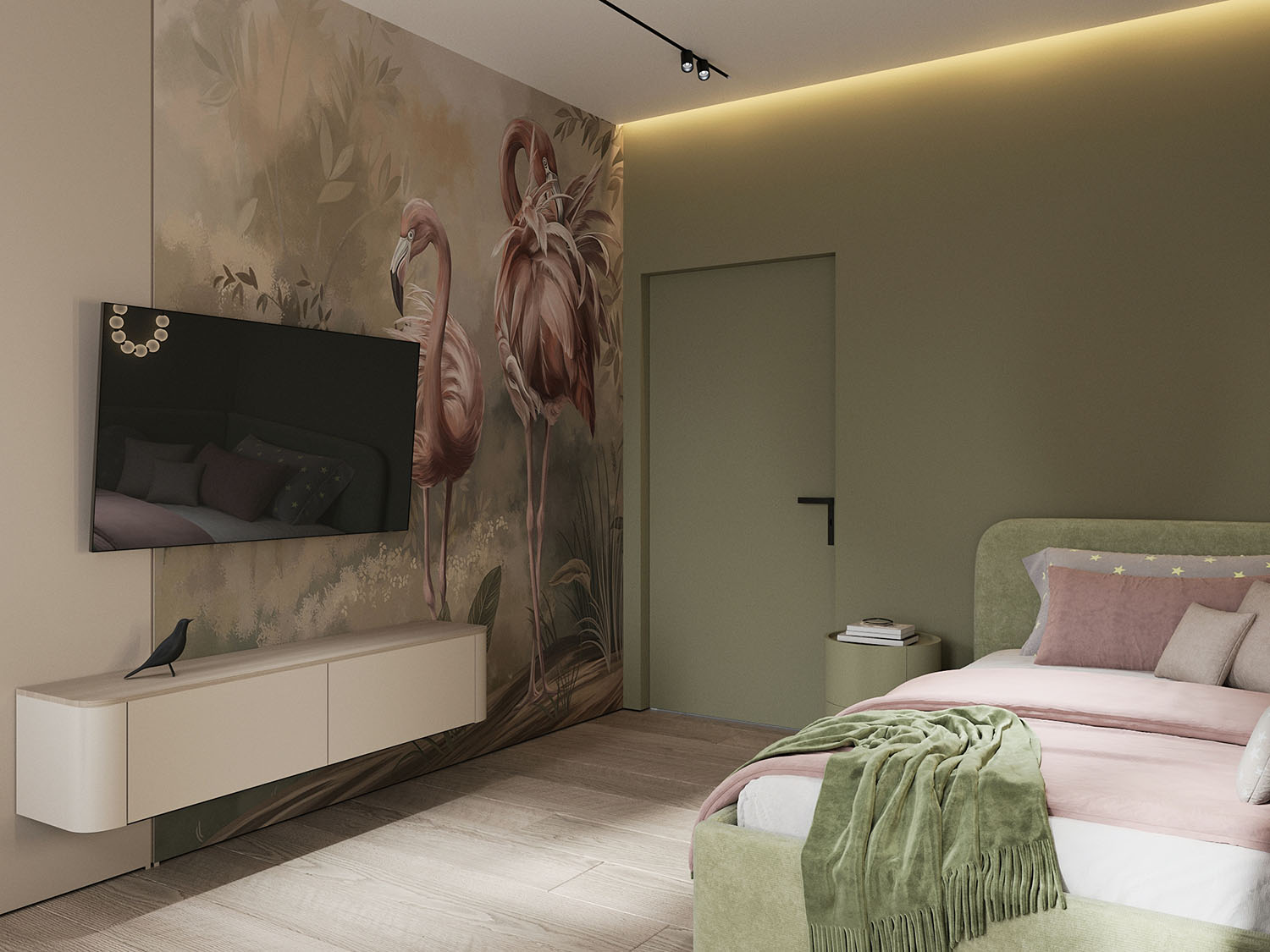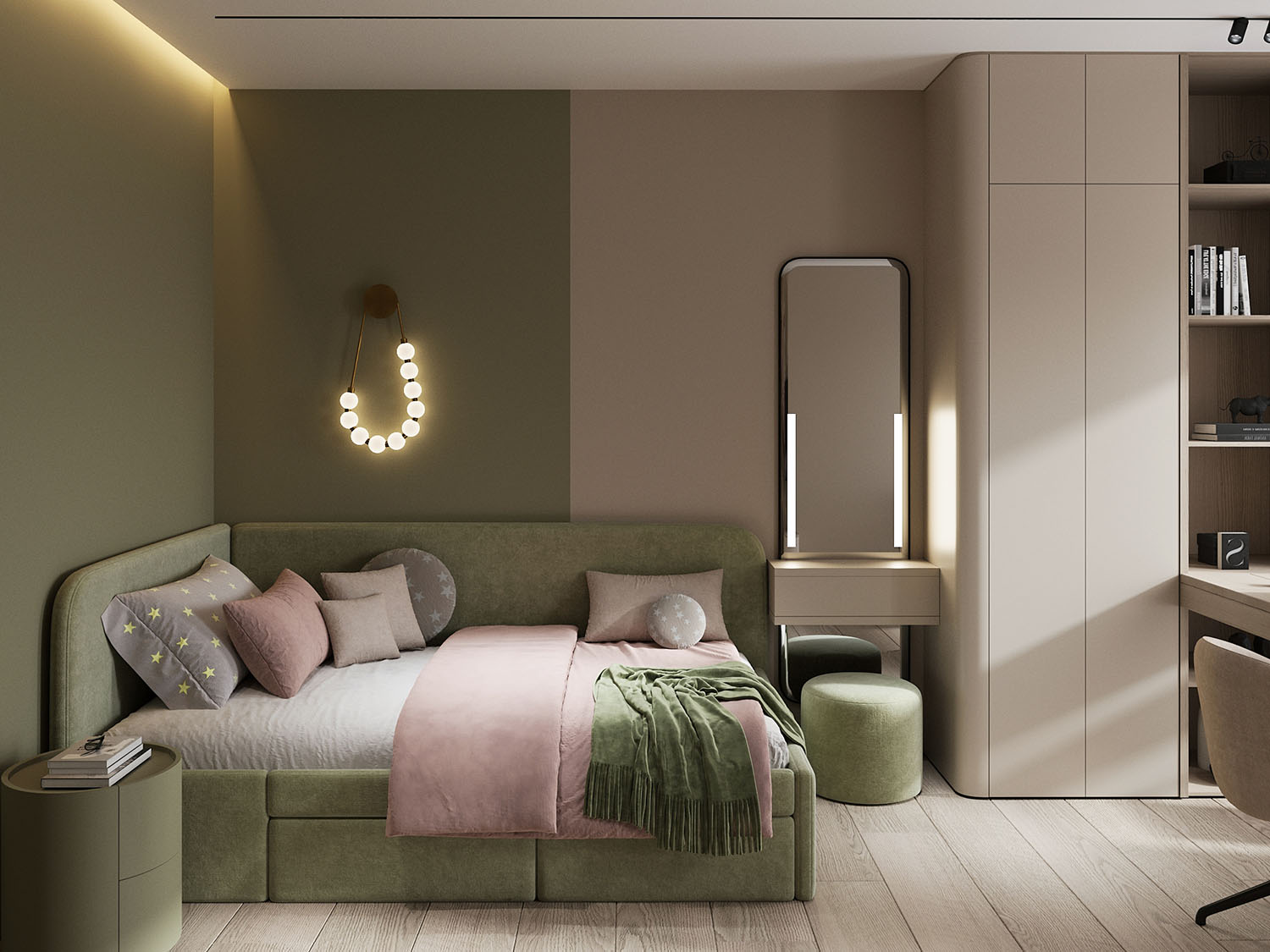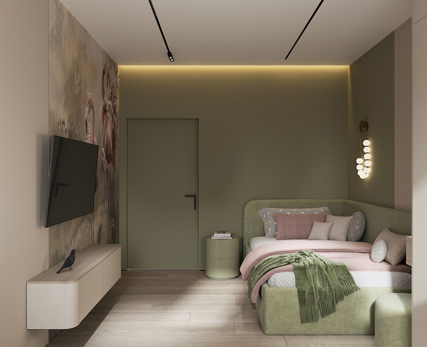 Детская делалась для девочки 10 лет с заделом на будущее. В маленькой комнате смогли уместить всё и даже сделать акцент в виде обоев ФАУНА ЗУМ / FAUNA ZOOM.