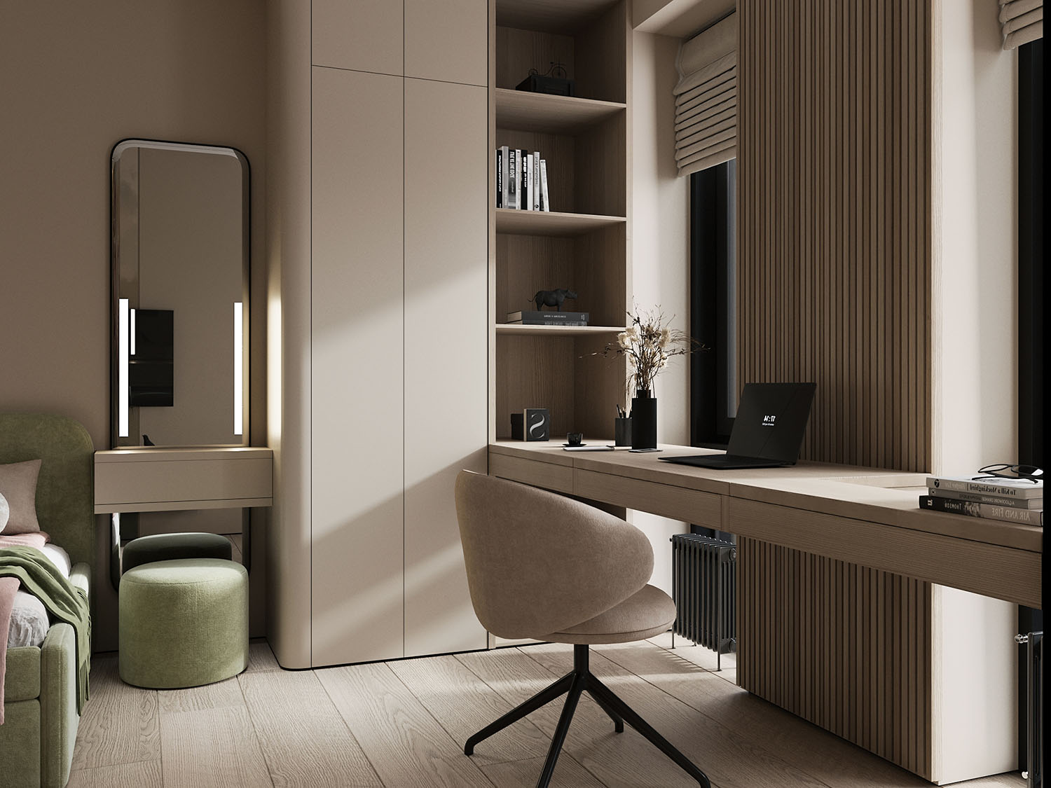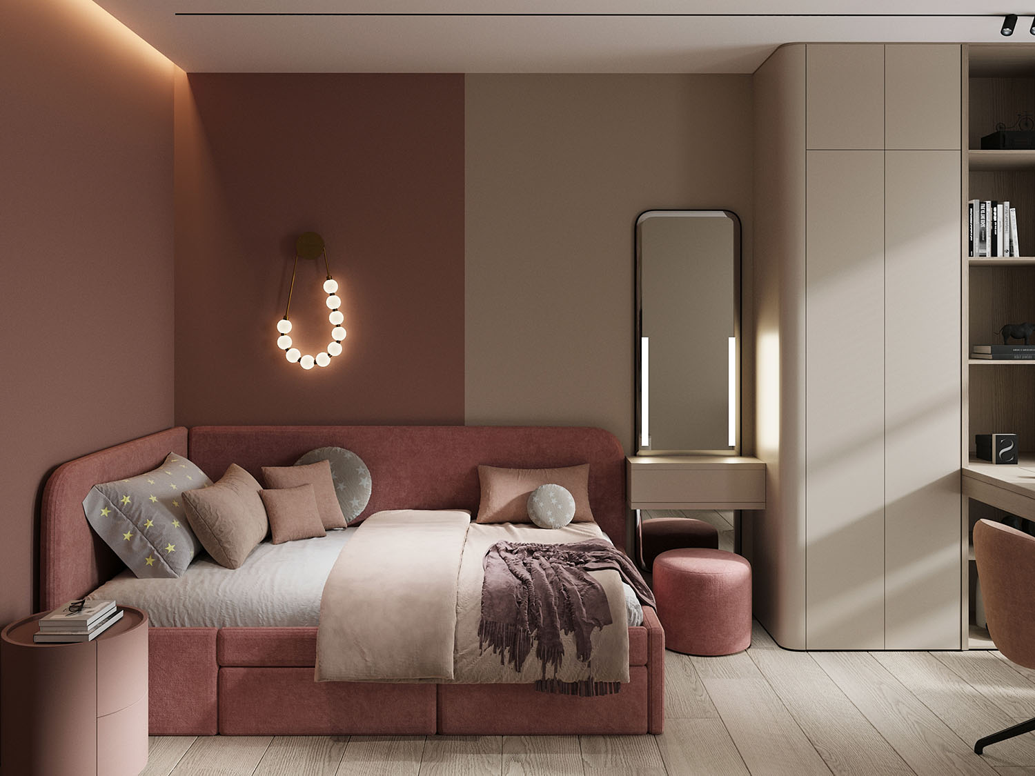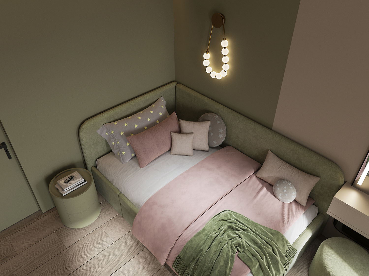 Детская делалась для девочки 10 лет с заделом на будущее. В маленькой комнате смогли уместить всё и даже сделать акцент в виде обоев ФАУНА ЗУМ / FAUNA ZOOM.
