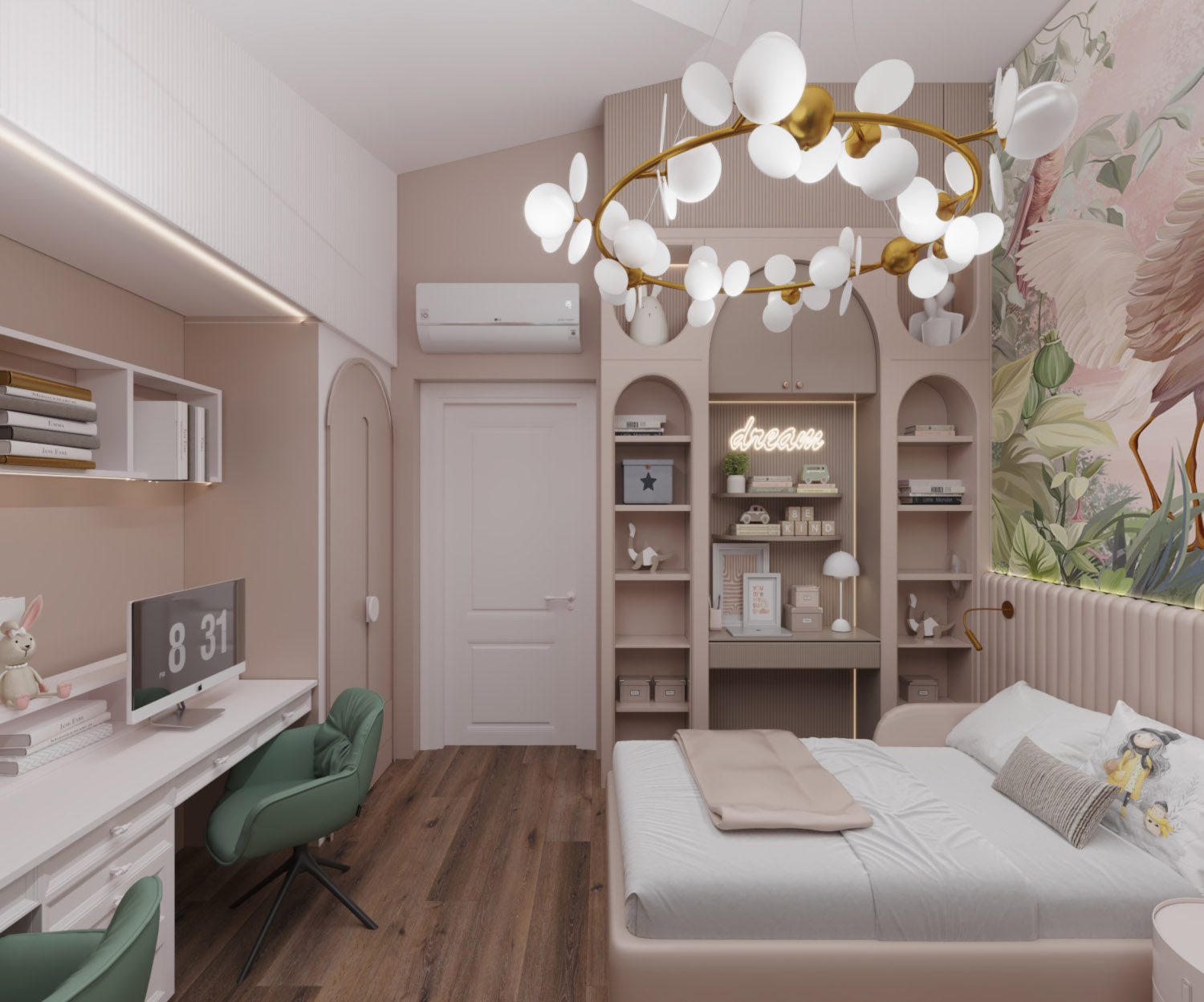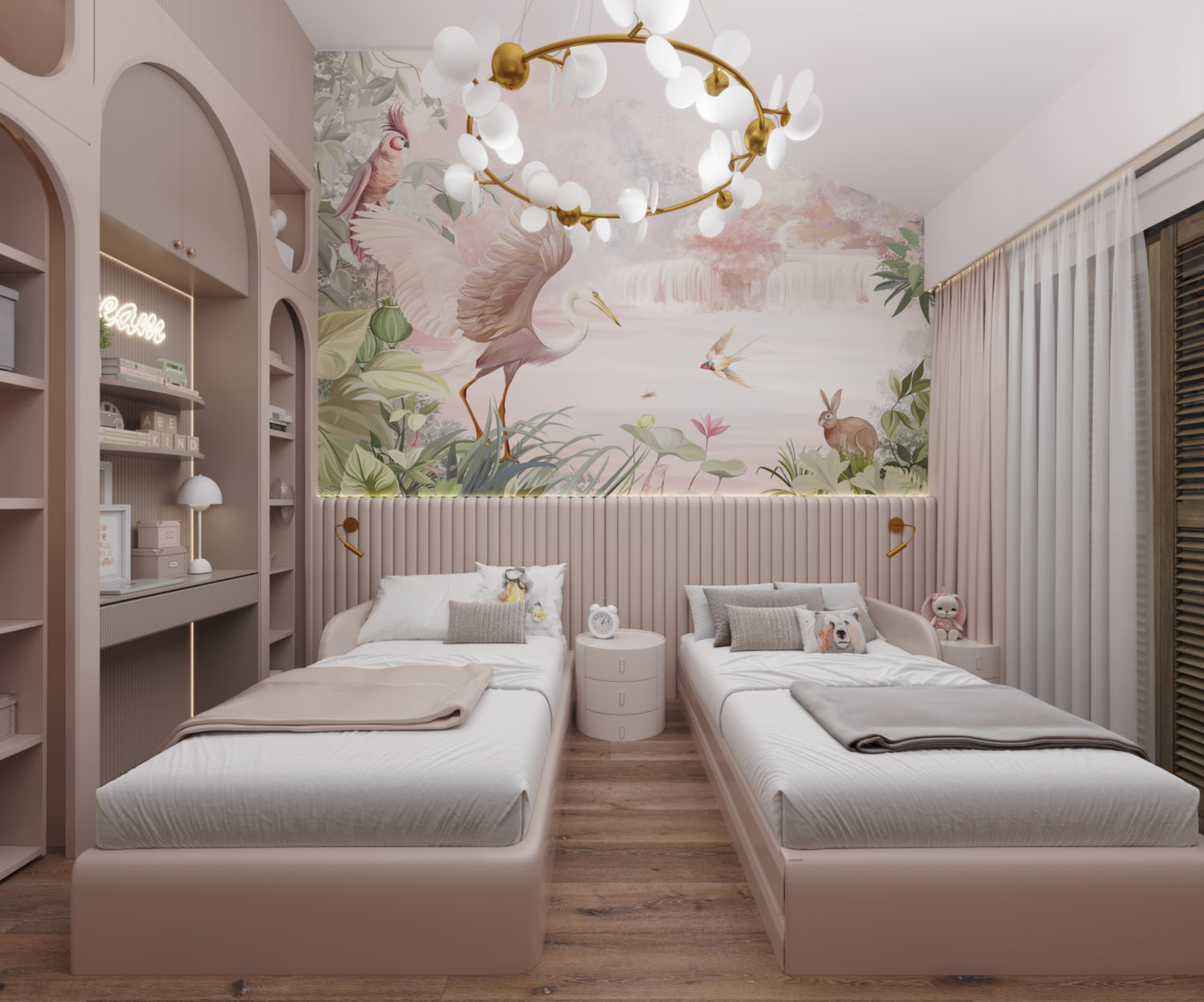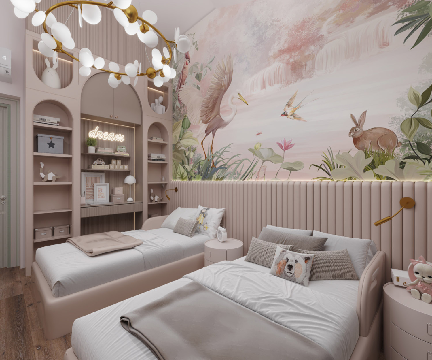 Эта очаровательная детская комната создана для двух сестрёнок 5 и 7 лет. Перед дизайнерами стояла непростая задача: обустроить функциональное и стильное пространство, которое идеально подойдёт и для игр, и для обучения.