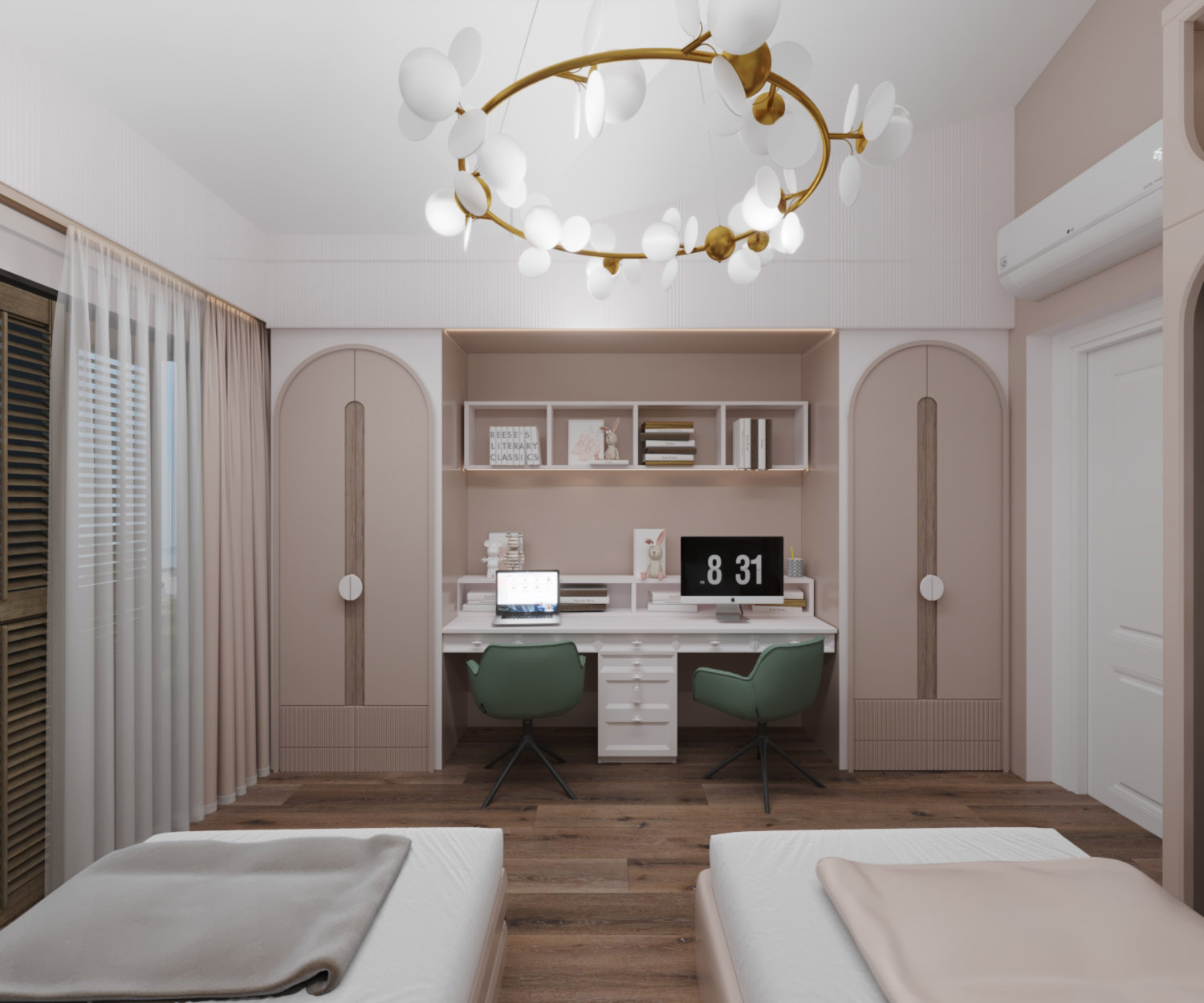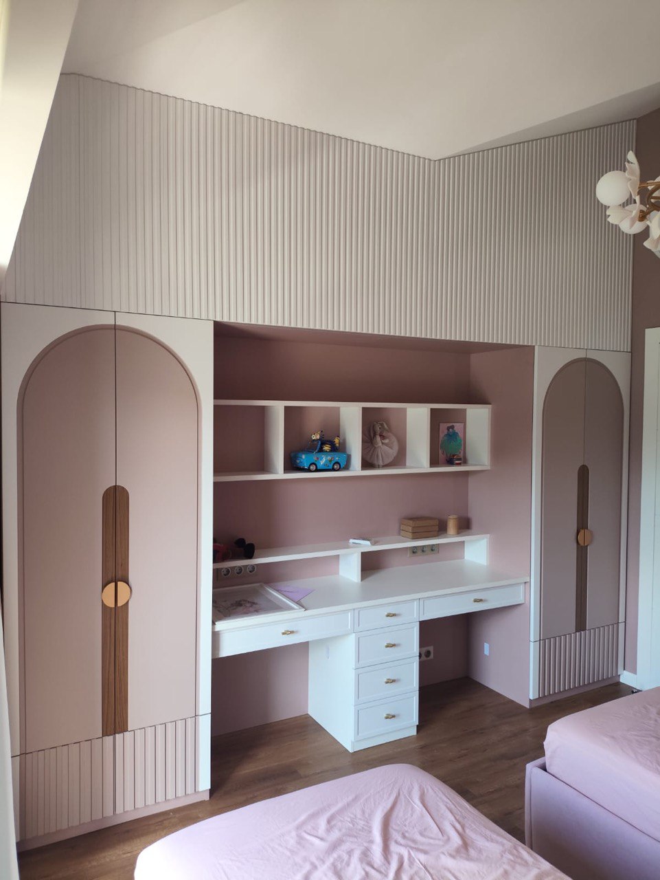 Удобные рабочие столы органично встроены в мебельный ансамбль, создавая идеальные условия для первых уроков и творческих занятий.
