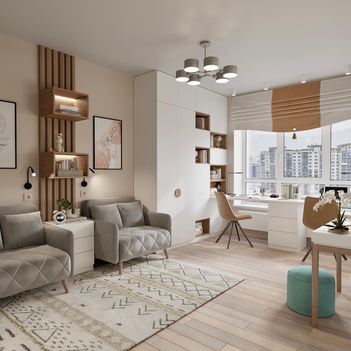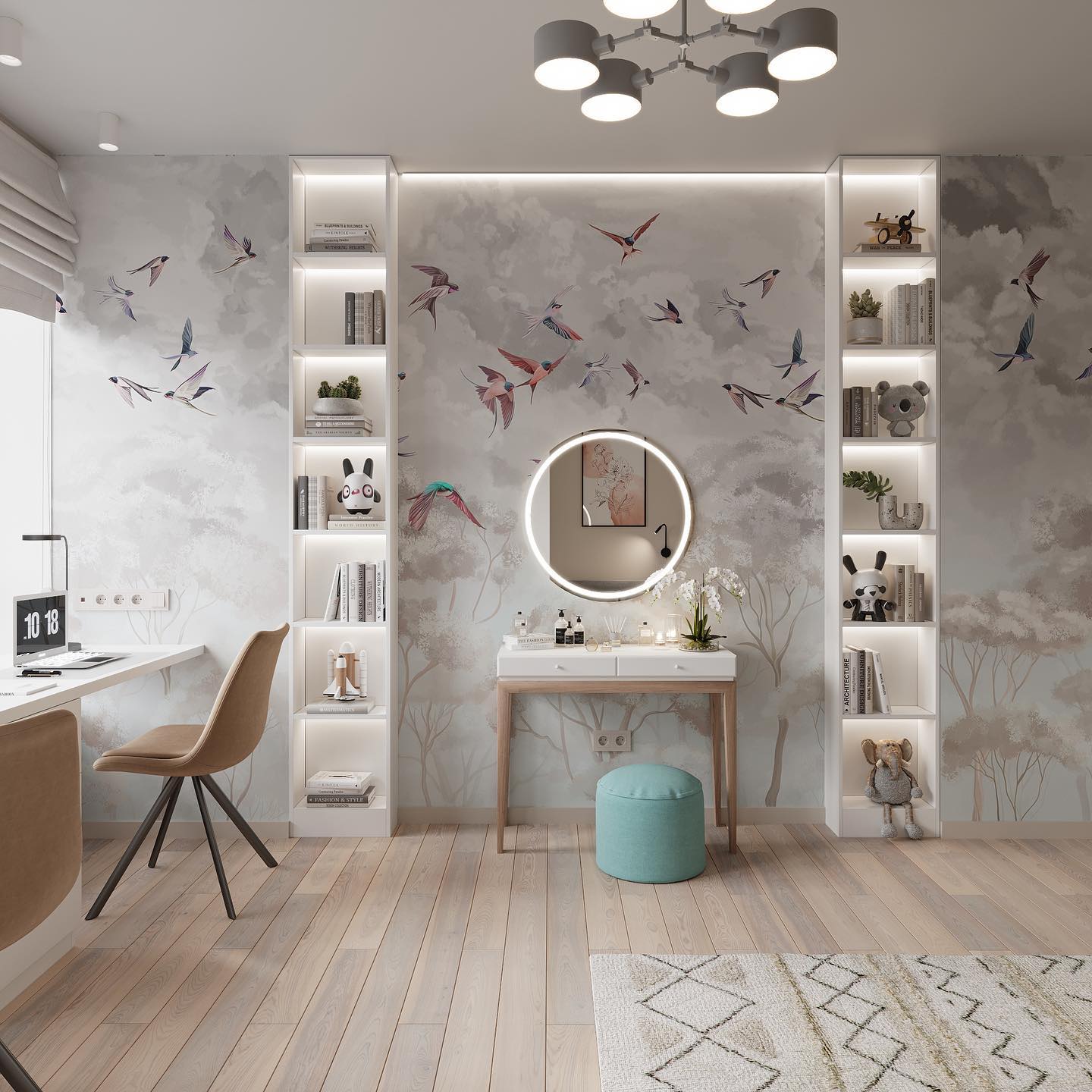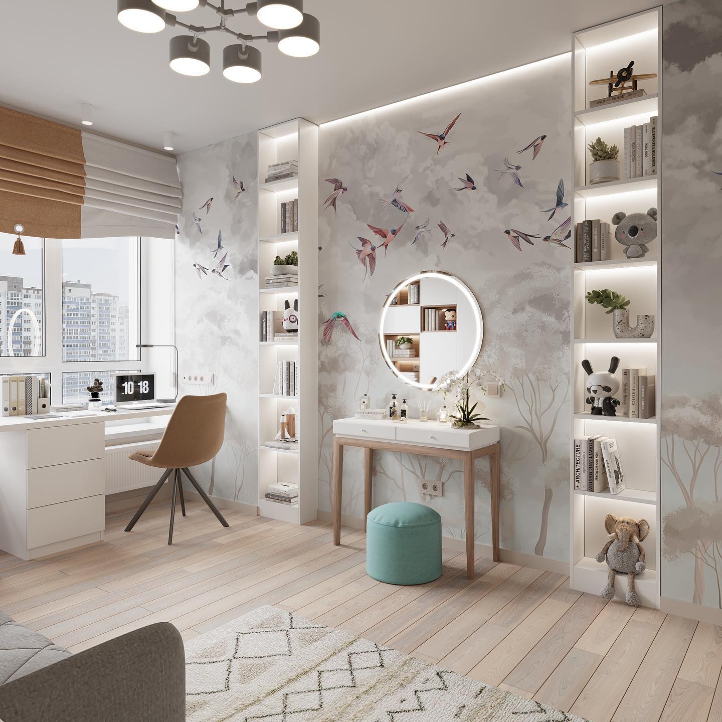 Детская комната для девочки Ксюши. В проекте были учтены все ее пожелания: обои и оттенки выбирала она и итоговое решение ей тоже понравилось. Важно обращать внимание, что хочет именно ребёнок, особенно в подростковом возрасте. Вторая кровать для подружек, если кто-то захочет остаться, ну и для братика, который ещё не подрос. Комната получилась нейтральная, декор и переставную мебель можно заменить со временем.