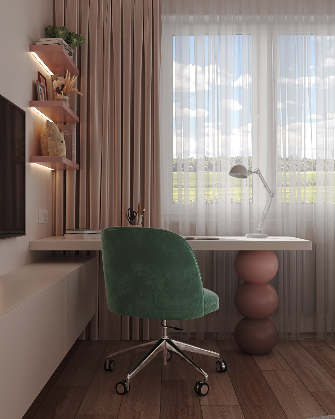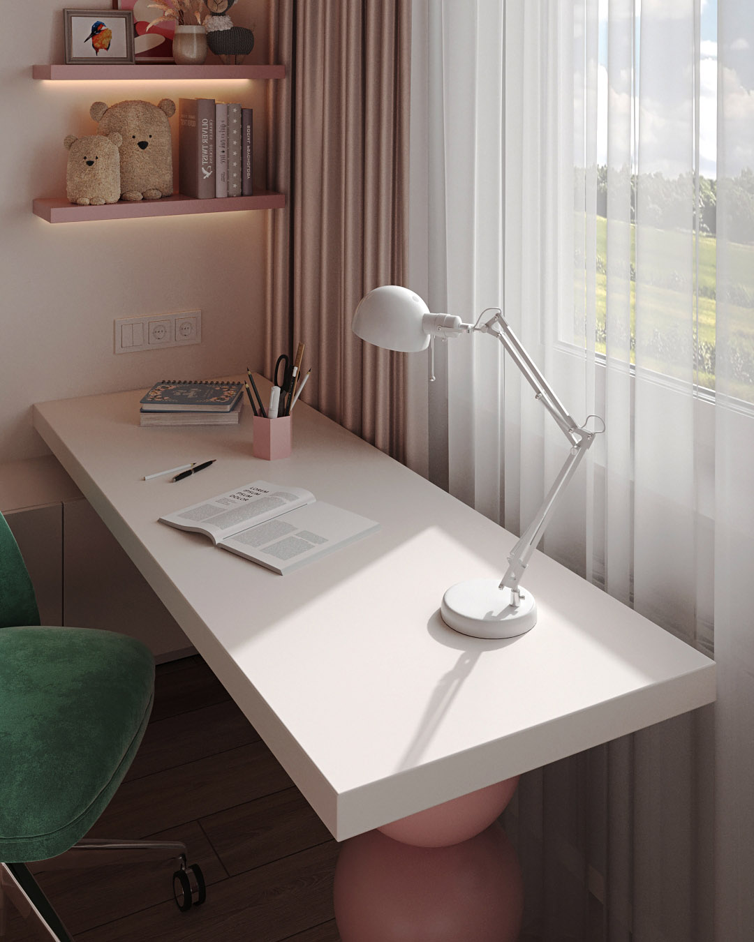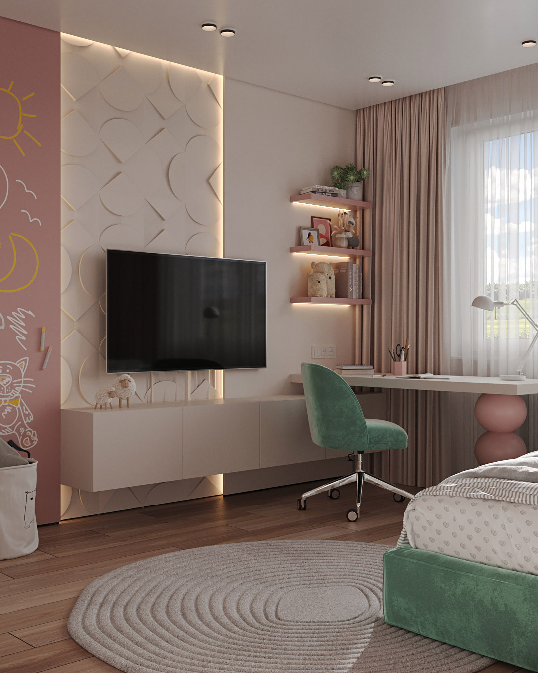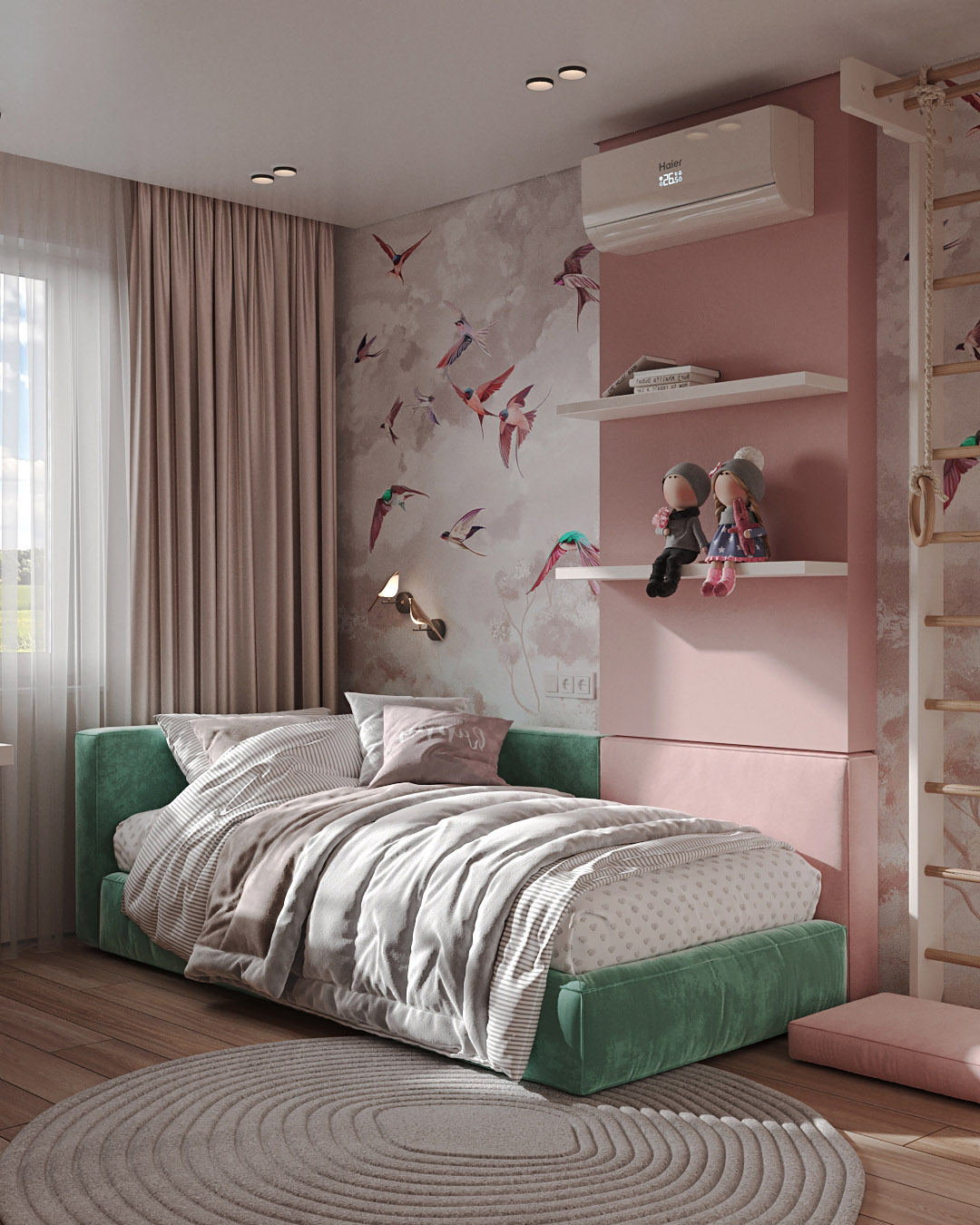 Детская комната площадью 15,5 м² для девочки 6 лет. Планировка в данном проекте получилась очень удобной и функциональной. При этом удалось сохранить достаточно пространства в комнате. Обои из коллекции Fauna замечательно дополнили и преобразовали пространство в зоне кровати. Так, в частном доме общей площадью 150 м² в городе Витебск Республика Беларусь маленькая девочка в скором времени обзаведется своим уютным и стильным интерьером.