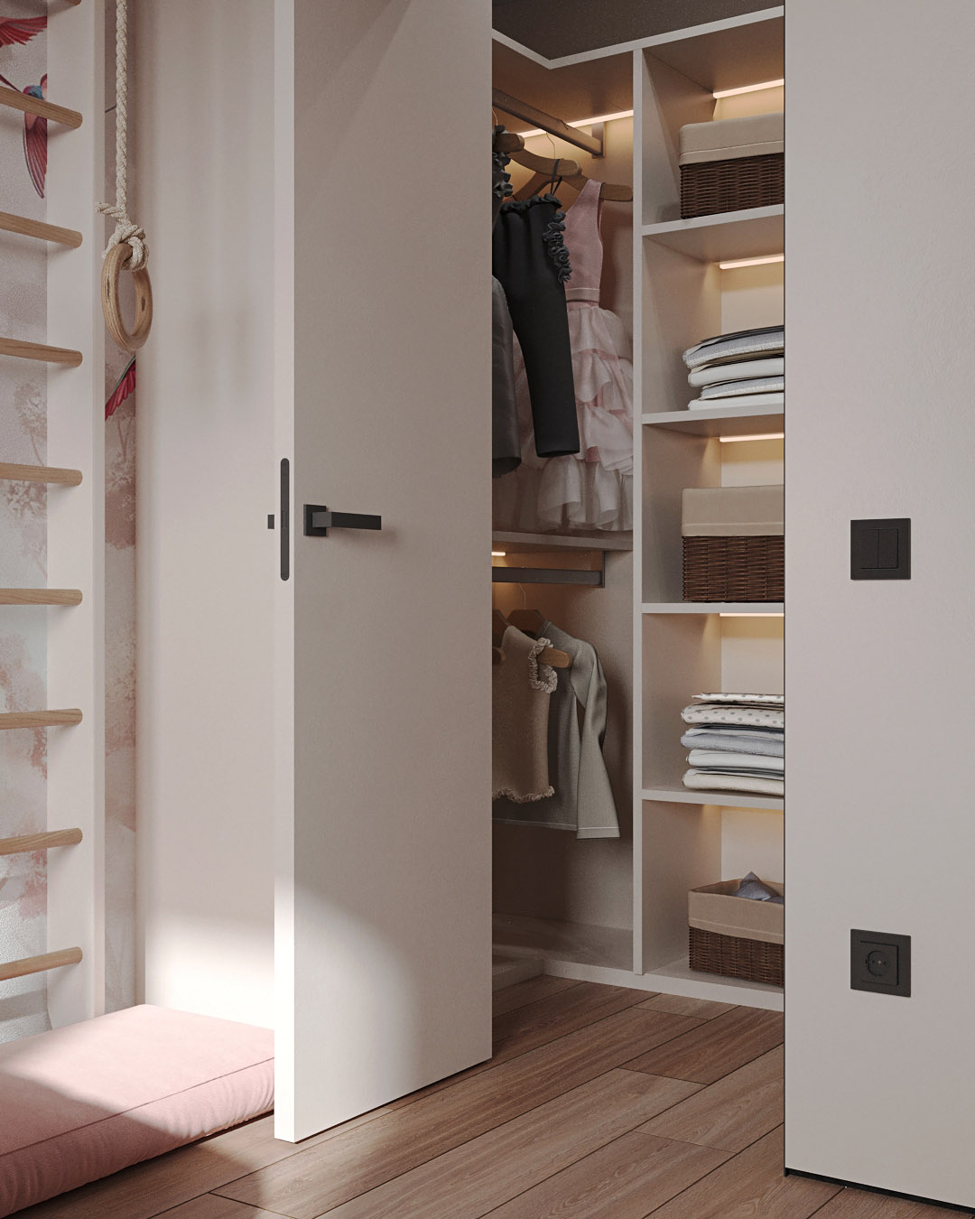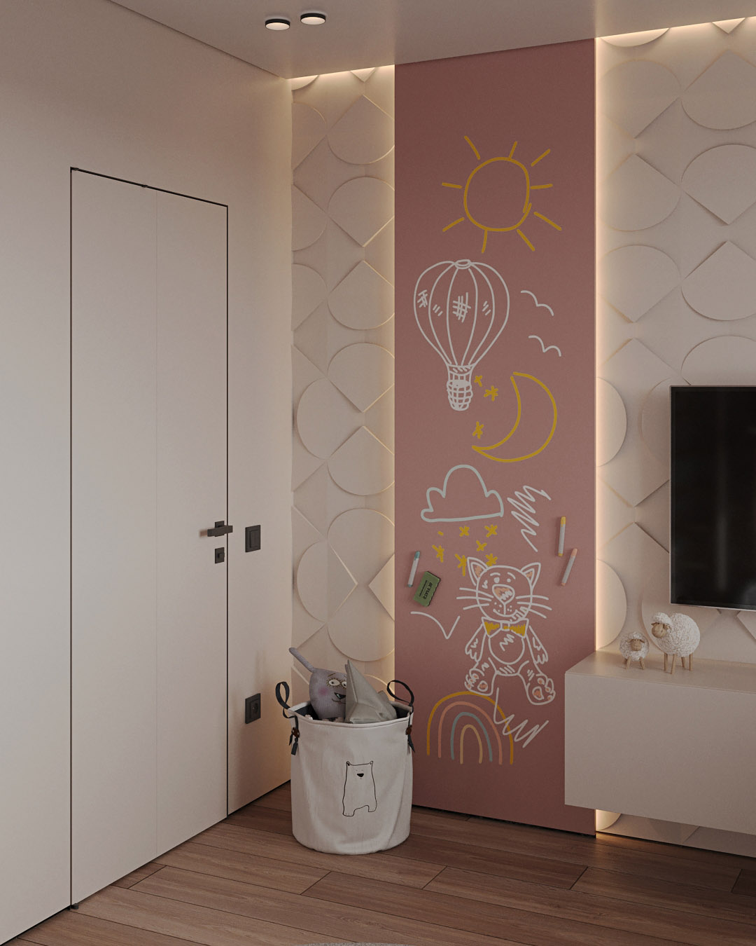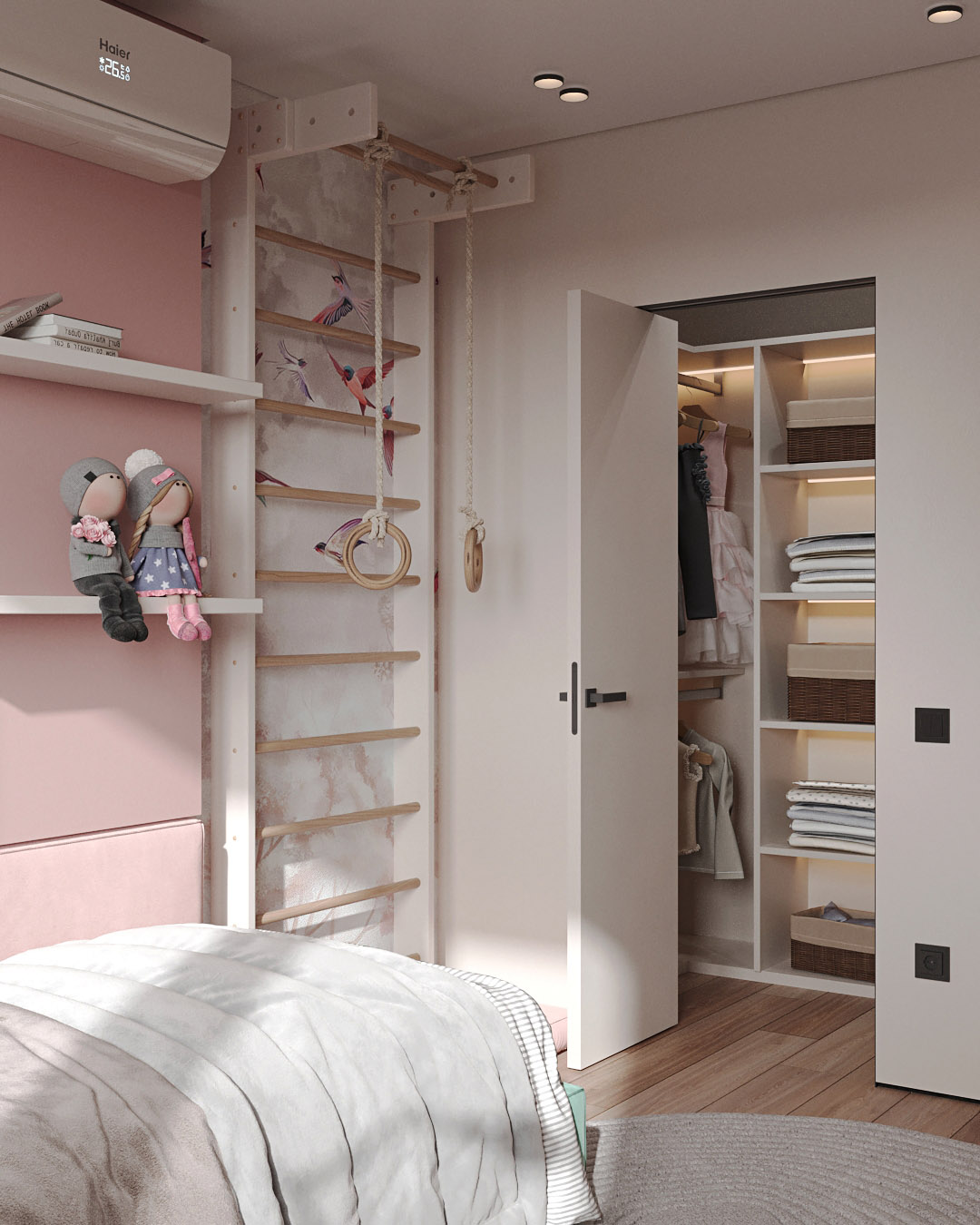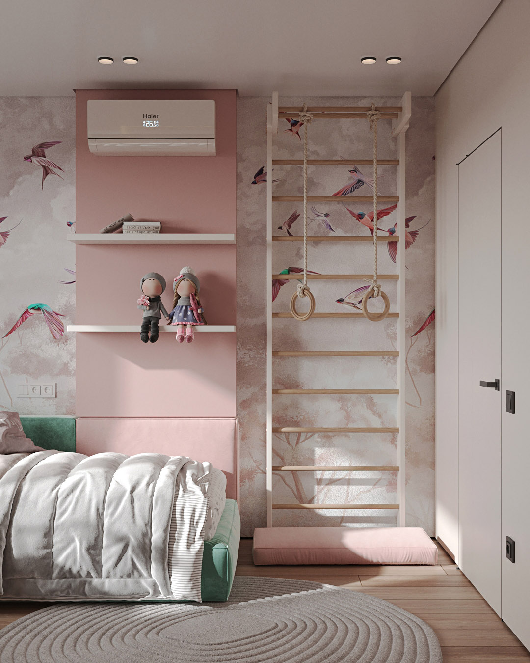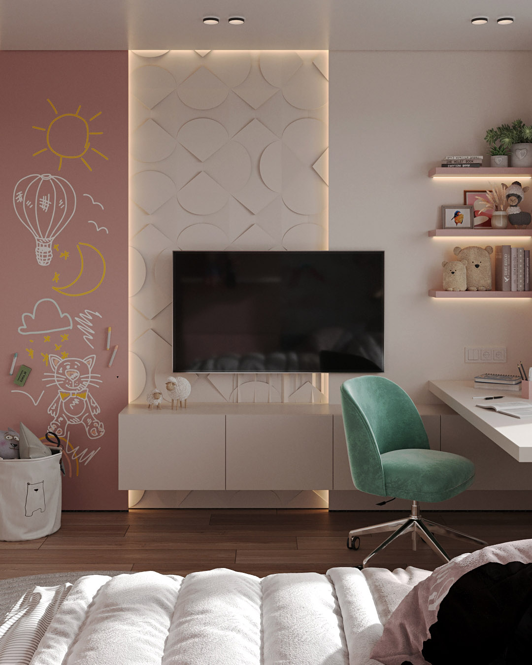 Детская комната площадью 15,5 м² для девочки 6 лет. Планировка в данном проекте получилась очень удобной и функциональной. При этом удалось сохранить достаточно пространства в комнате. Обои из коллекции Fauna замечательно дополнили и преобразовали пространство в зоне кровати. Так, в частном доме общей площадью 150 м² в городе Витебск Республика Беларусь маленькая девочка в скором времени обзаведется своим уютным и стильным интерьером.