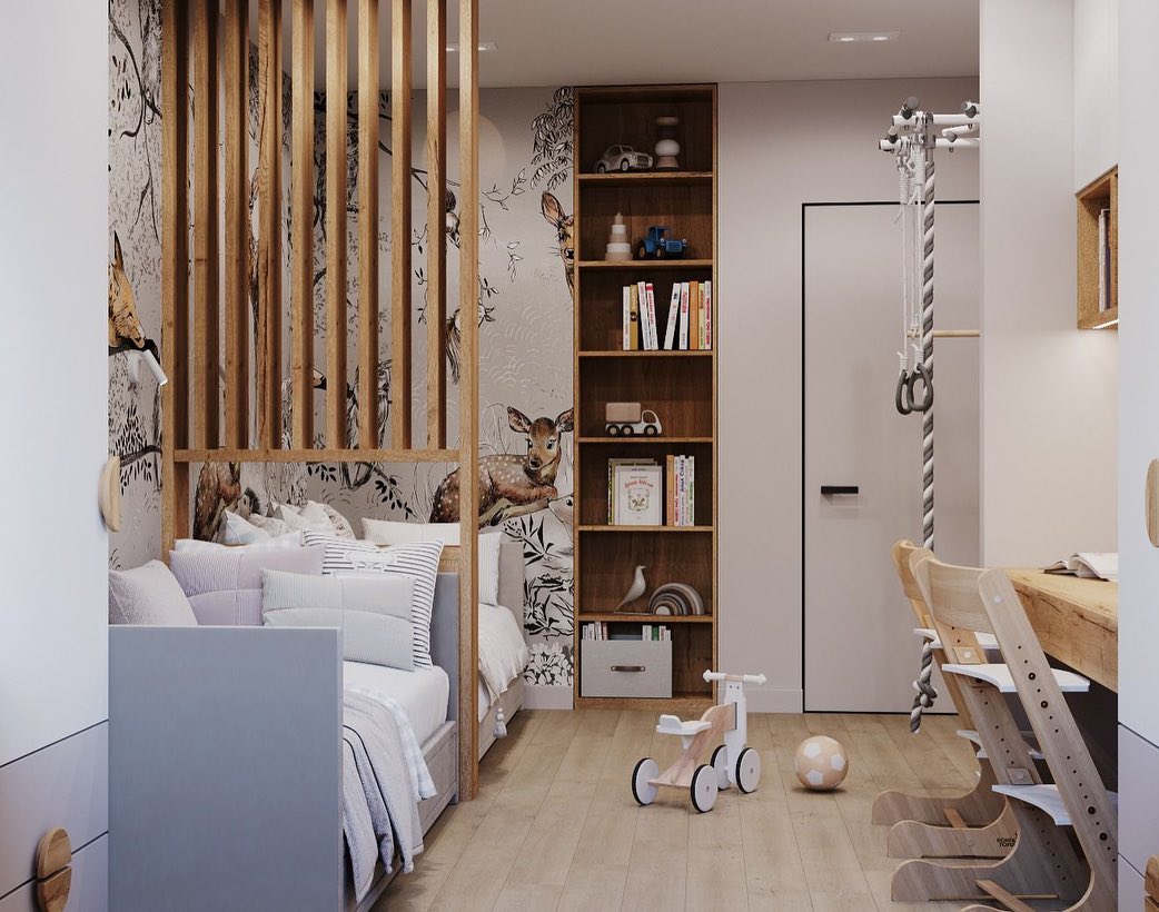 Детская комната для двух малышей-двойняшек. Обои из коллекции FERMA. Благодаря уютному сюжету и спокойным пастельным тонам дизайнеры коллекции превратят детскую в настоящий сказочный мир, который хочется разглядывать и развивать воображение!