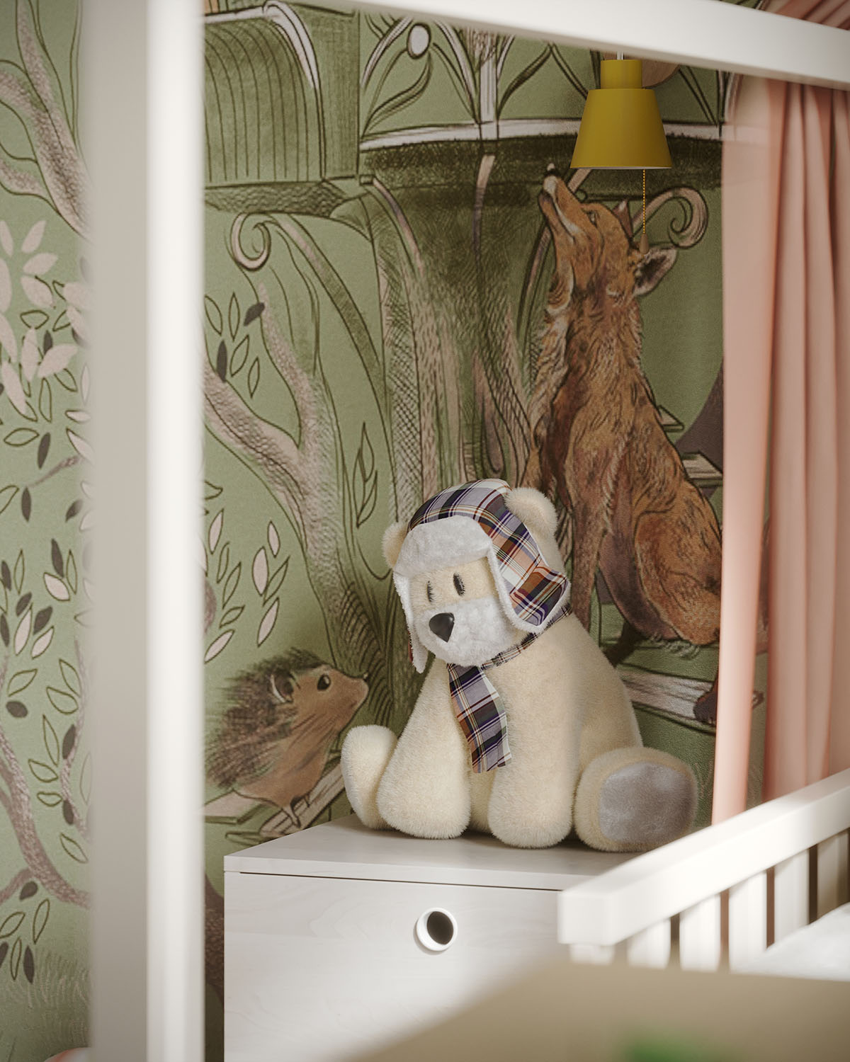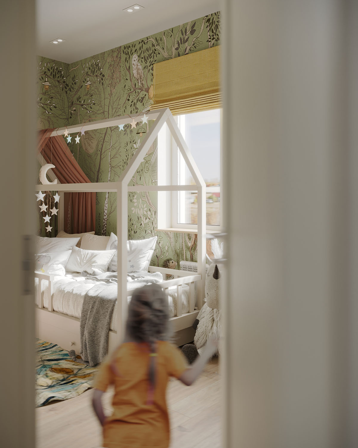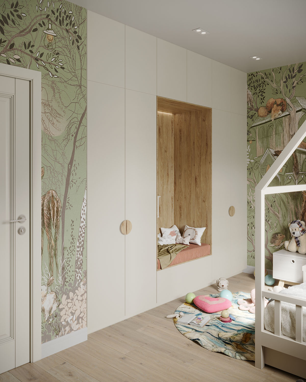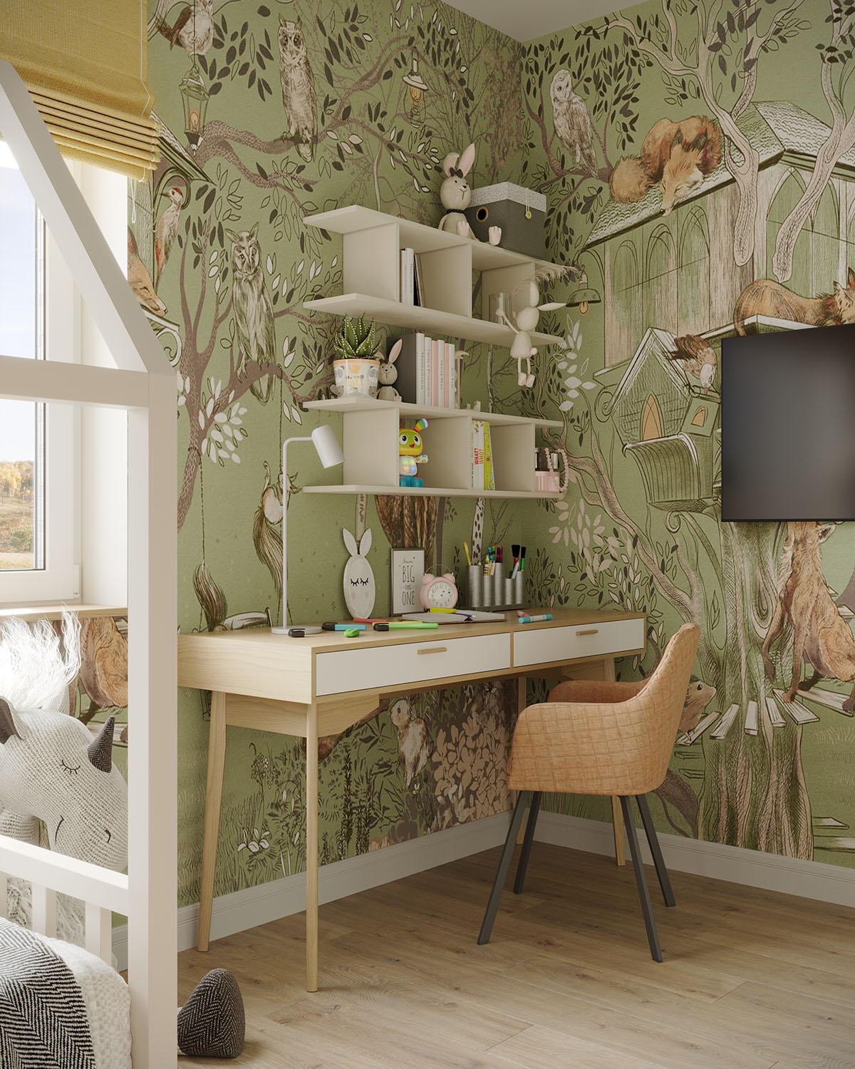 Комната для трехлетней девочки, которая еще верит в сказки и деда Мороза, поэтому обои выбирали «сказочные». Планировка комнаты выполнена таким образом, чтобы в будущем была возможность организовать рабочее место.