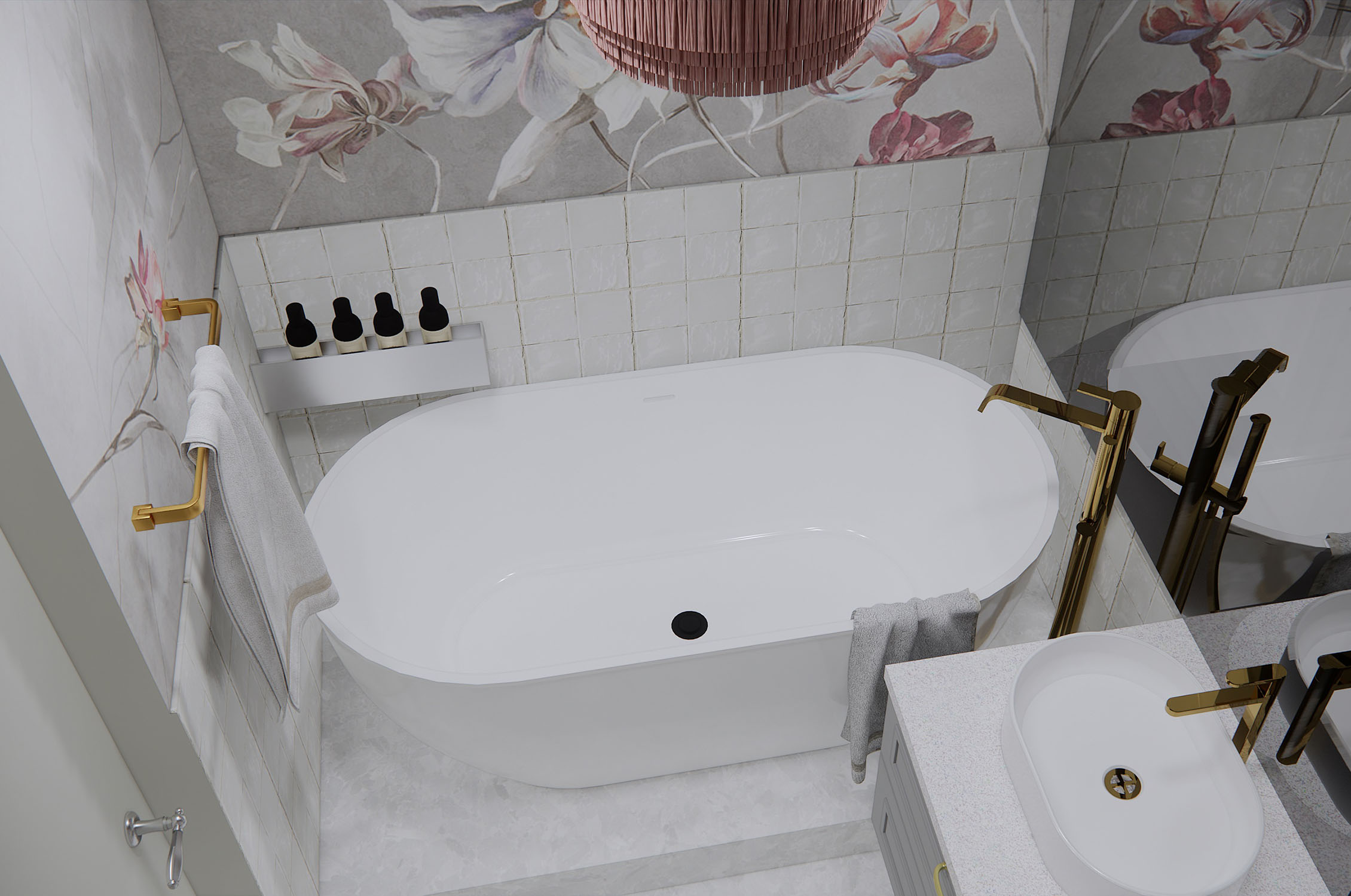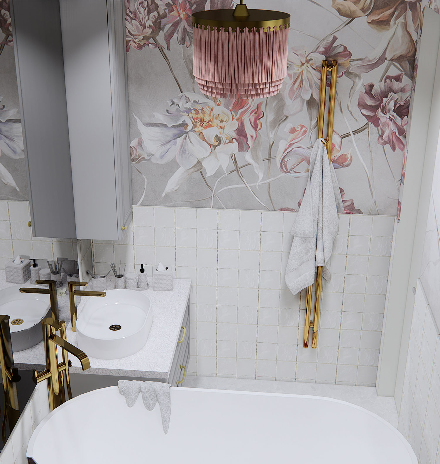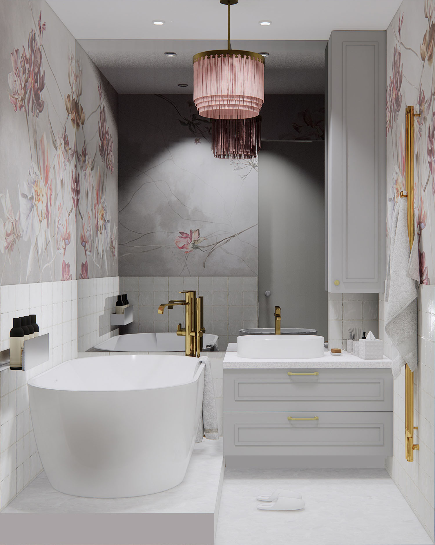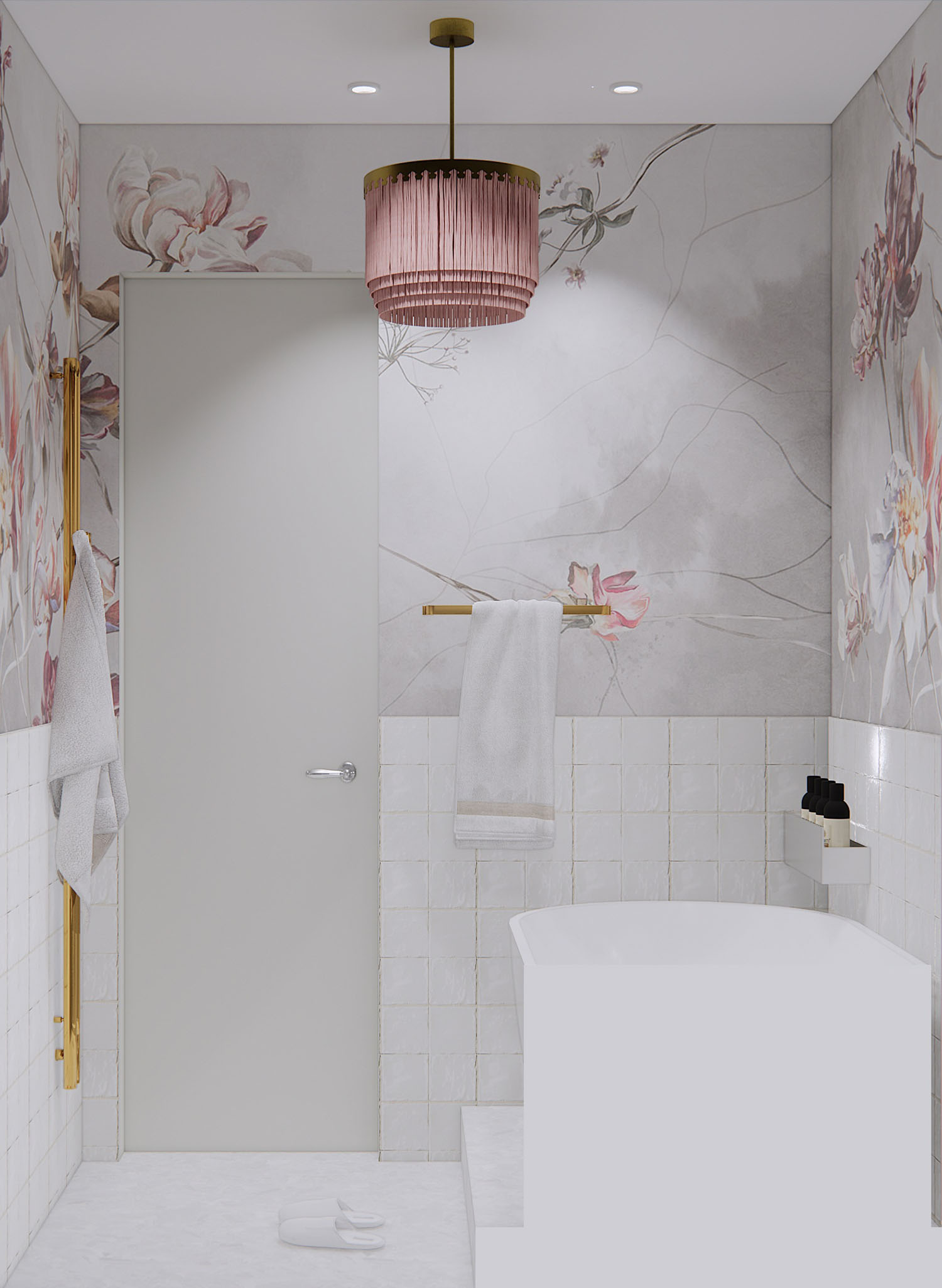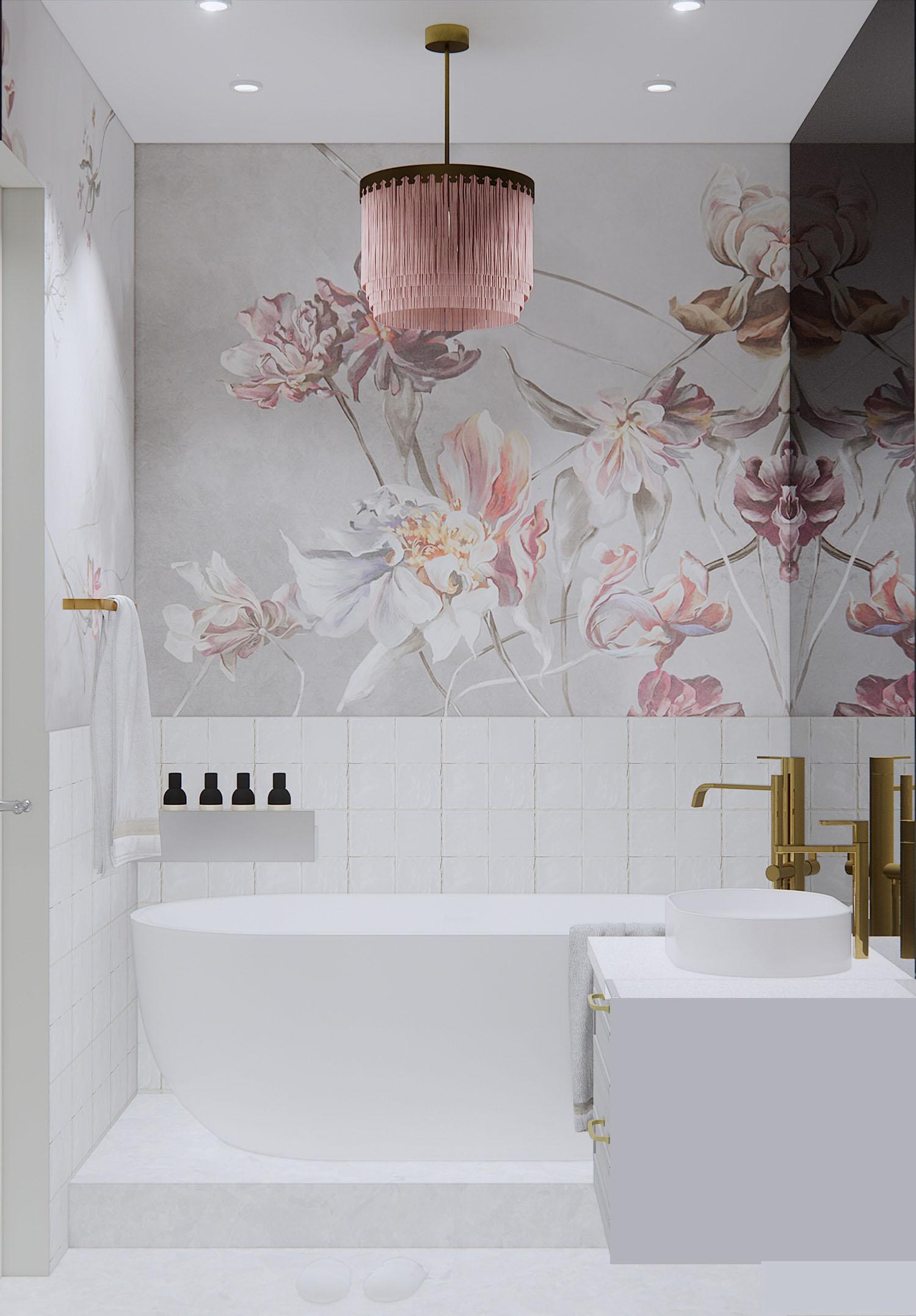 Ванная при спальне. Обои из коллекции FLOREAL 24, главная тема которой — цветение. Цветочные композиции, созданные акриловыми и масляными красками, переведены в масштаб фрески таким образом, чтобы был виден каждый нюанс, каждый изгиб лепестка.