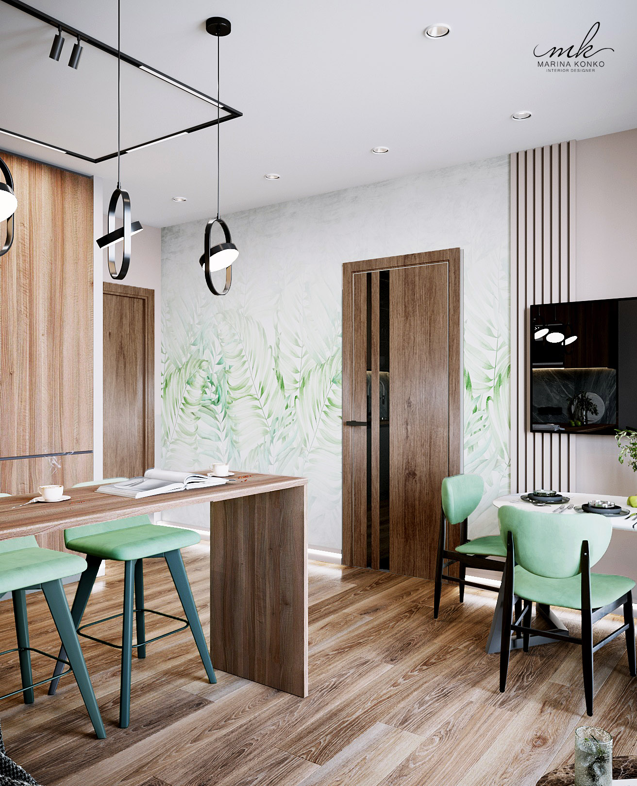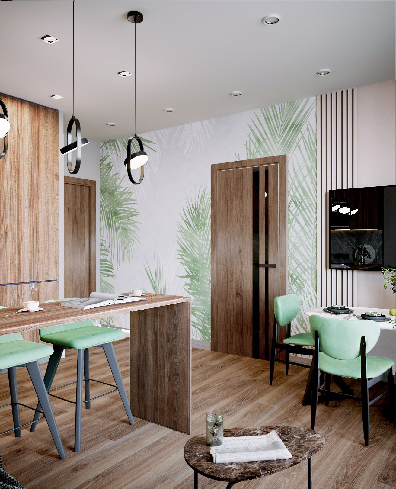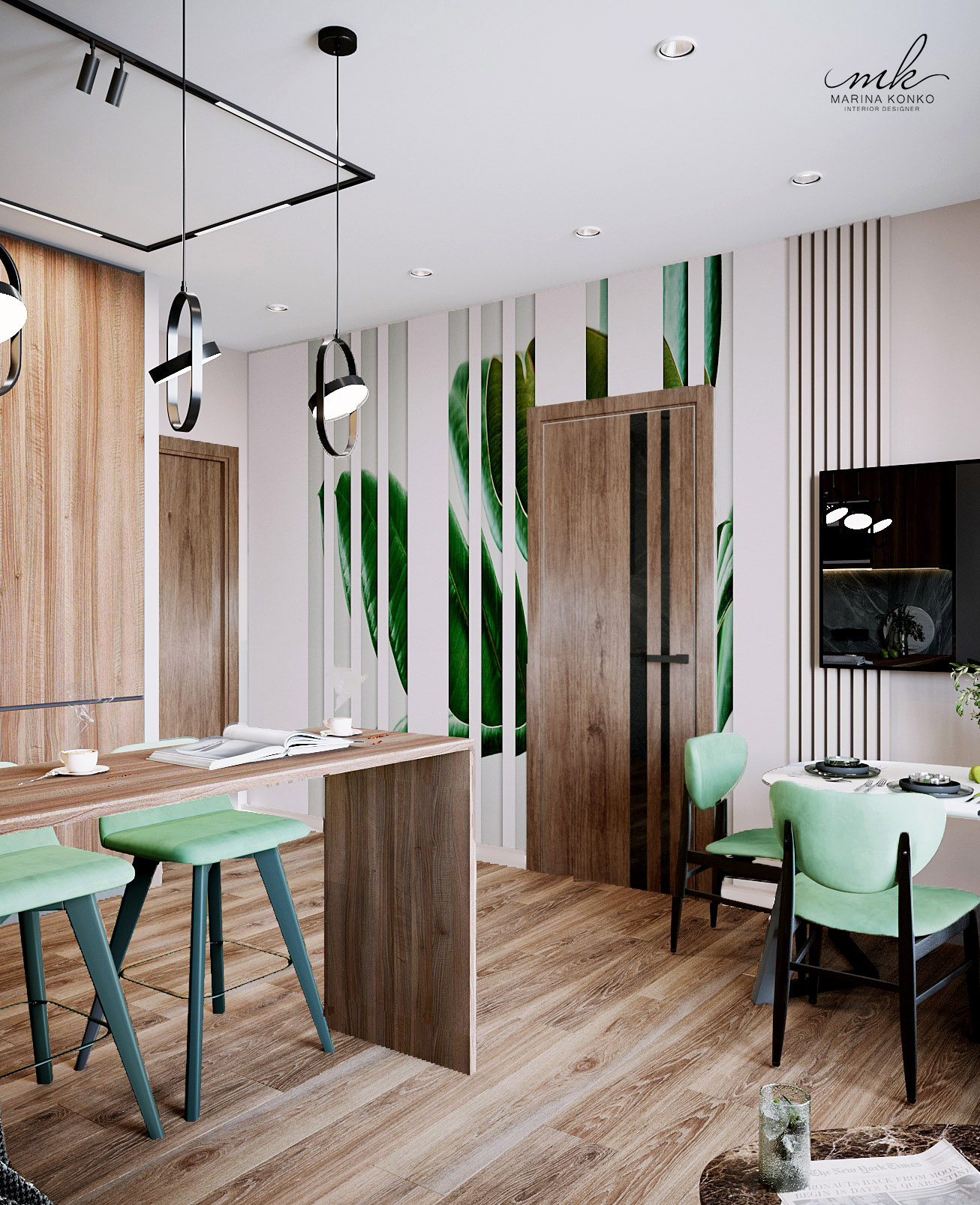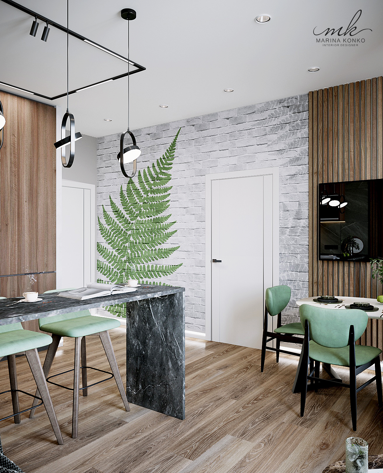 Проект квартиры общей площадью 70 м² для молодой семьи, ЖК «Белые ночи», город Москва. Главным предпочтением заказчиков было: интерьер с использованием природных материалов — камня, дерева, зелени и, конечно же, грамотное зонирование. Кухня-гостиная-прихожая сделана в стилистике леса с разными вариантами оформления.
