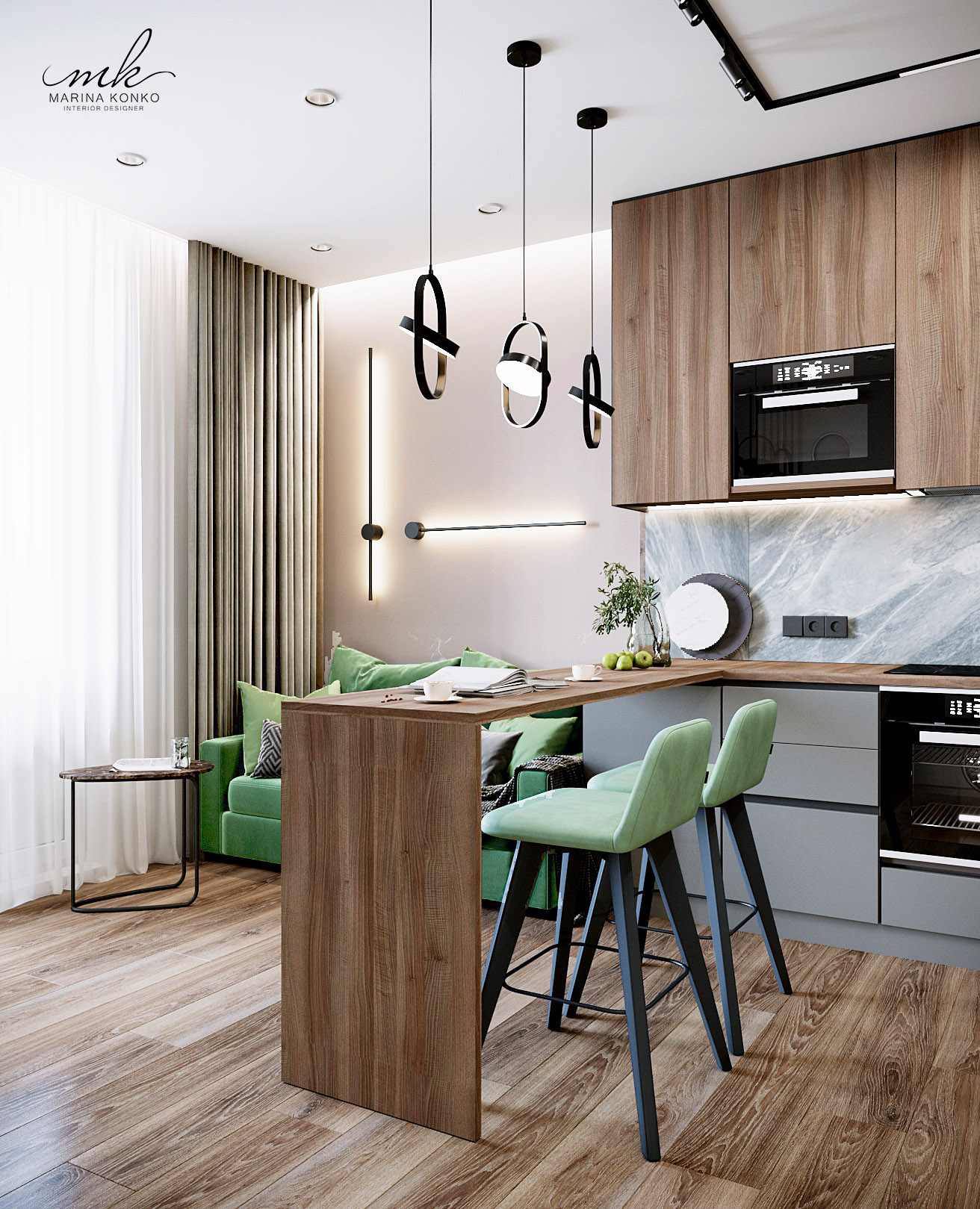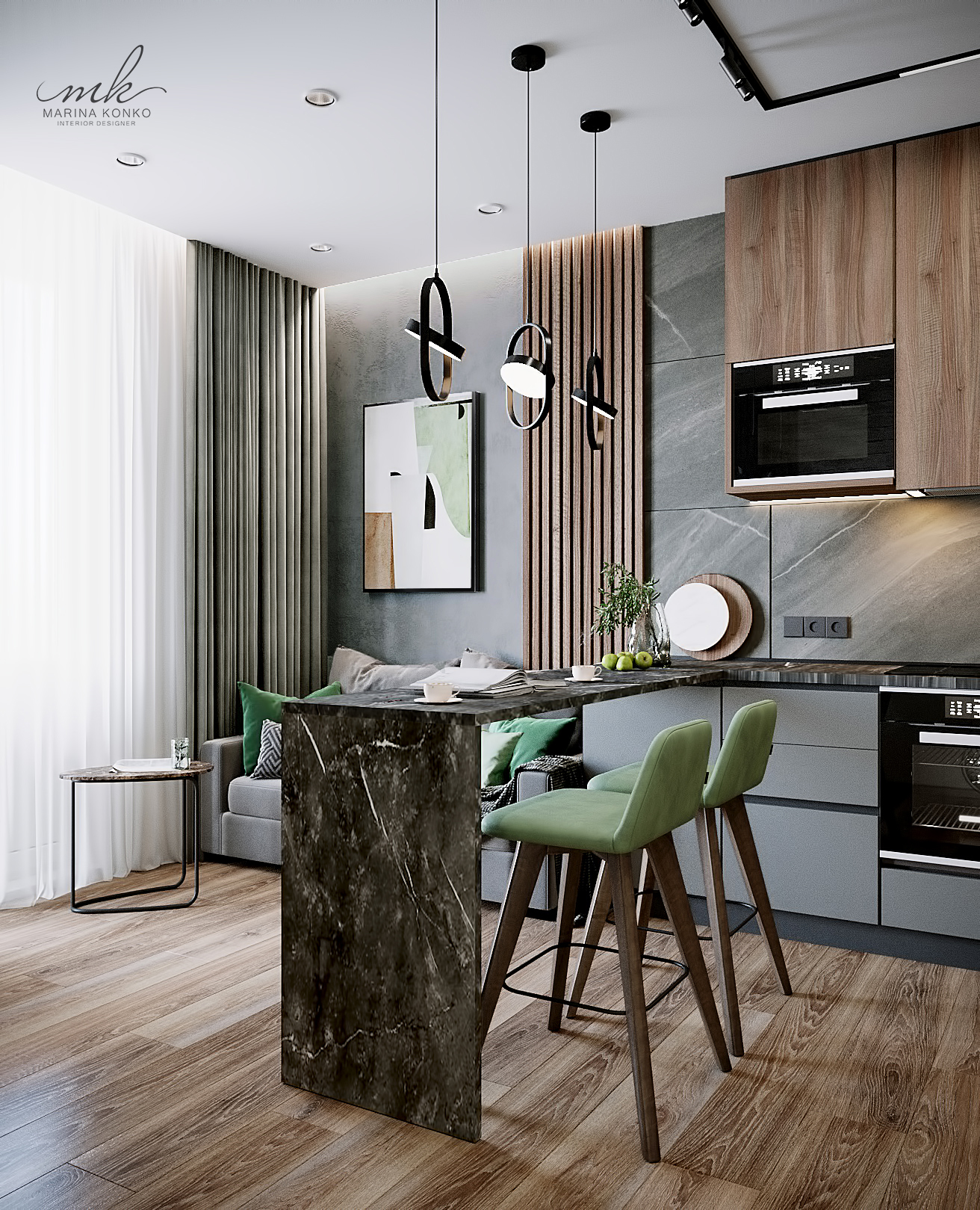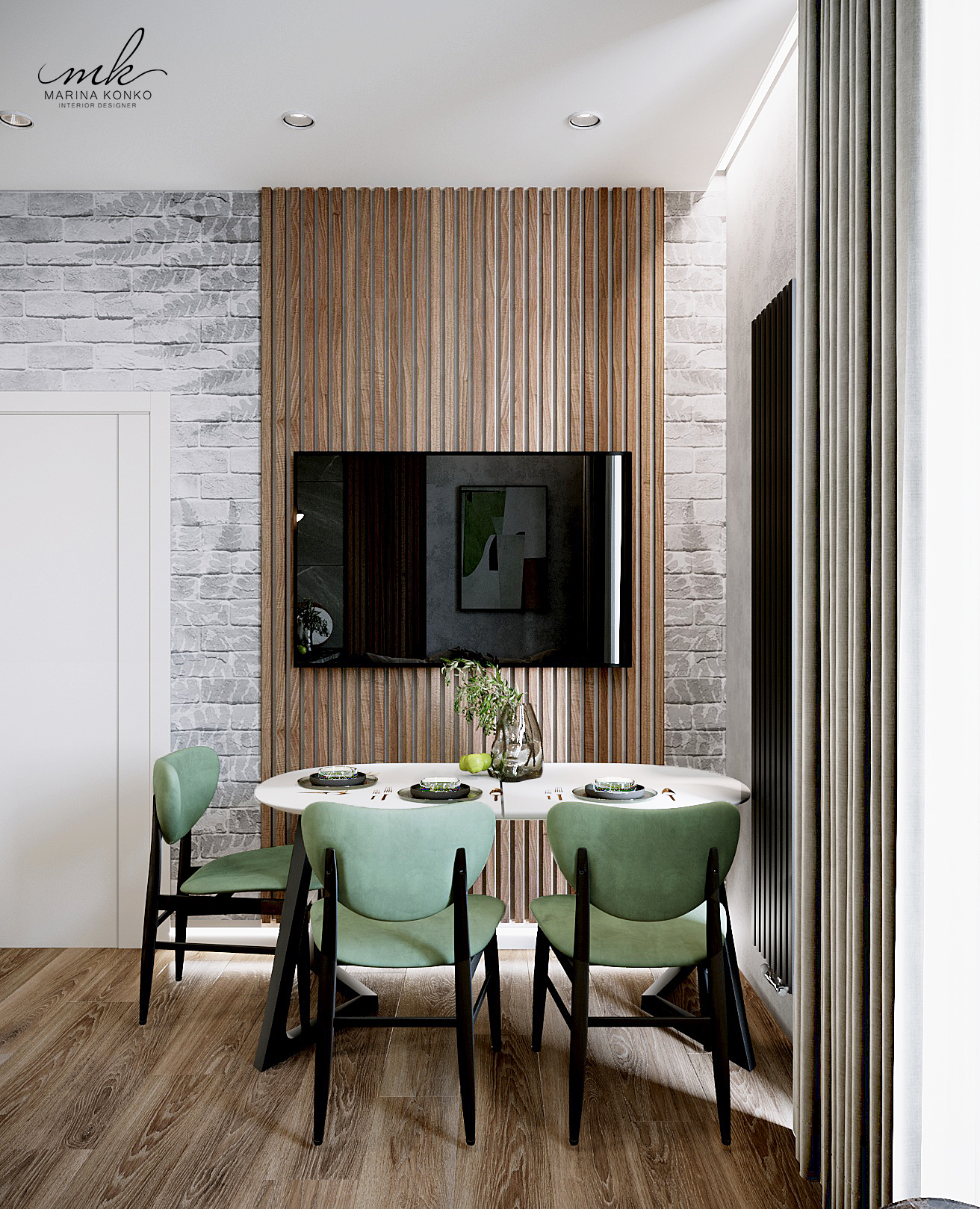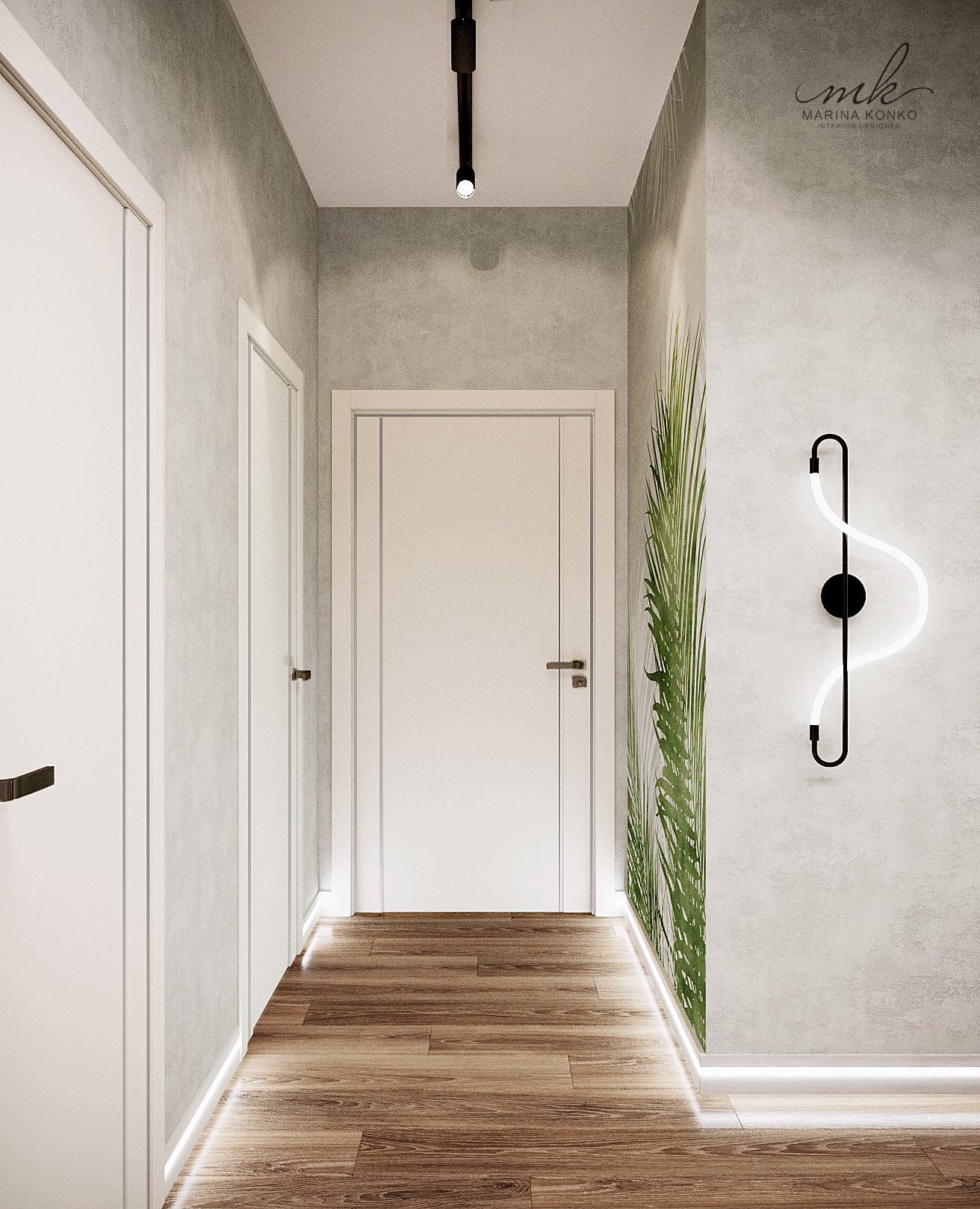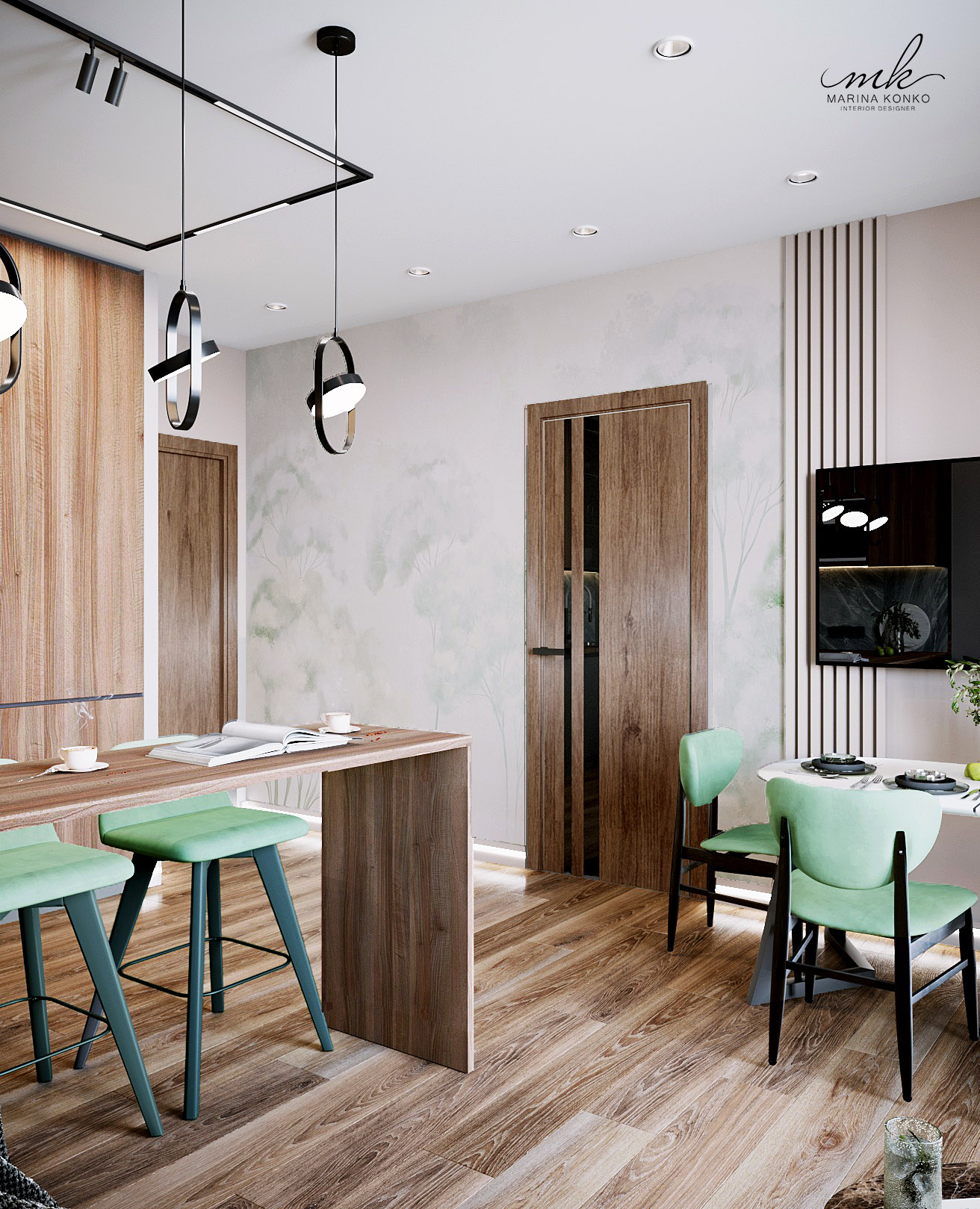 Проект квартиры общей площадью 70 м² для молодой семьи, ЖК «Белые ночи», город Москва. Главным предпочтением заказчиков было: интерьер с использованием природных материалов — камня, дерева, зелени и, конечно же, грамотное зонирование. Кухня-гостиная-прихожая сделана в стилистике леса с разными вариантами оформления.