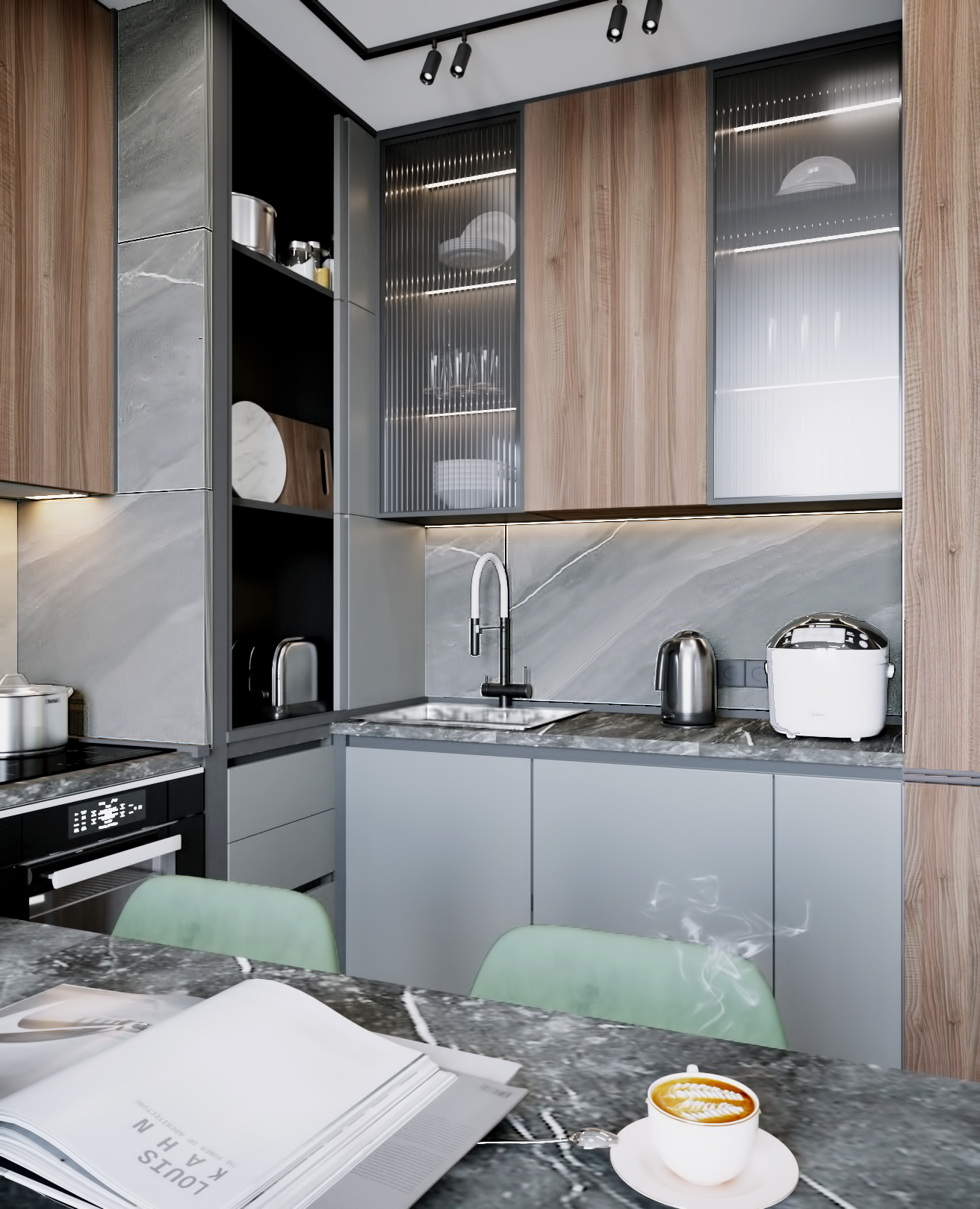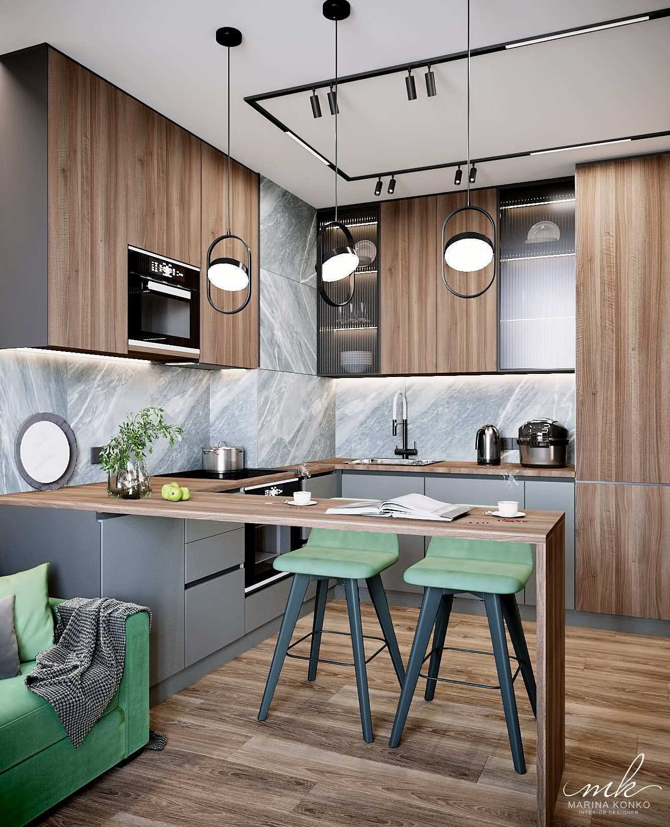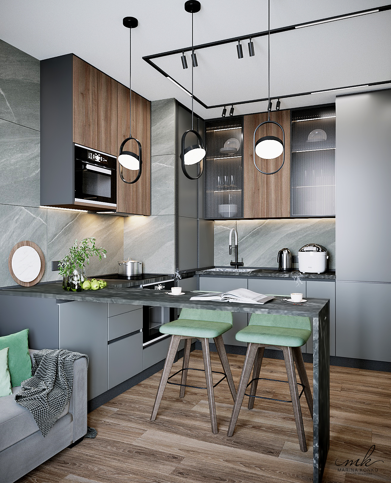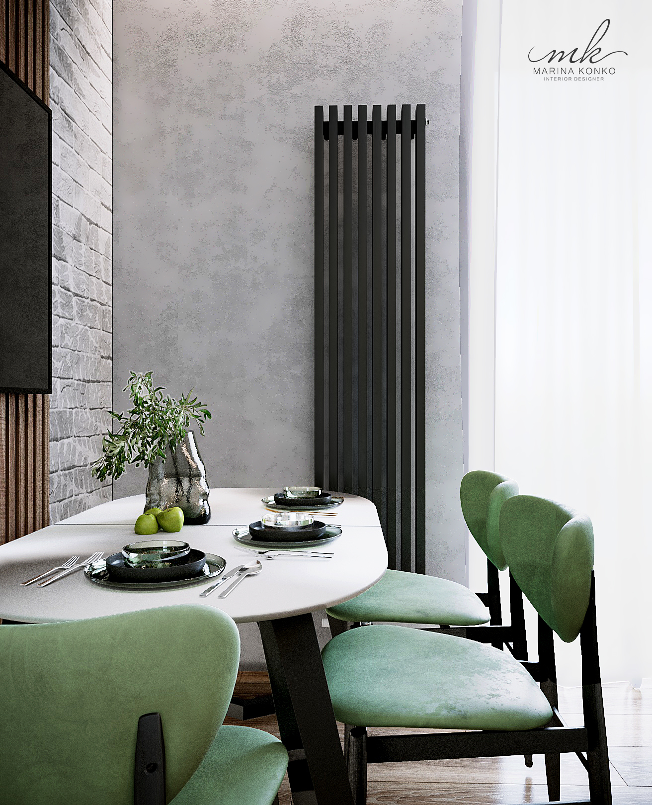 Проект квартиры общей площадью 70 м² для молодой семьи, ЖК «Белые ночи», город Москва. Главным предпочтением заказчиков было: интерьер с использованием природных материалов — камня, дерева, зелени и, конечно же, грамотное зонирование. Кухня-гостиная-прихожая сделана в стилистике леса с разными вариантами оформления.